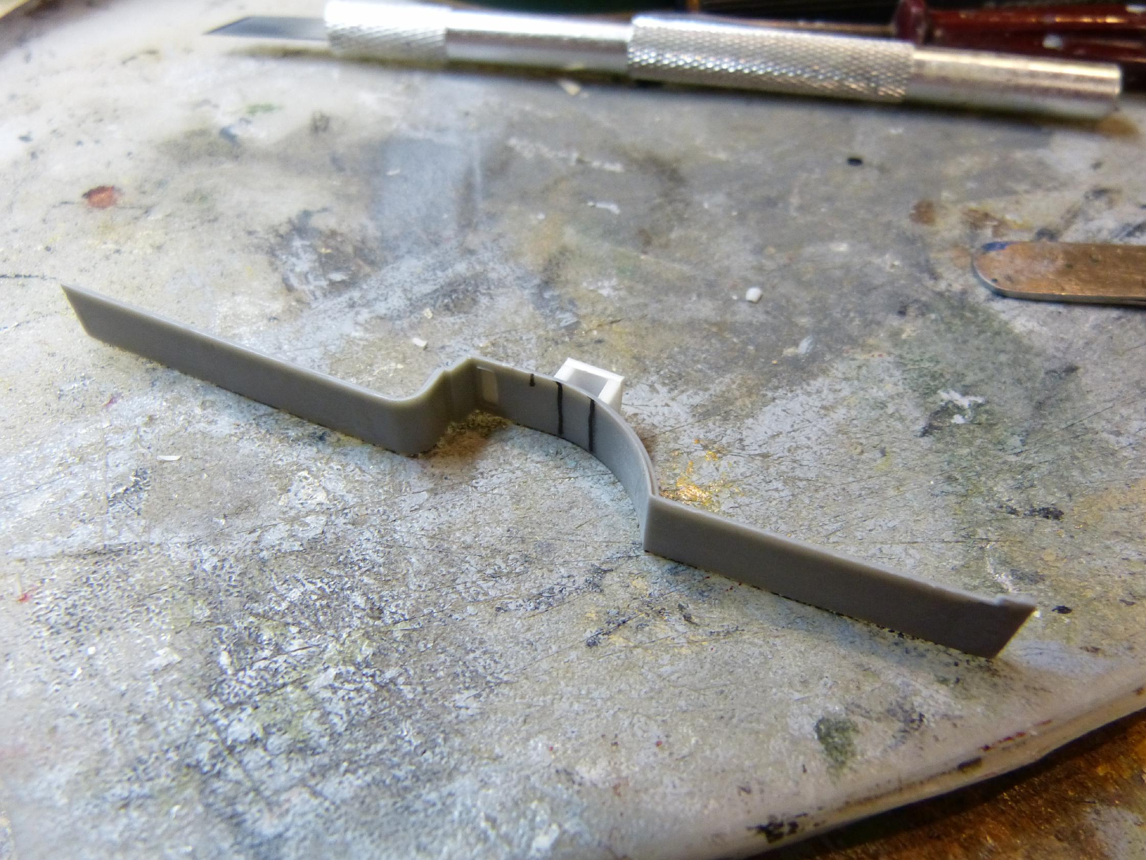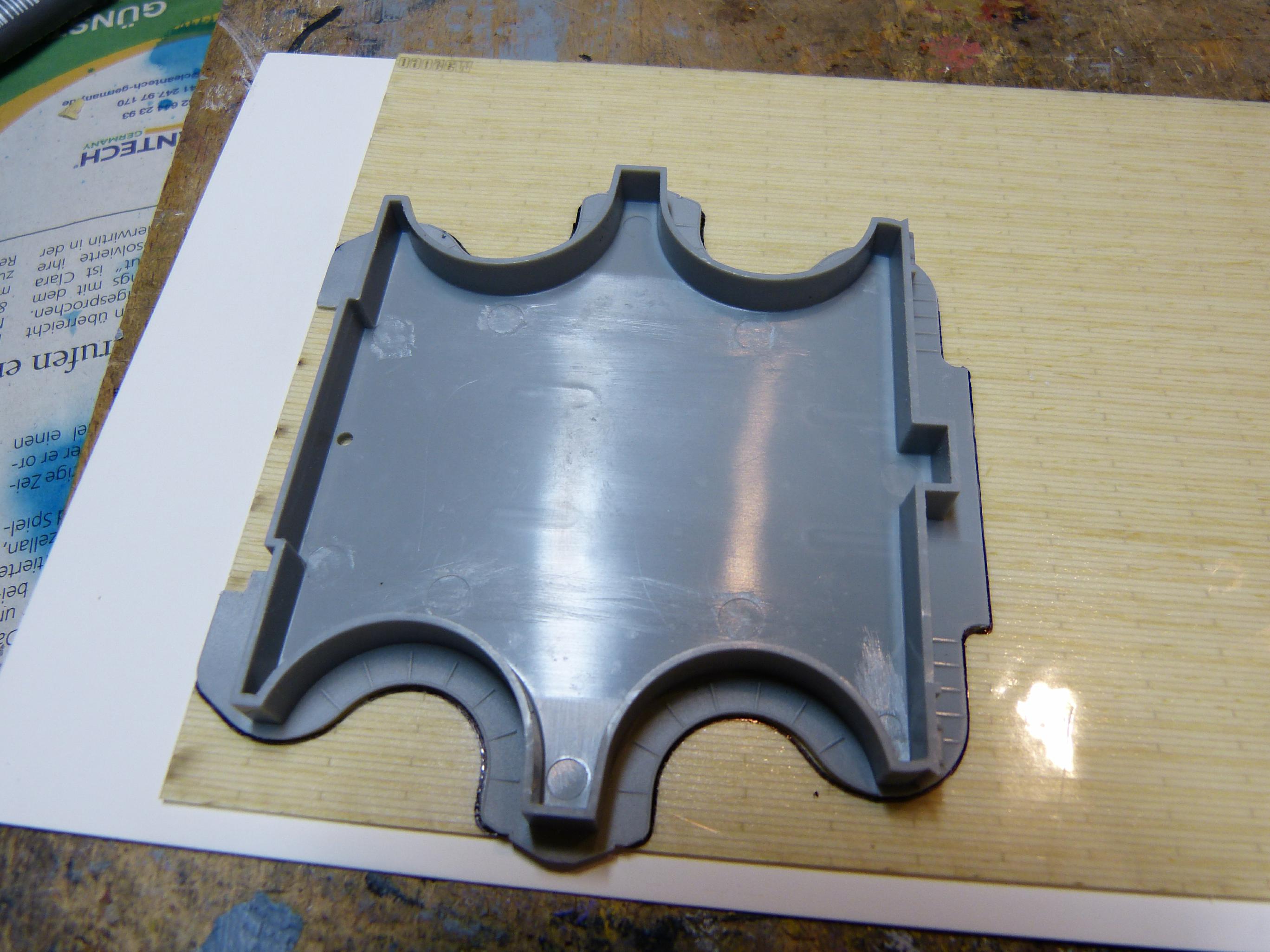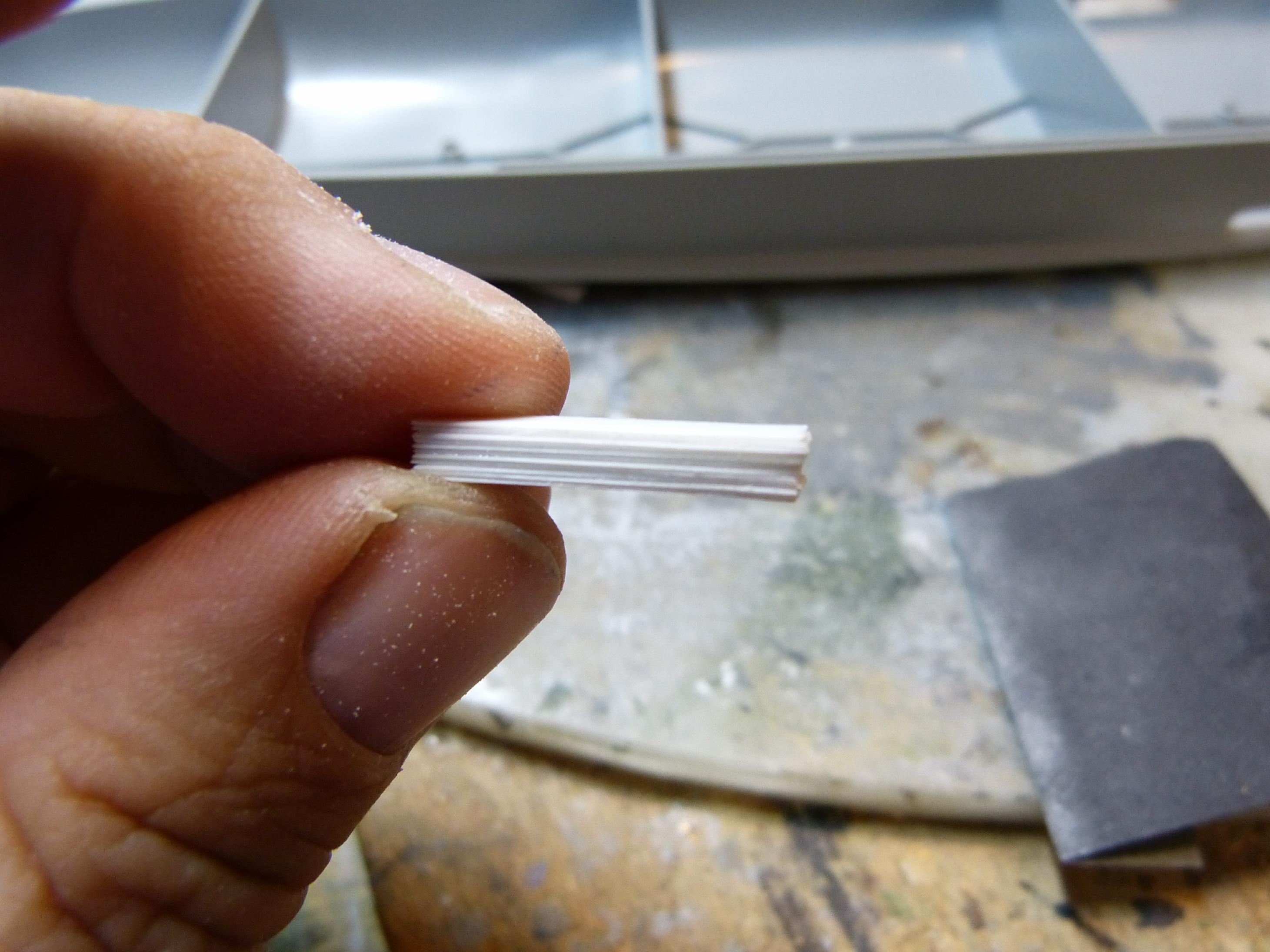 Nun grob Längen dünnen Plastiksheets (0,03 mm) zurechtgeschnitten, dabei jeweils eine lange Seite konisch angeschliffen (wie bei einem Messer). Dann übereinander geklebt und auf die passende Aussparung im Rumpf zurechtgeschnitten.