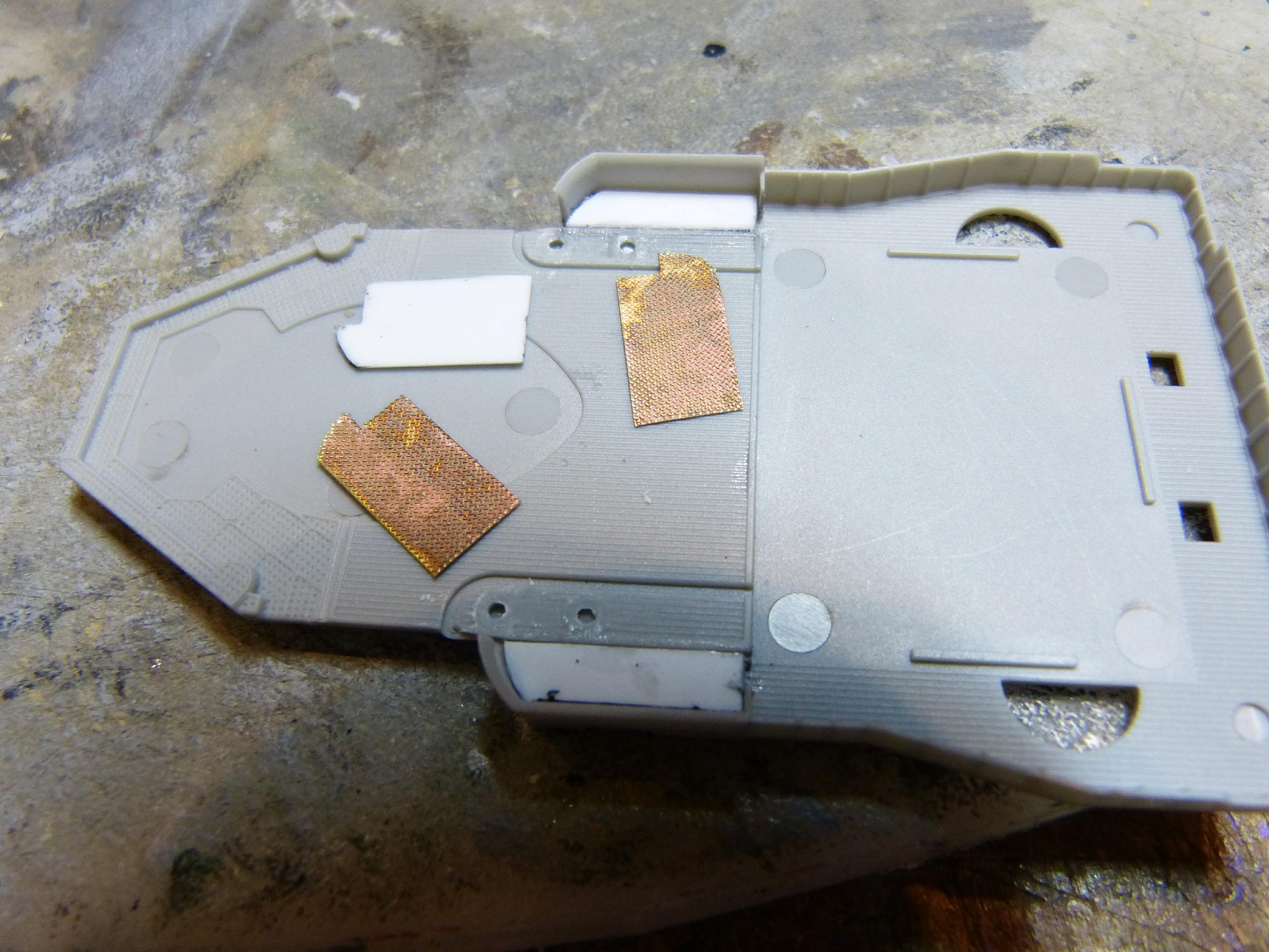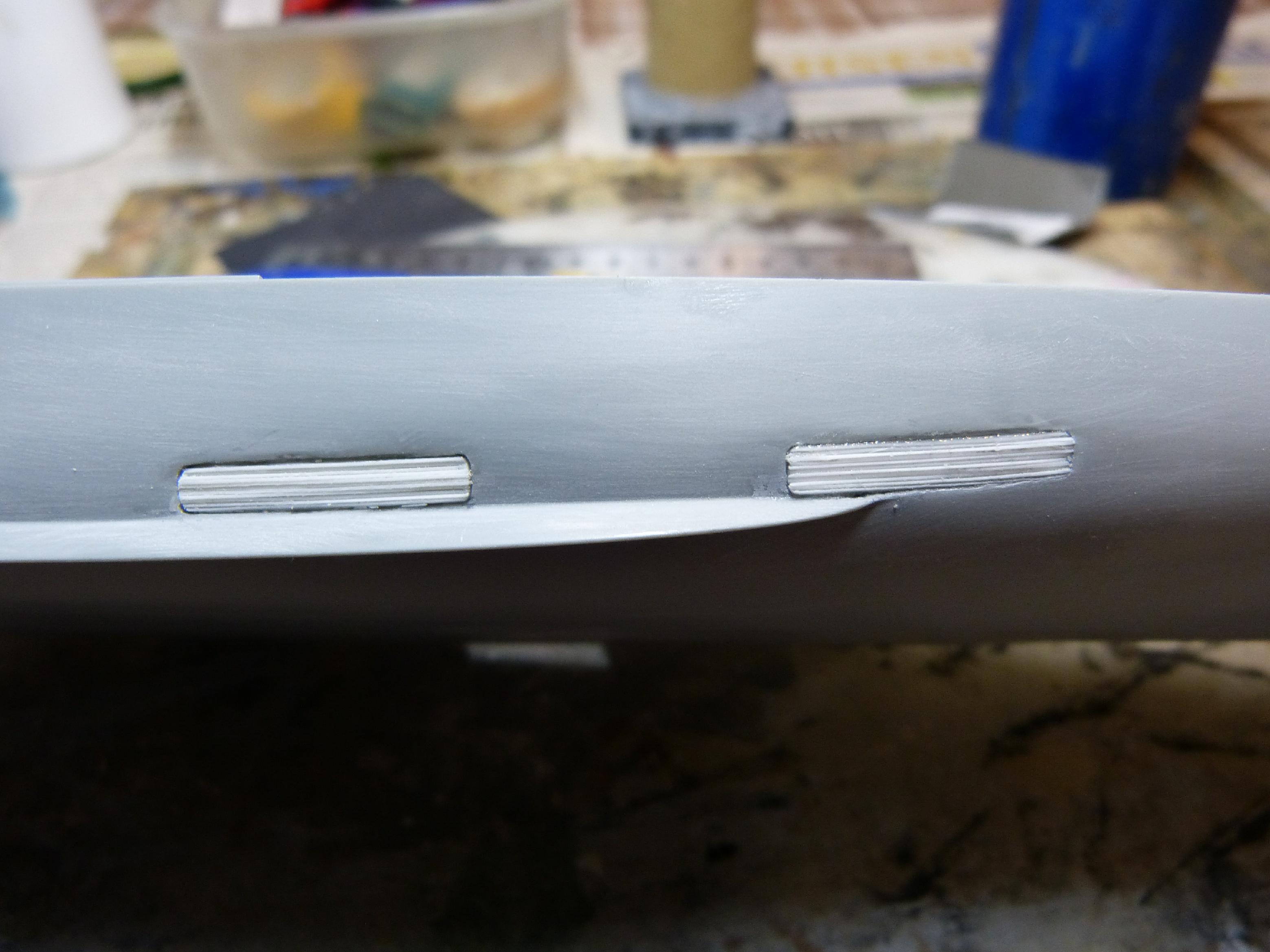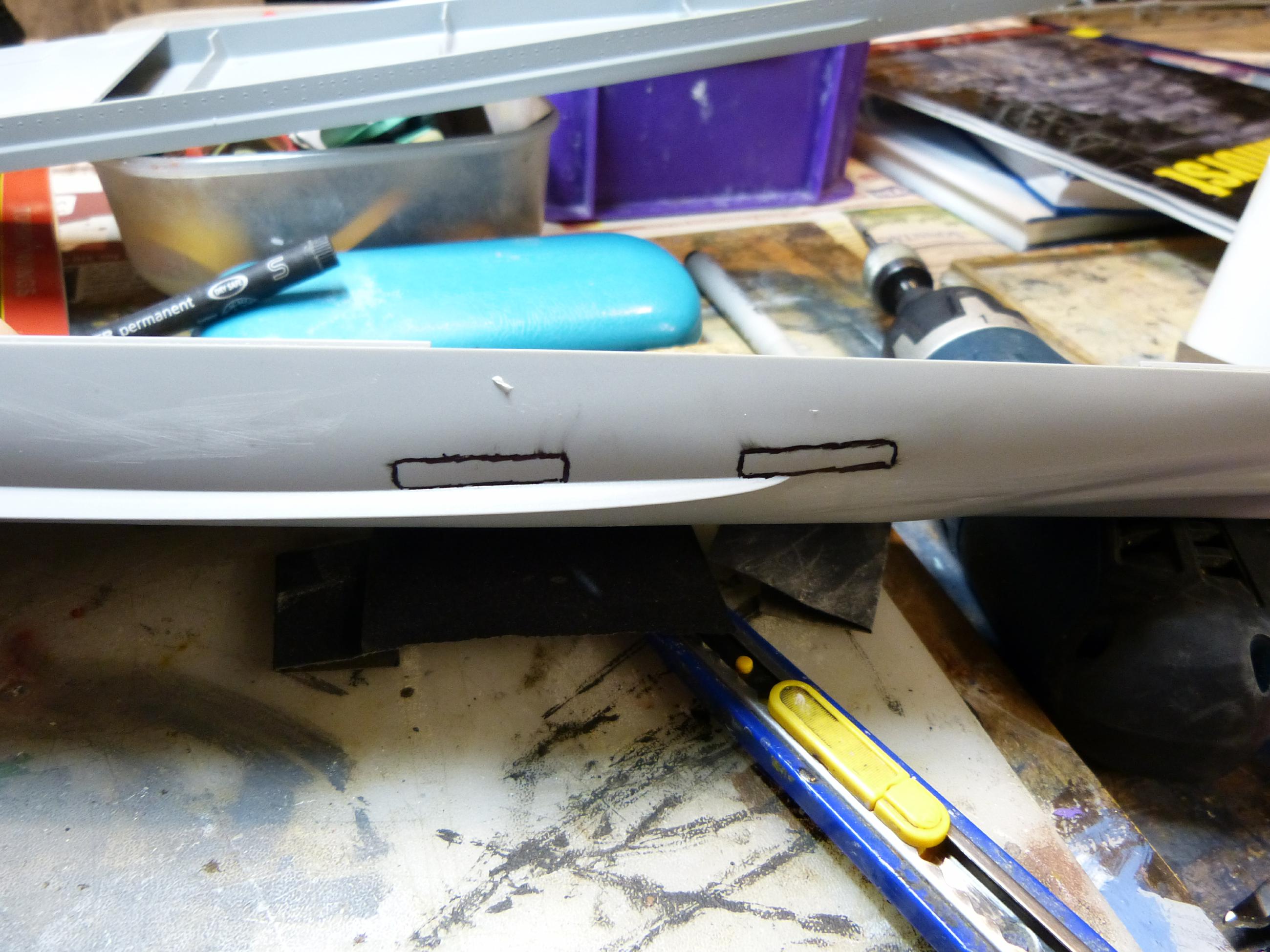 Nun grob Längen dünnen Plastiksheets (0,03 mm) zurechtgeschnitten, dabei jeweils eine lange Seite konisch angeschliffen (wie bei einem Messer). Dann übereinander geklebt und auf die passende Aussparung im Rumpf zurechtgeschnitten.
