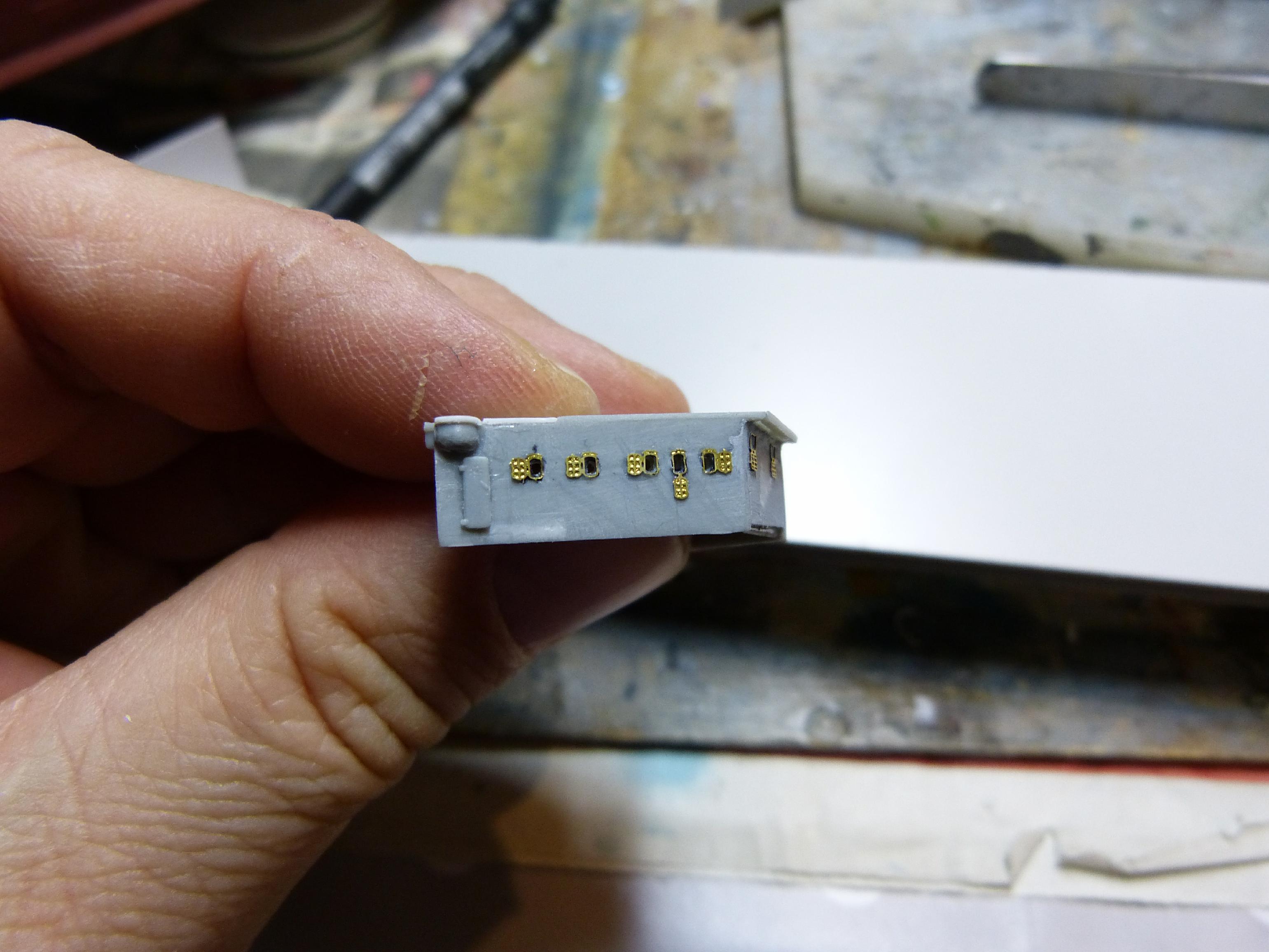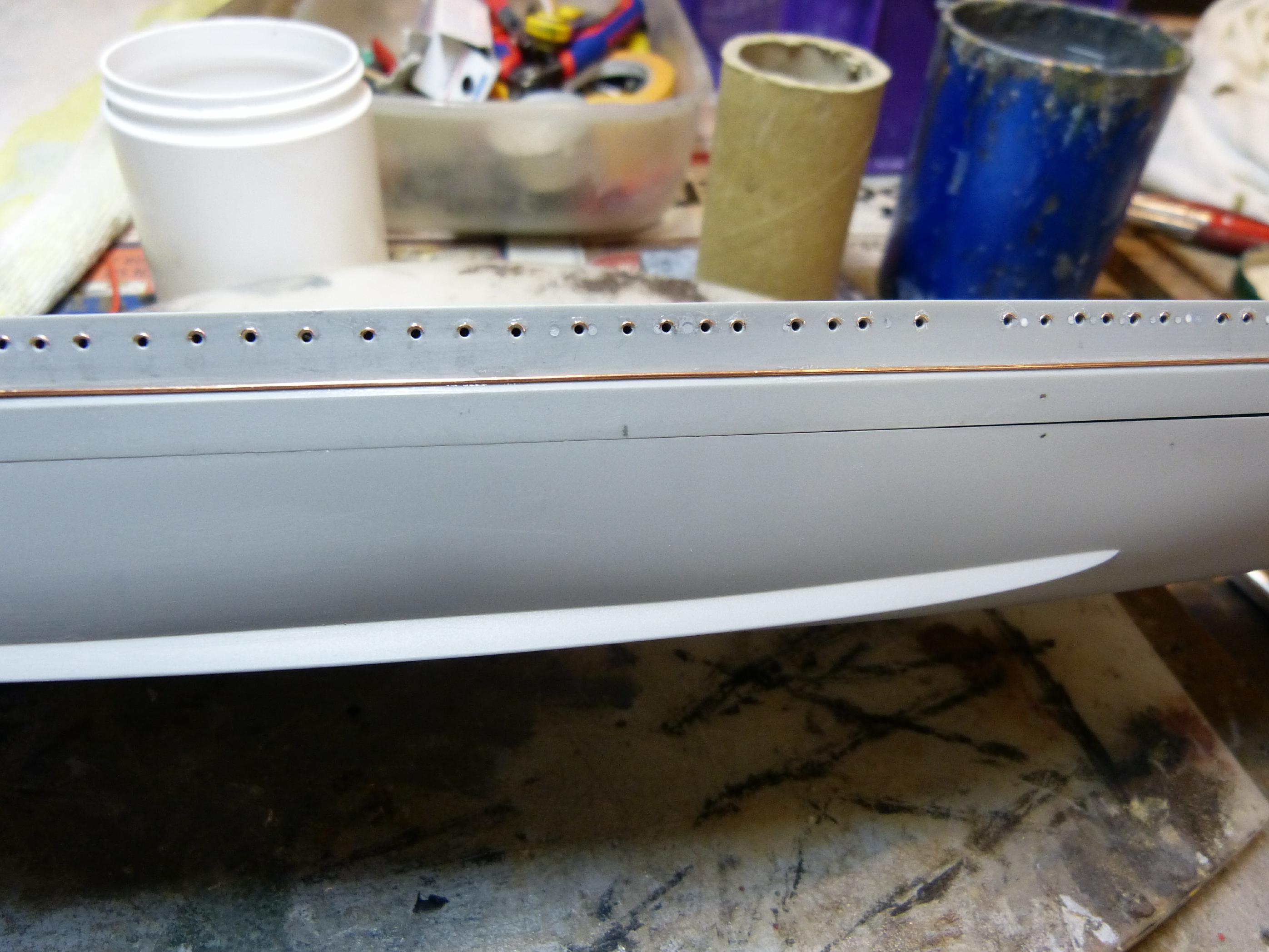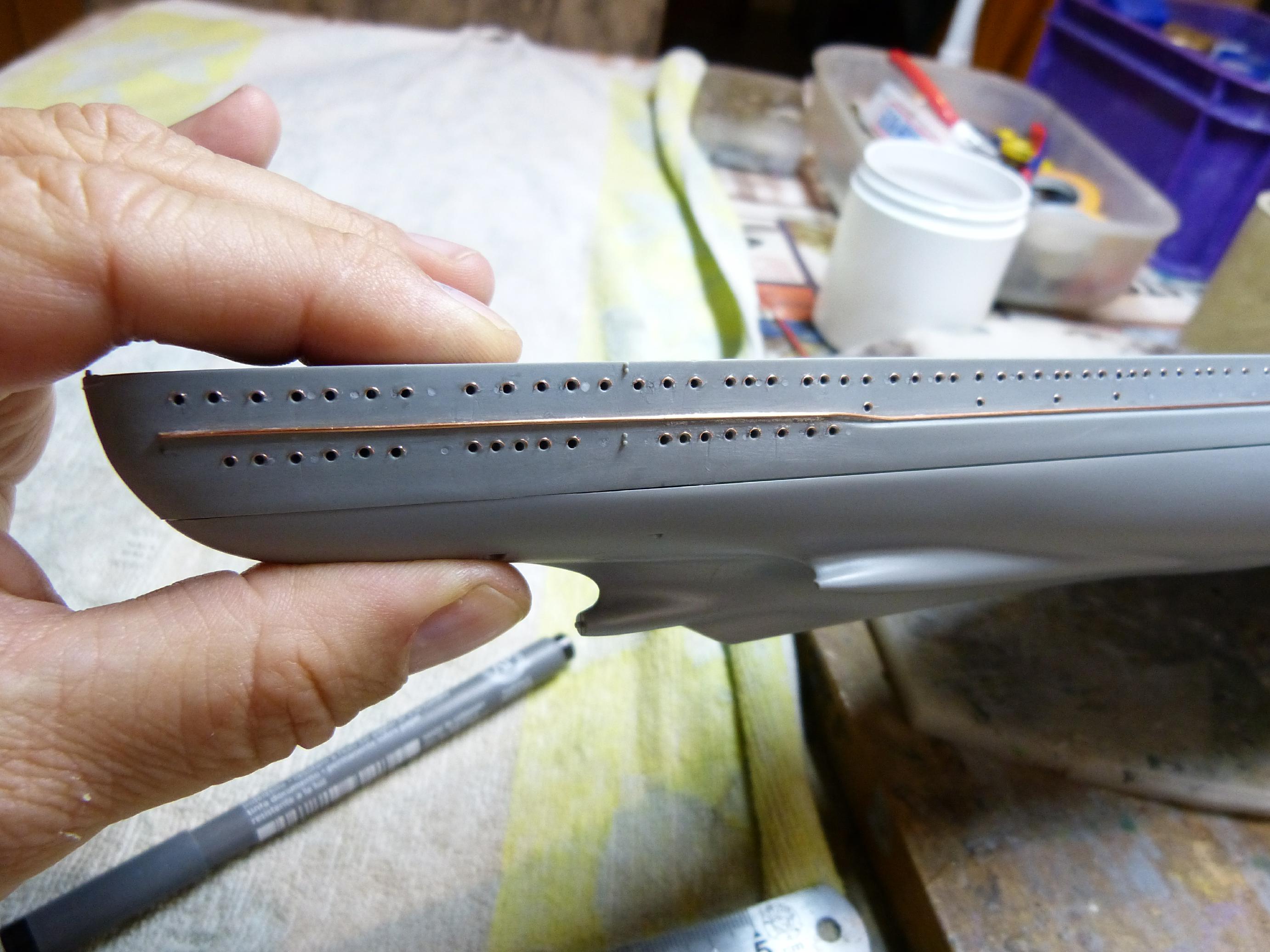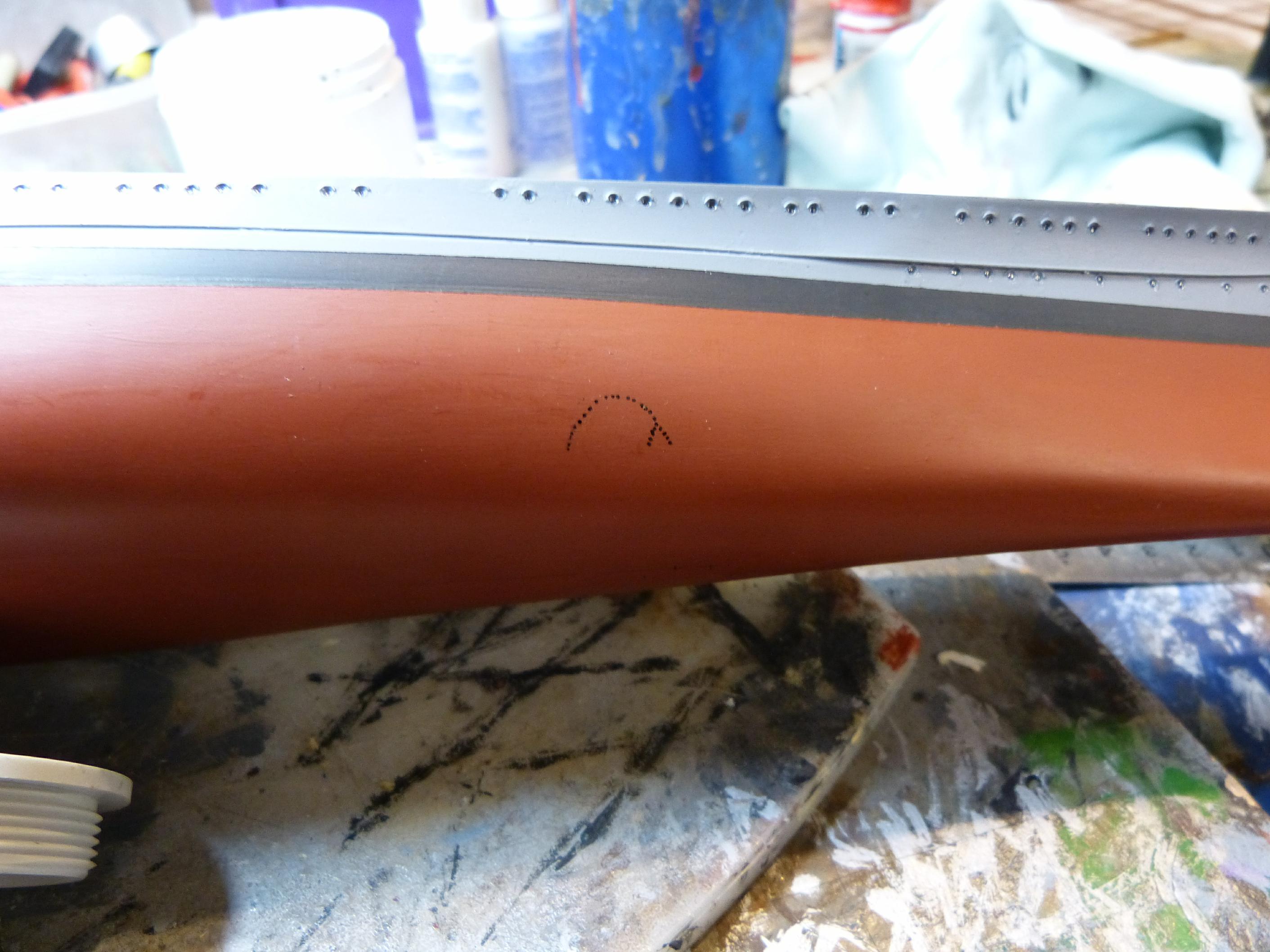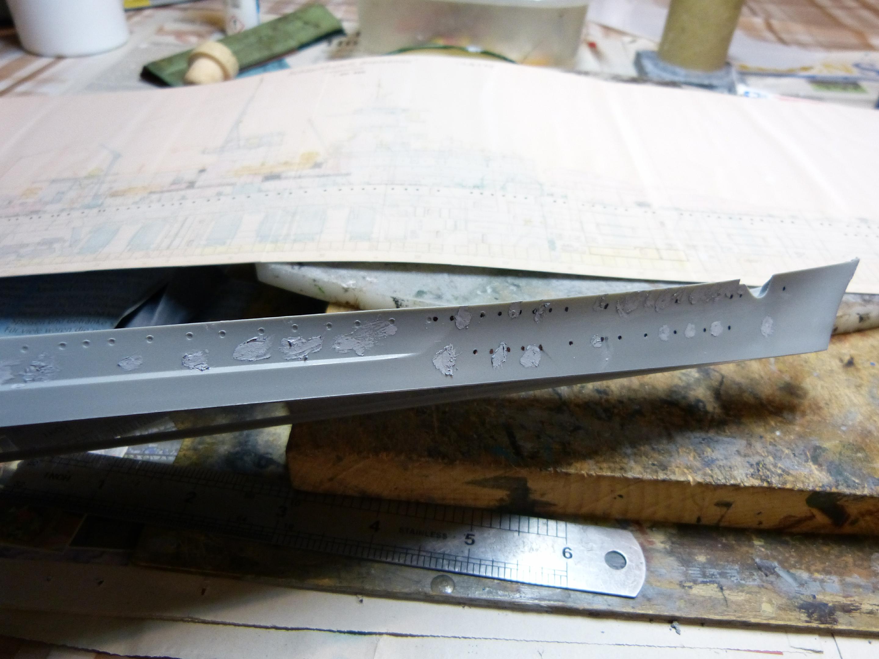 Danach widmete ich mich dem Thema Bullaugen. Hier gab es viel Änderungsbedarf. Zunächst druckte ich mir aus einem Originalseitenriss jeweils einen Plan für Steuerbord und (spiegelverkehrt) für Backbord in 1:350 aus. Auf diesen zeichnete ich dann mit schwarzem Edding alle Bulleyes nach, wobei tatsächlich eindeutig auf dem Originalriss unterschieden wird zwischen beidseitig, nur steuerbord, nur backbord – mühselig aber präzise.