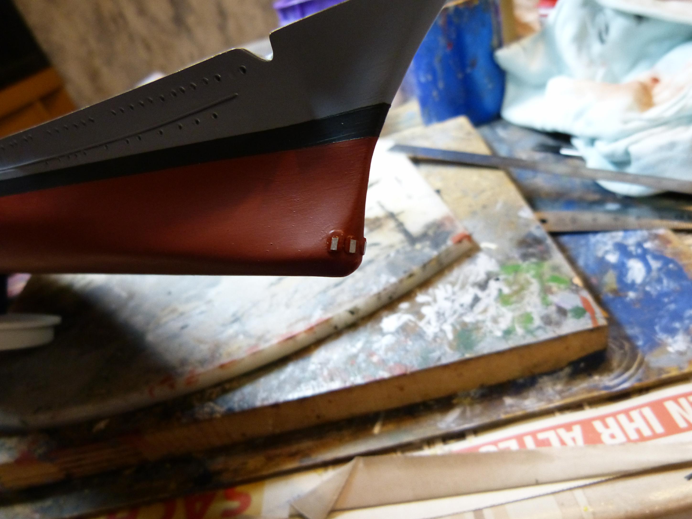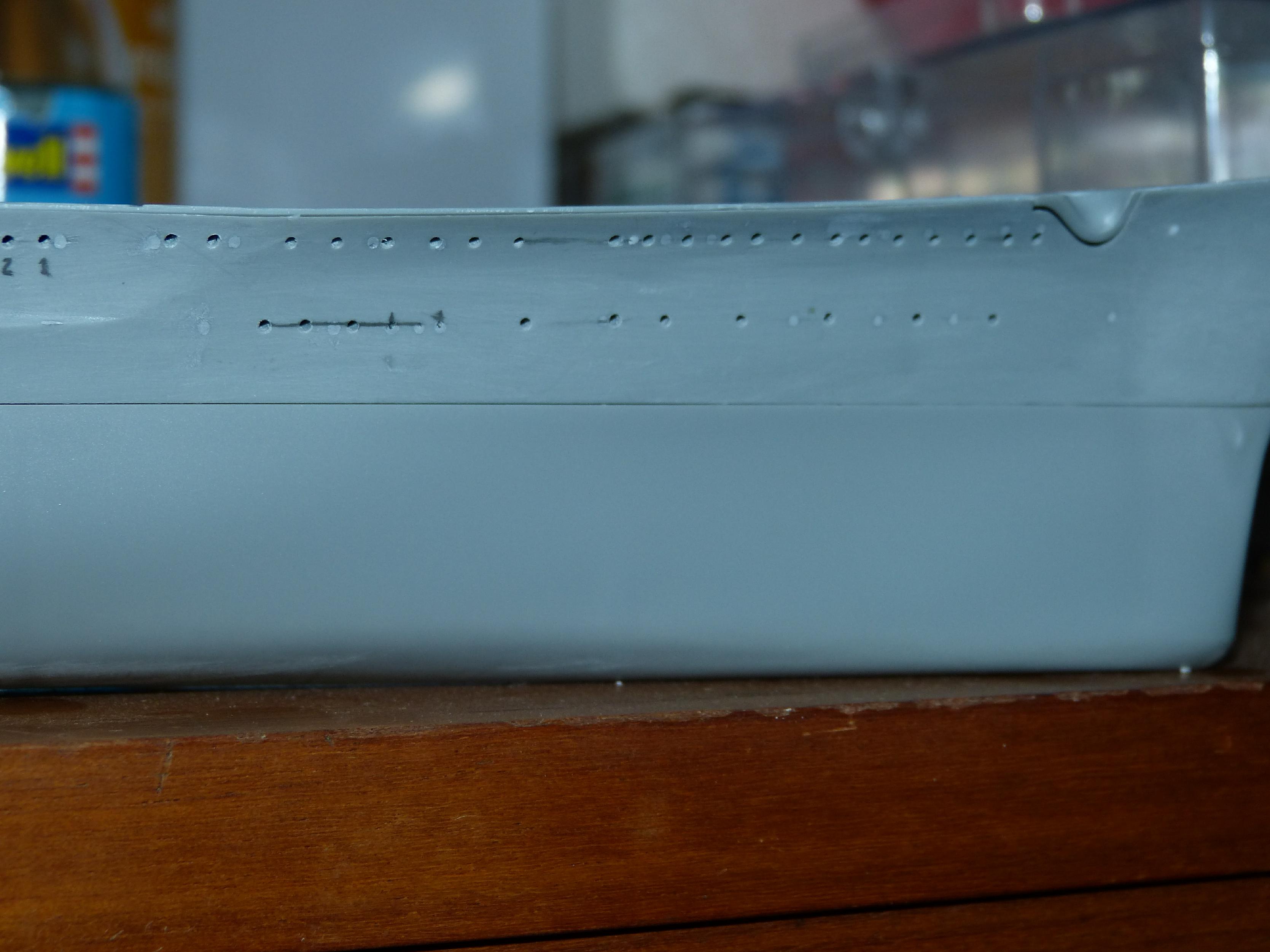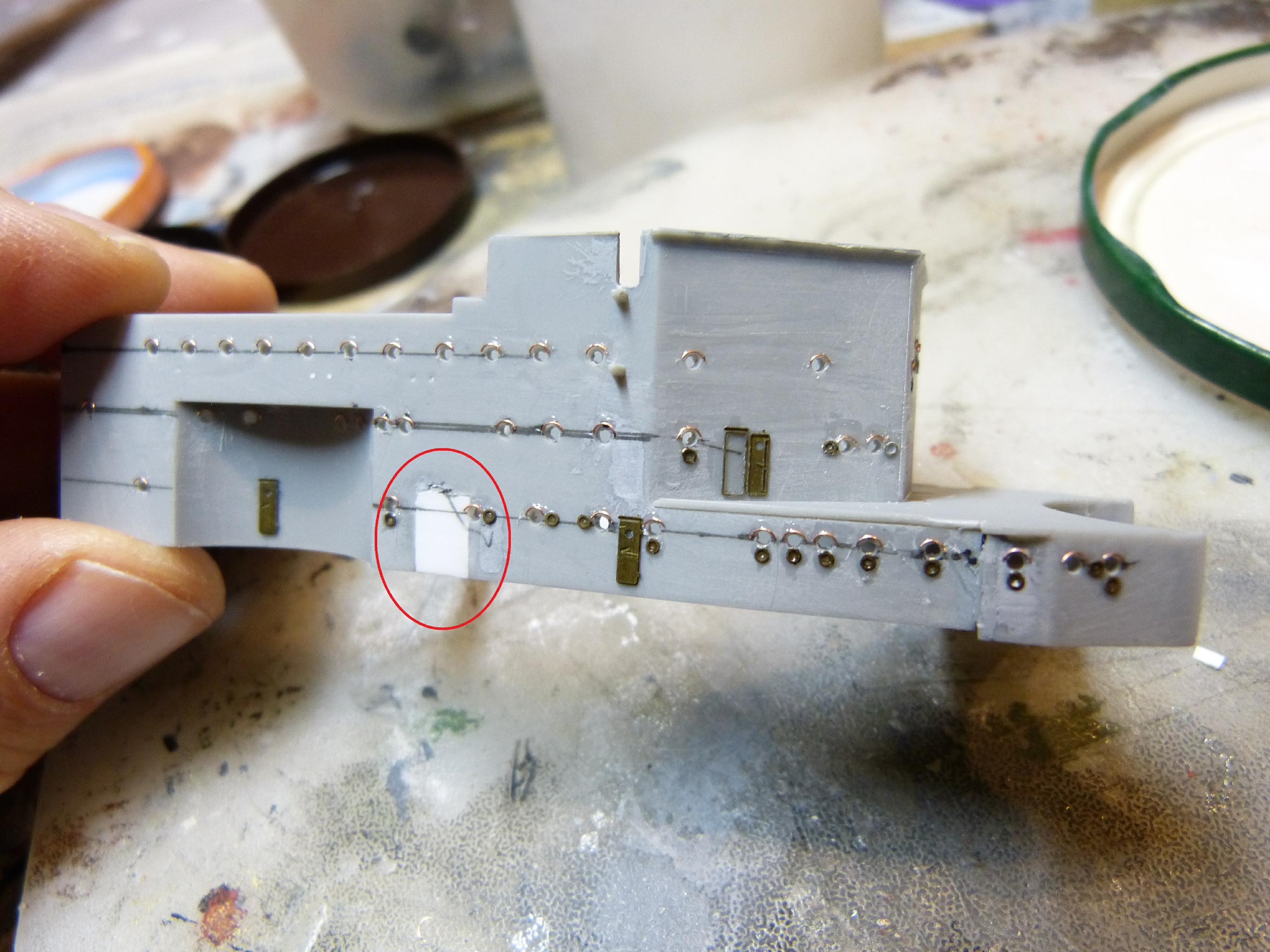 Da es leider dem Dragon-Unterwasserrumpf an jeglichen Details fehlt, habe ich wieder hier angefangen. Unter anderem fehlen ja die drei Turbinen-Kühlwassereinlässe (KWE), die ich schon bei SH improvisiert habe. Da hatte ich allerdings das wunderbare Draminski-Buch als Vorlage. In den Kagero-Büchern sind keinerlei Details an den Unterwasser-Rumpf-Grafiken dargestellt.