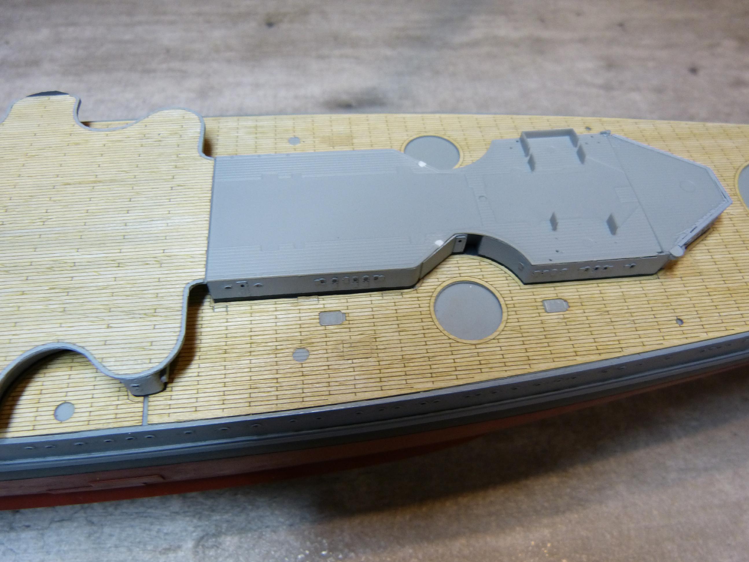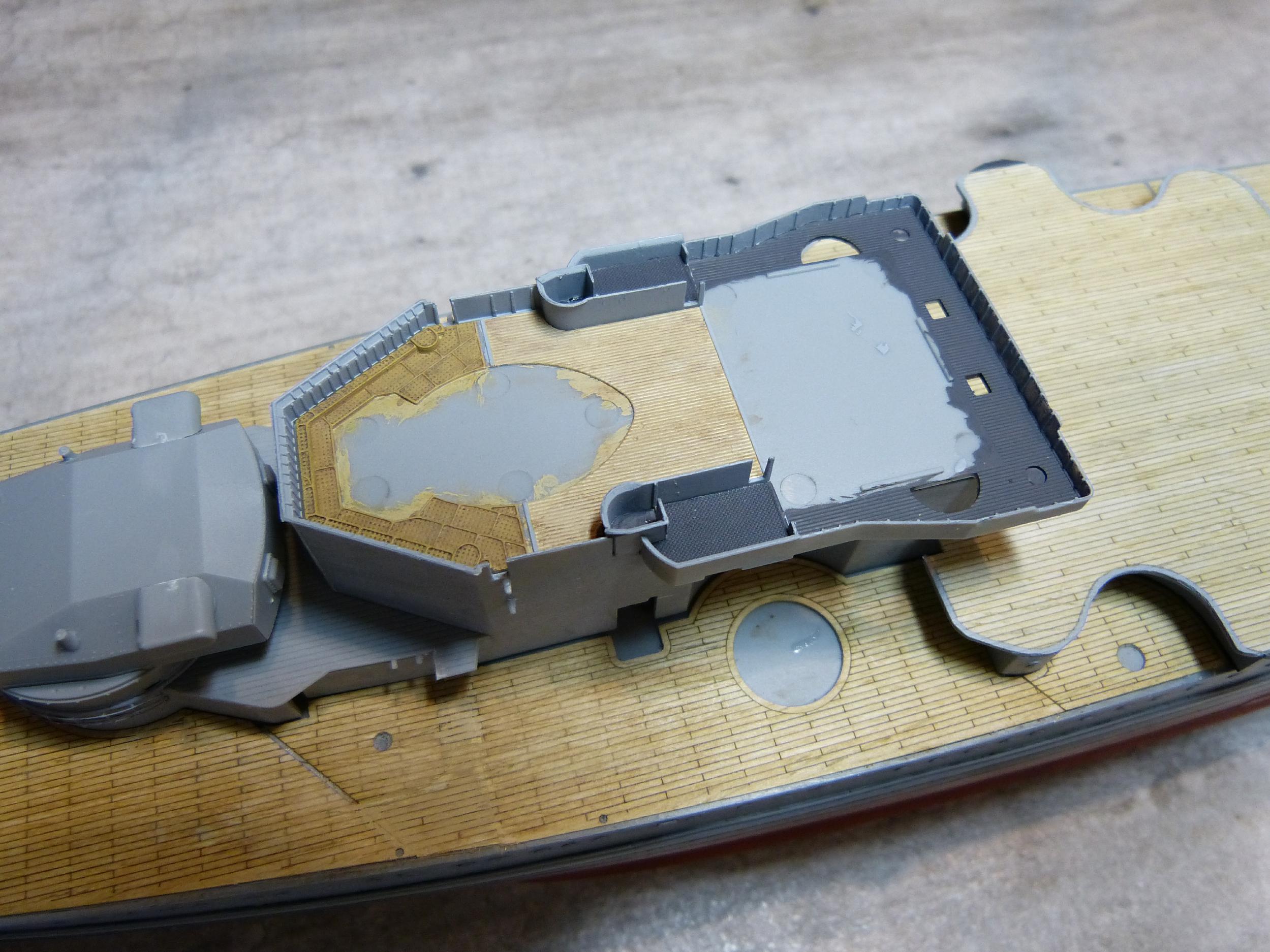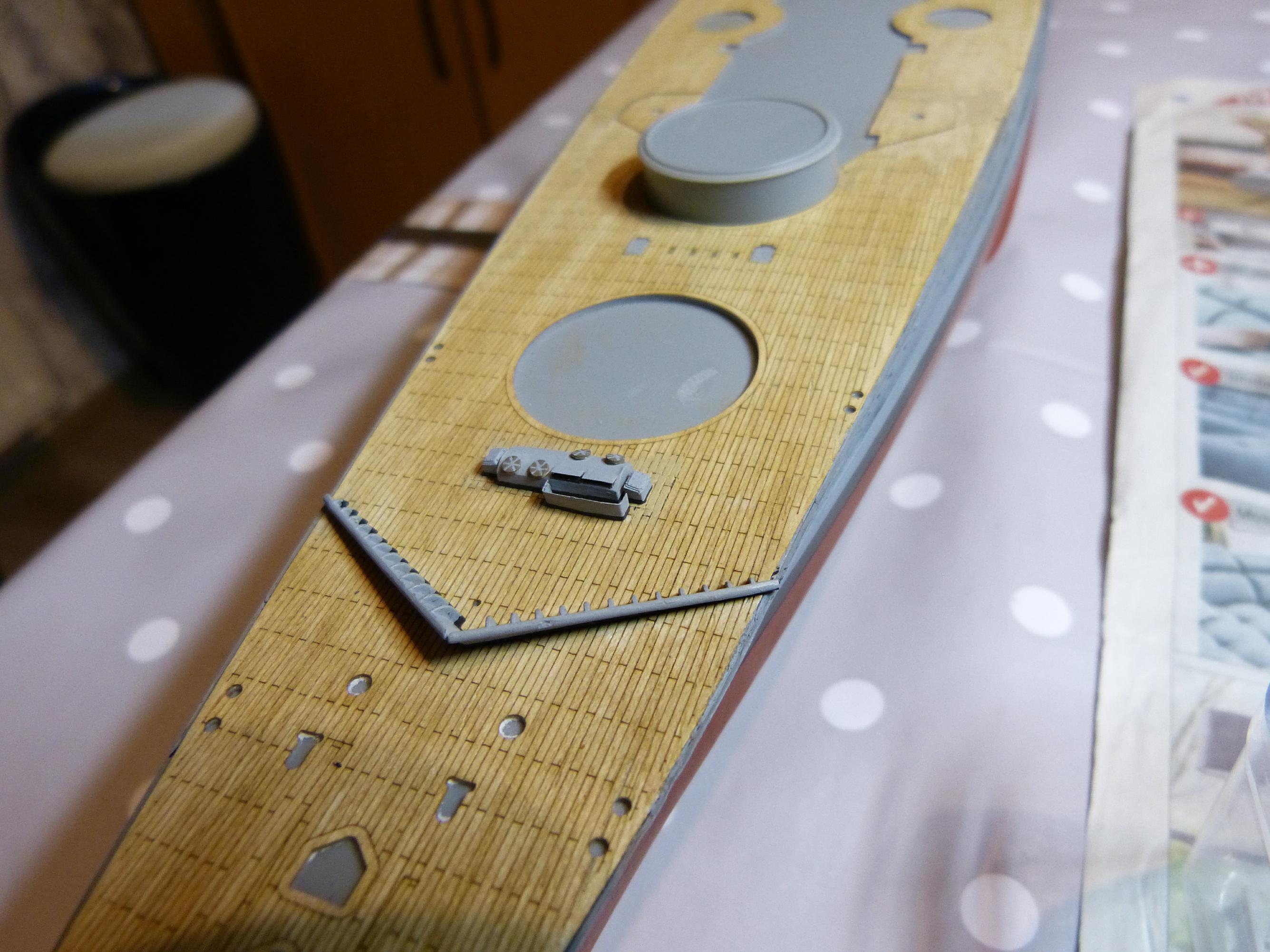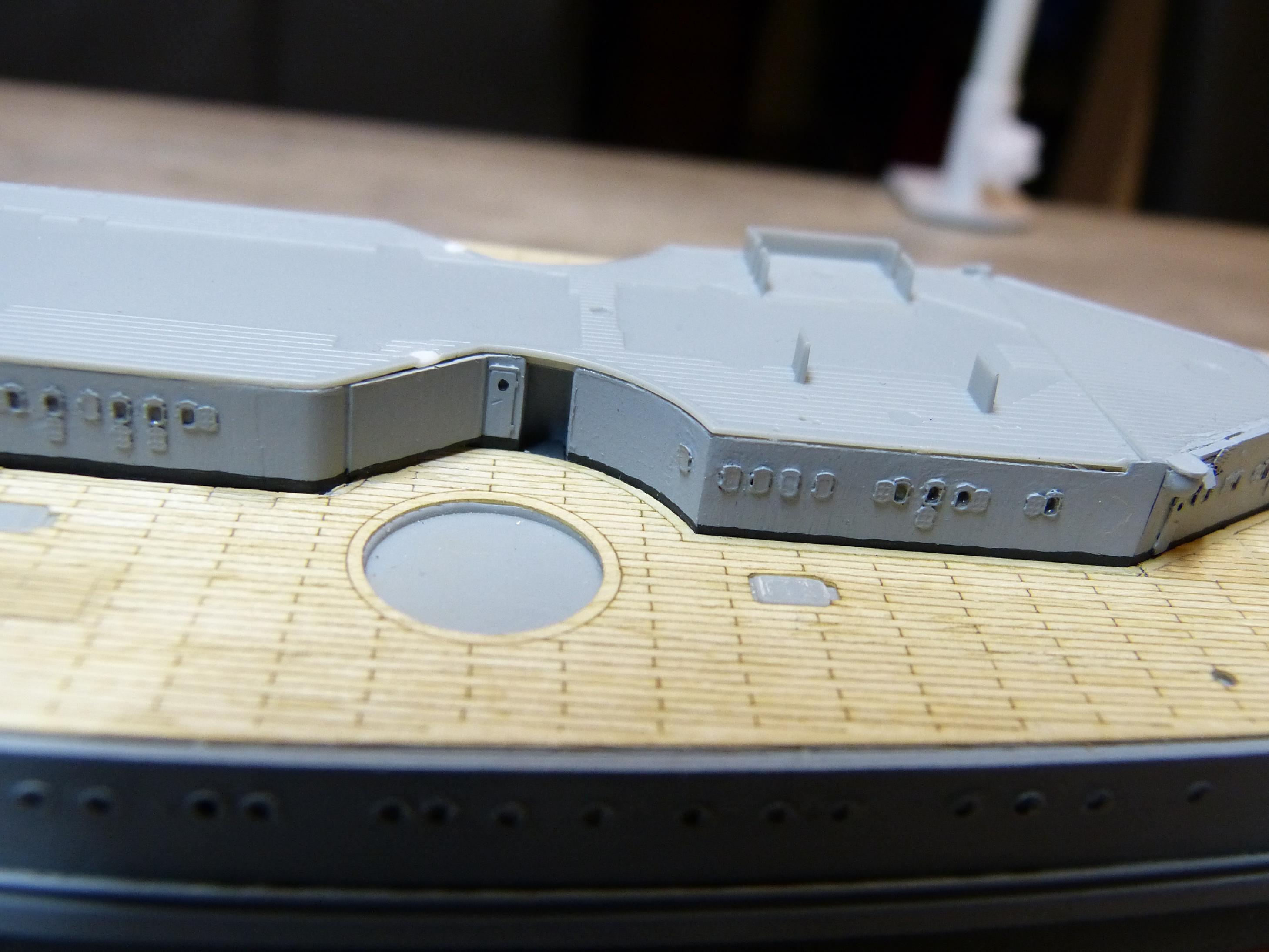 Zwischendurch habe ich mich mit der Bugsektion am Oberdeck befasst. Anders als bei SH ist der Teil bis zu den Ankerklüsen aus glattem Stahl ausgeführt. Auch eine Bugankerklüse gibt es nicht. Ferner war die Spitze anders ausgeführt, diese wurde mittels Schleifpapier angepasst. Die Stahldeck-Sektion entstand aus Plastiksheet 0,03 mm. Als Schablone habe ich das entsprechende Stück des Holzdecks verwendet. Vom Hauptdeck darunter musste auch ordentlich Material entfernt werden, damit das dünne Plastikteil gut anliegt.