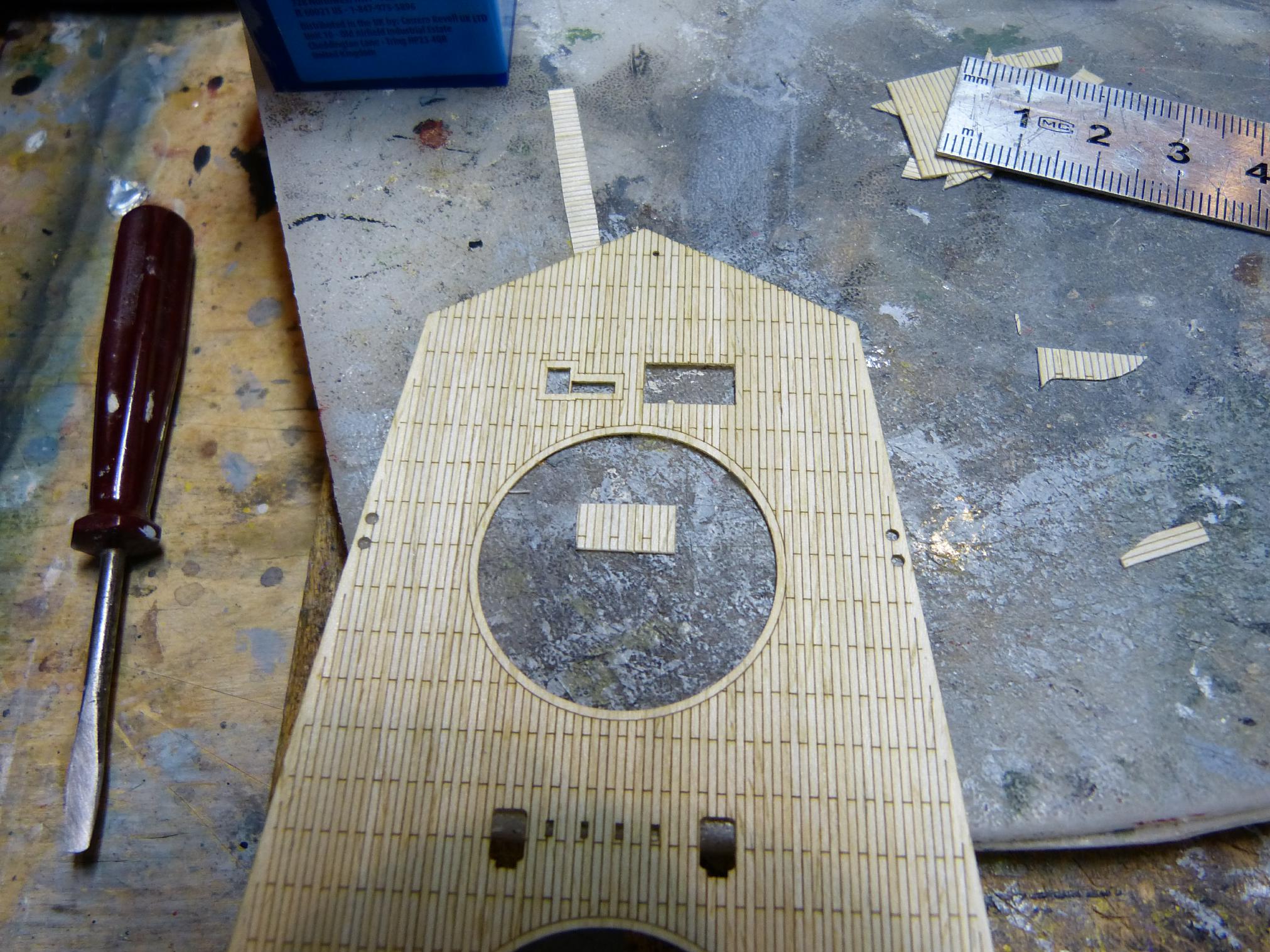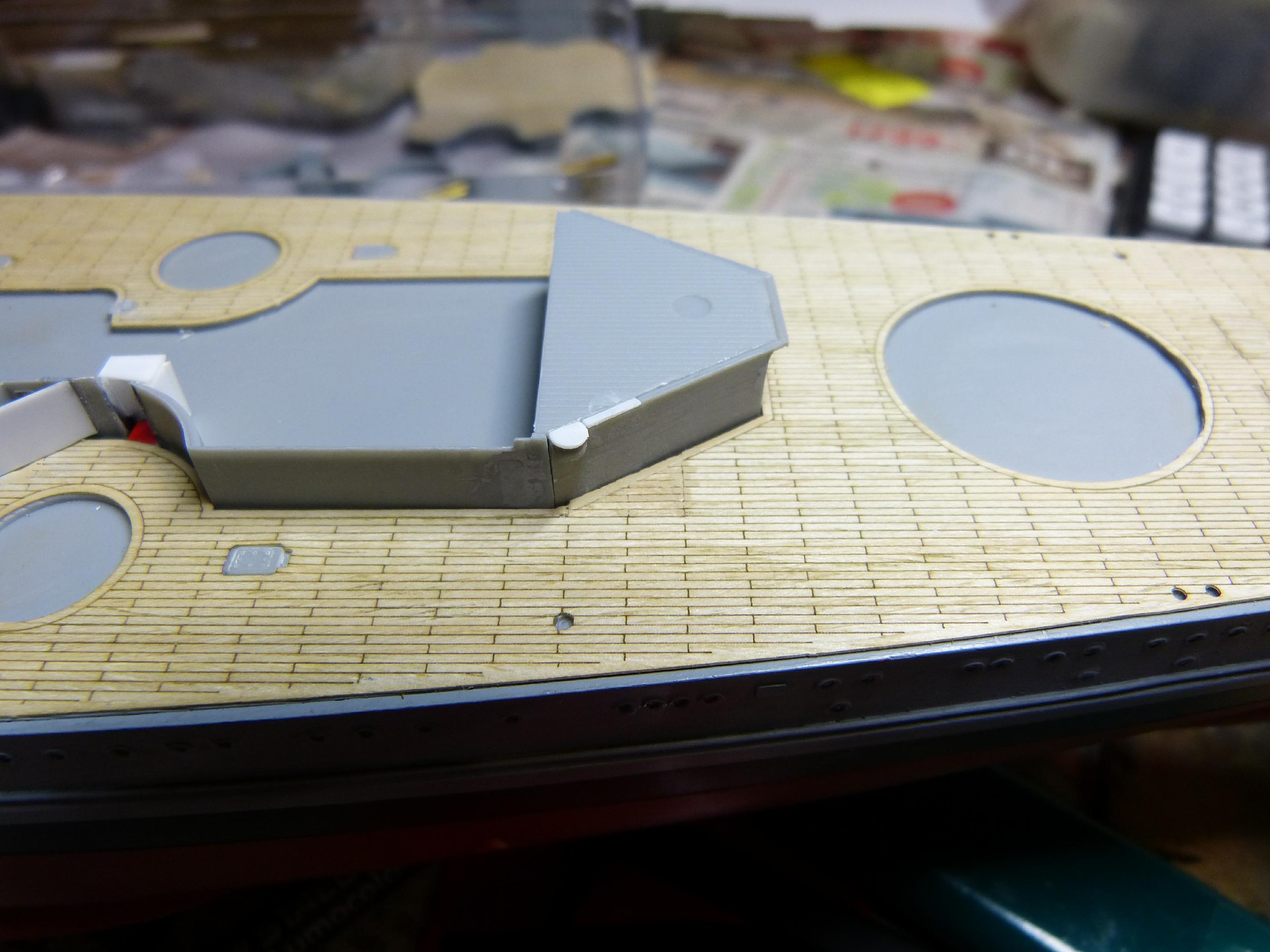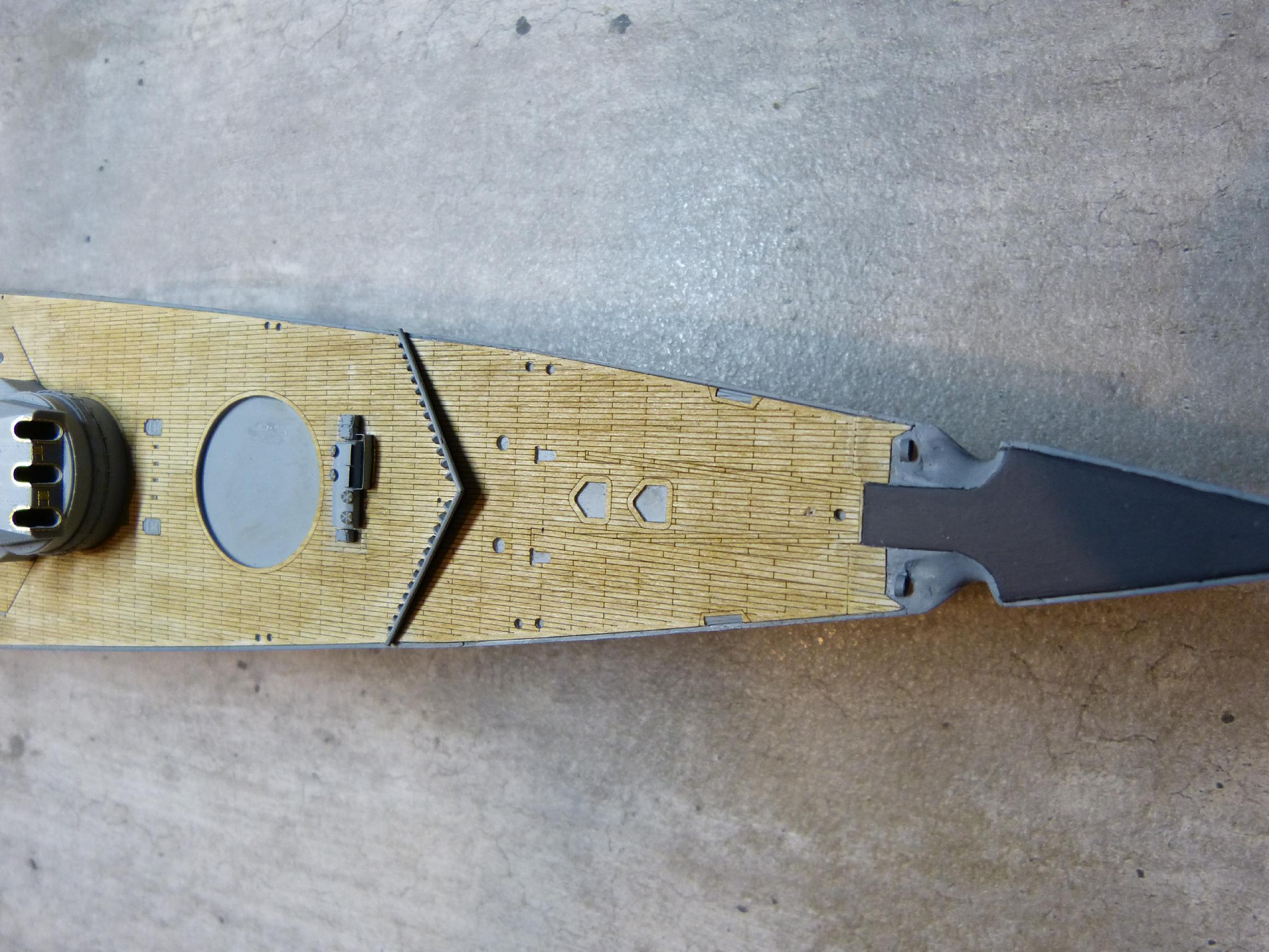 Zwischendurch habe ich mich mit der Bugsektion am Oberdeck befasst. Anders als bei SH ist der Teil bis zu den Ankerklüsen aus glattem Stahl ausgeführt. Auch eine Bugankerklüse gibt es nicht. Ferner war die Spitze anders ausgeführt, diese wurde mittels Schleifpapier angepasst. Die Stahldeck-Sektion entstand aus Plastiksheet 0,03 mm. Als Schablone habe ich das entsprechende Stück des Holzdecks verwendet. Vom Hauptdeck darunter musste auch ordentlich Material entfernt werden, damit das dünne Plastikteil gut anliegt.