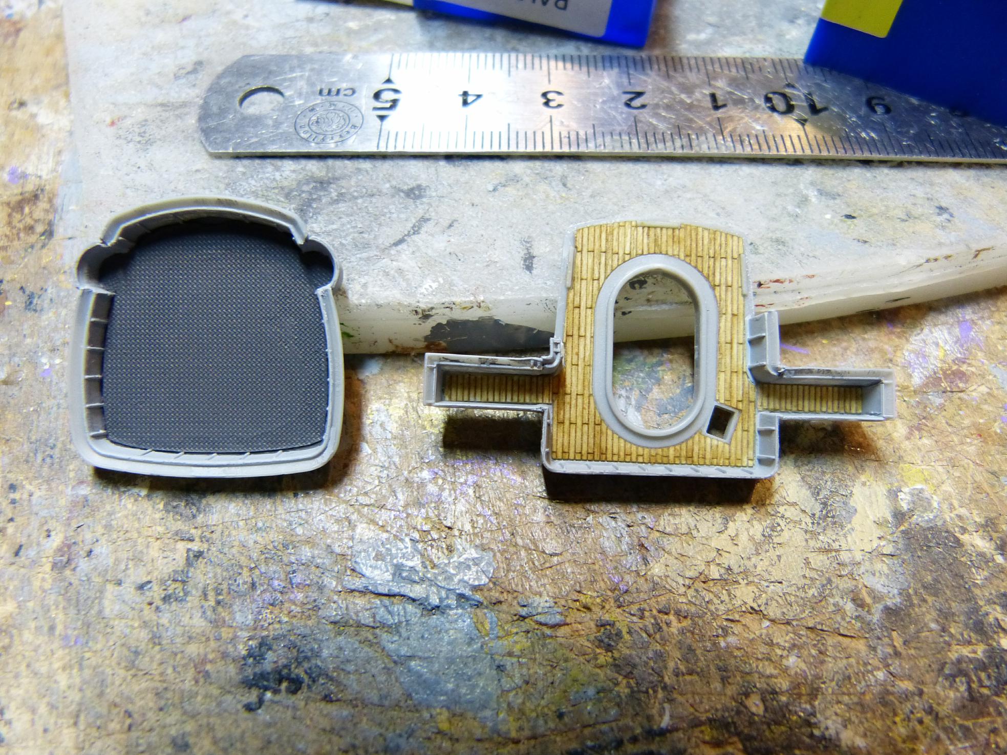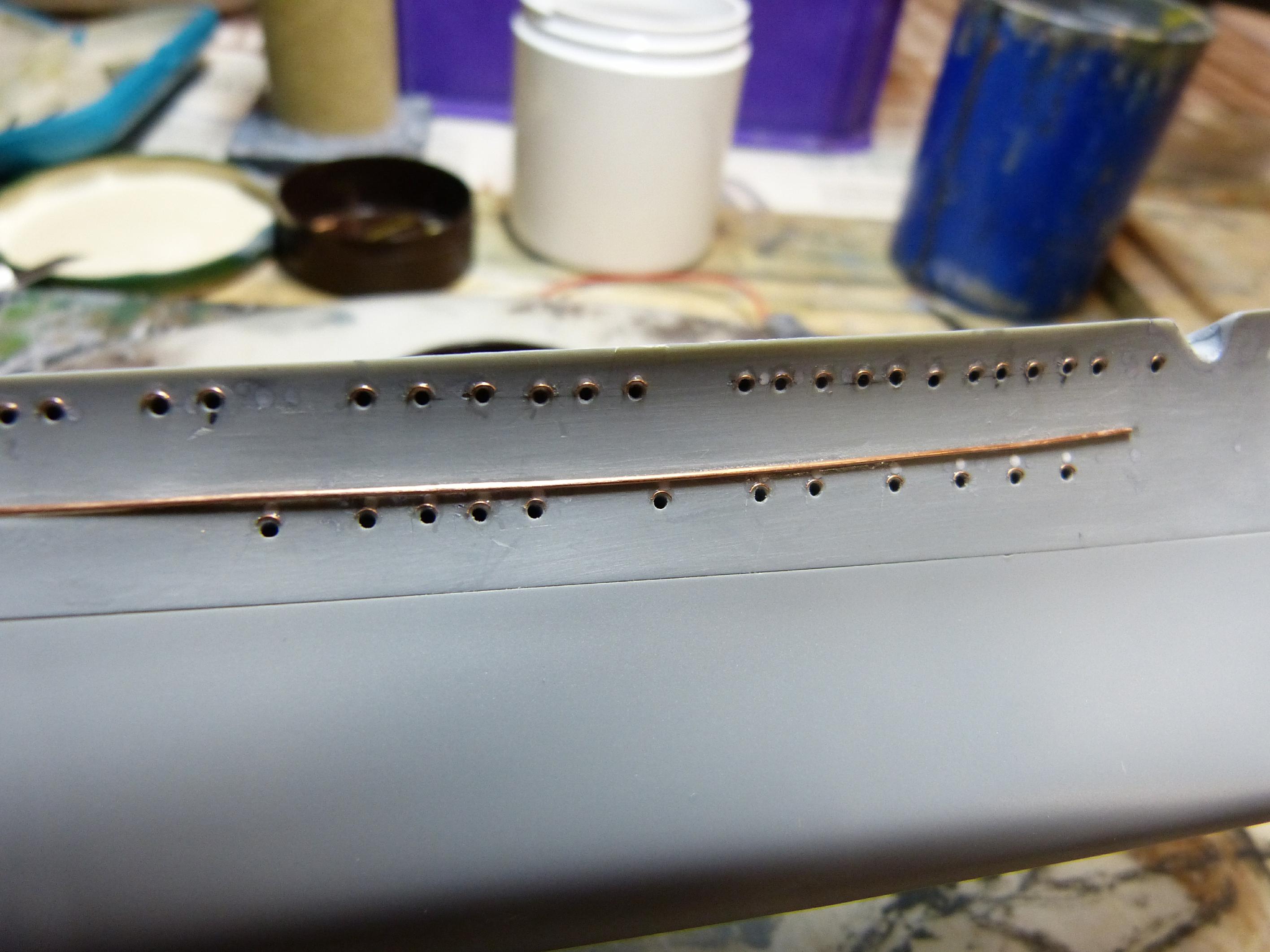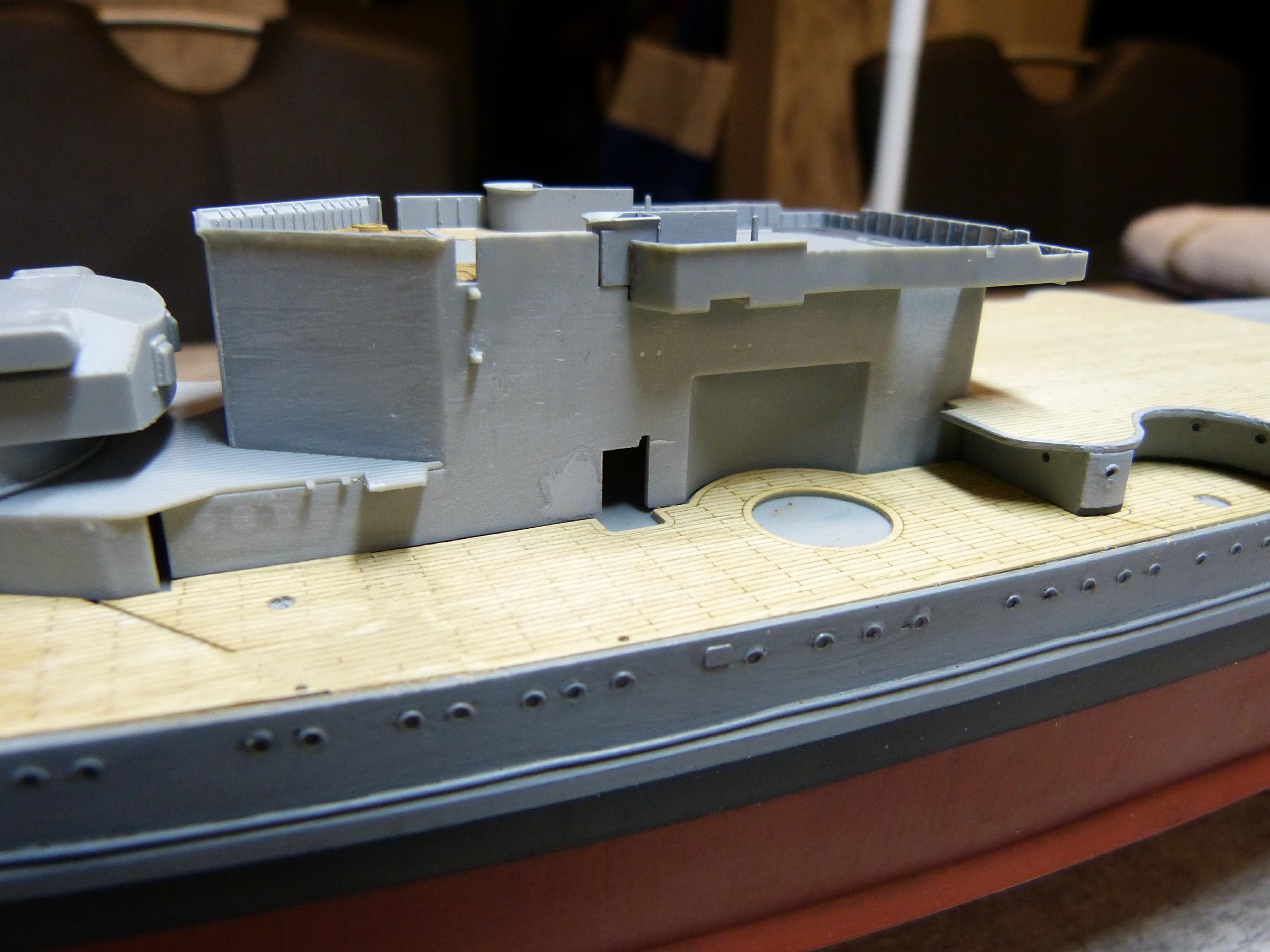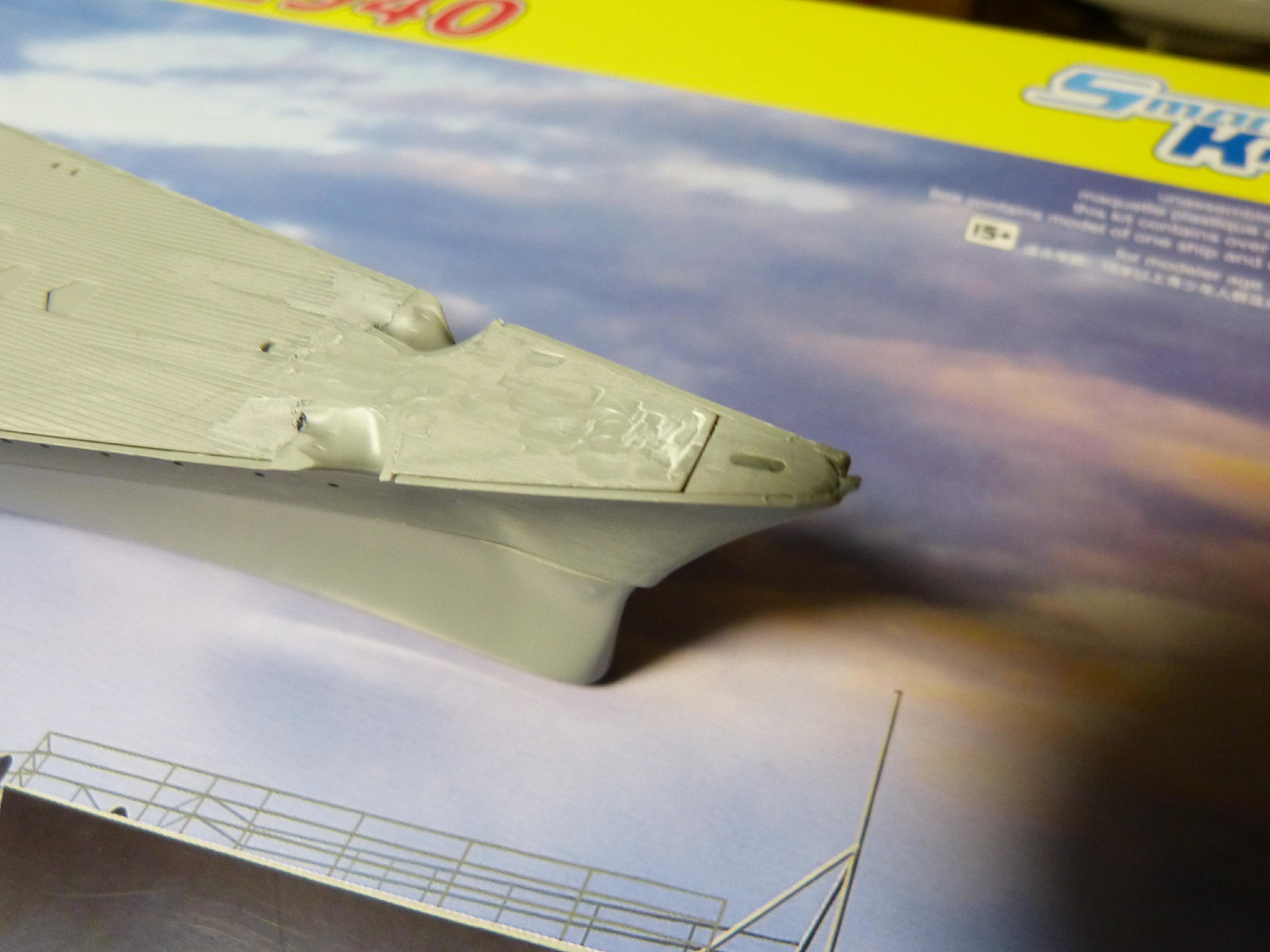 Zwischendurch habe ich mich mit der Bugsektion am Oberdeck befasst. Anders als bei SH ist der Teil bis zu den Ankerklüsen aus glattem Stahl ausgeführt. Auch eine Bugankerklüse gibt es nicht. Ferner war die Spitze anders ausgeführt, diese wurde mittels Schleifpapier angepasst. Die Stahldeck-Sektion entstand aus Plastiksheet 0,03 mm. Als Schablone habe ich das entsprechende Stück des Holzdecks verwendet. Vom Hauptdeck darunter musste auch ordentlich Material entfernt werden, damit das dünne Plastikteil gut anliegt.