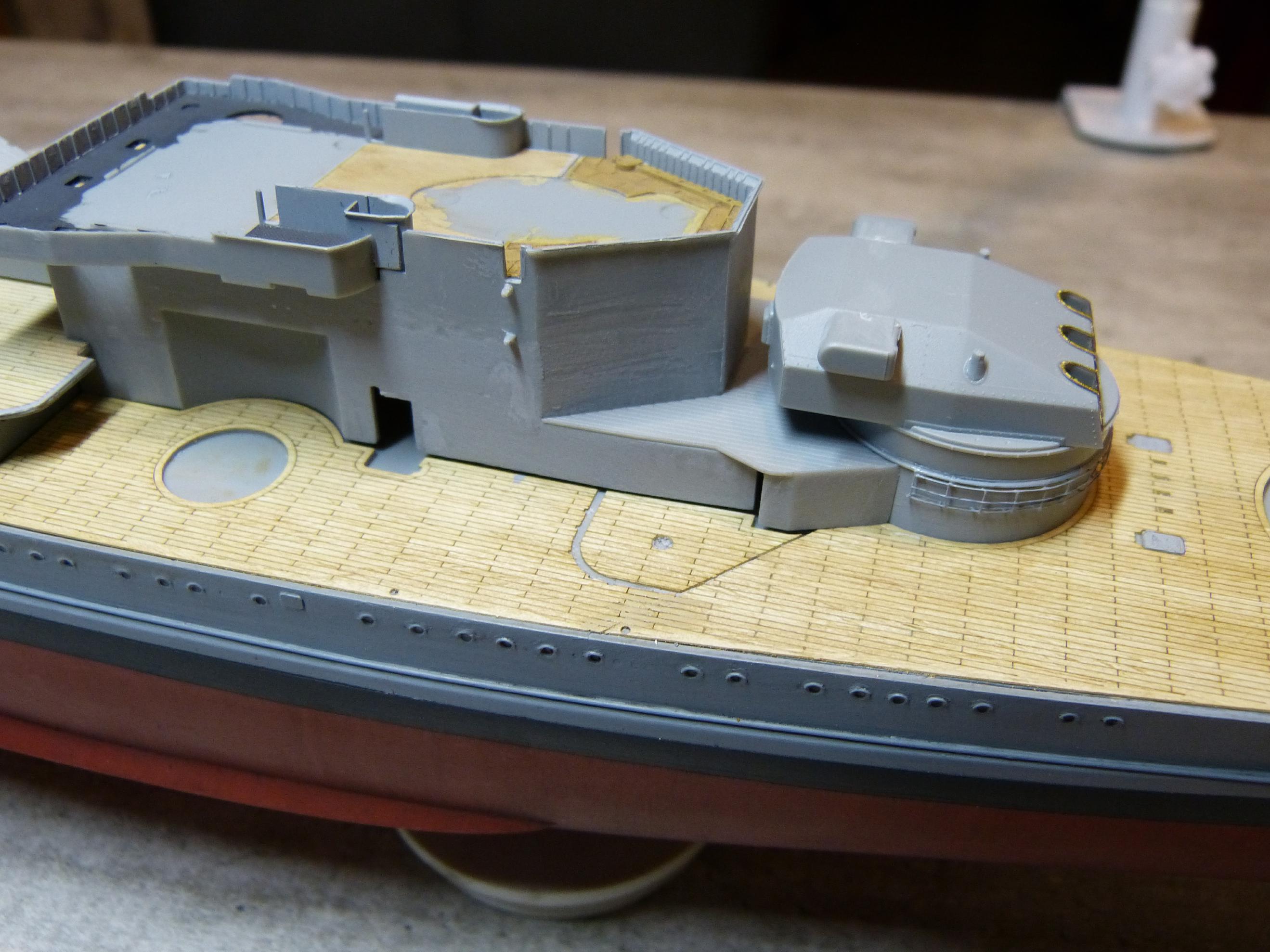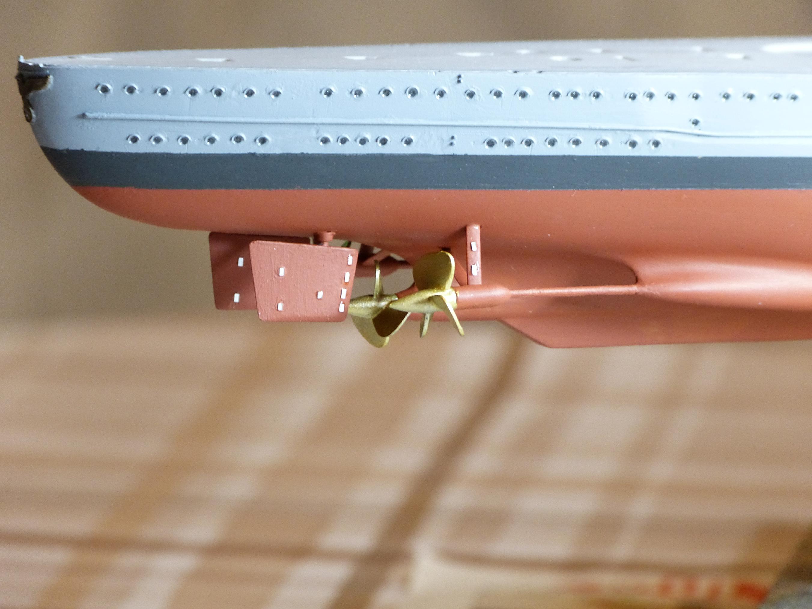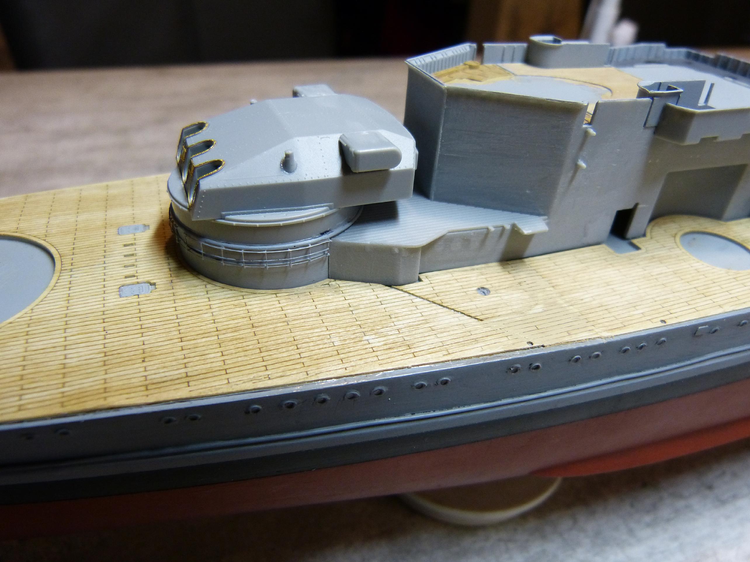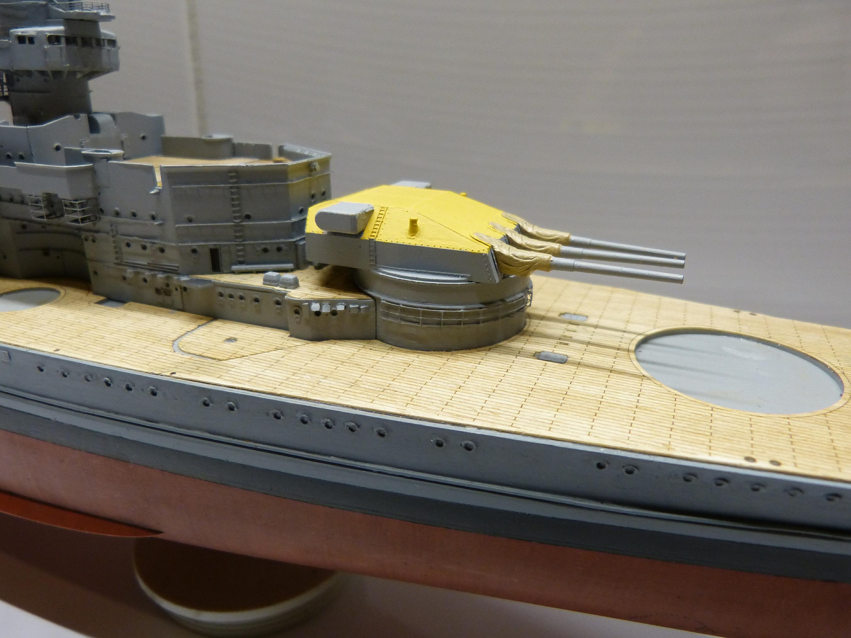 Ich habe mir lange überlegt, welchen Ausrüstungszustand ich meiner GNEISENAU verpasse. Am liebsten wäre mir der Urzustand mit geradem Steven 1938 gewesen. Dies habe ich jedoch wieder verworfen, da es ein Riesenaufwand gewesen wäre, aus dem Atlantik-Bug die entsprechende Bugpartie sauber herauszuarbeiten. Das Risiko, den Rumpf komplett zu versauen, war mir einfach zu groß. Ein später Zustand (Cerberus 1942) kam eigentlich auch nicht in Frage, nicht nur mangels konkreter Vorlage; auch hätte sie dann vielleicht zu sehr meiner SH geähnelt. Letztendlich entschied ich mich für Februar 1940 (vor „Operation Nordmark“) mit gelben Turmhauben (seit 16.1.40), noch ohne Fliegerkennung, mit Schleuder auf Turm Cäsar (am 22.2. entfernt).