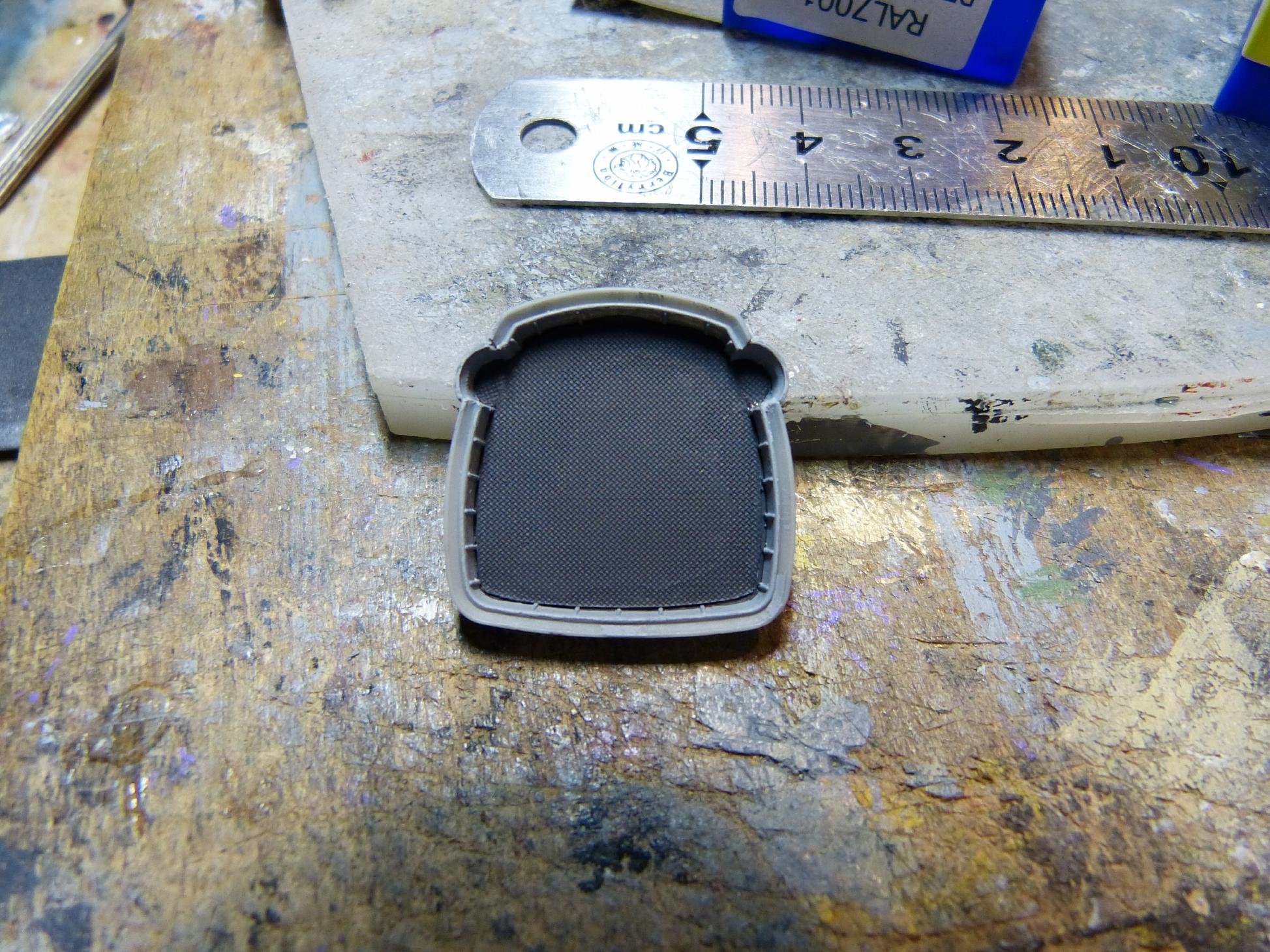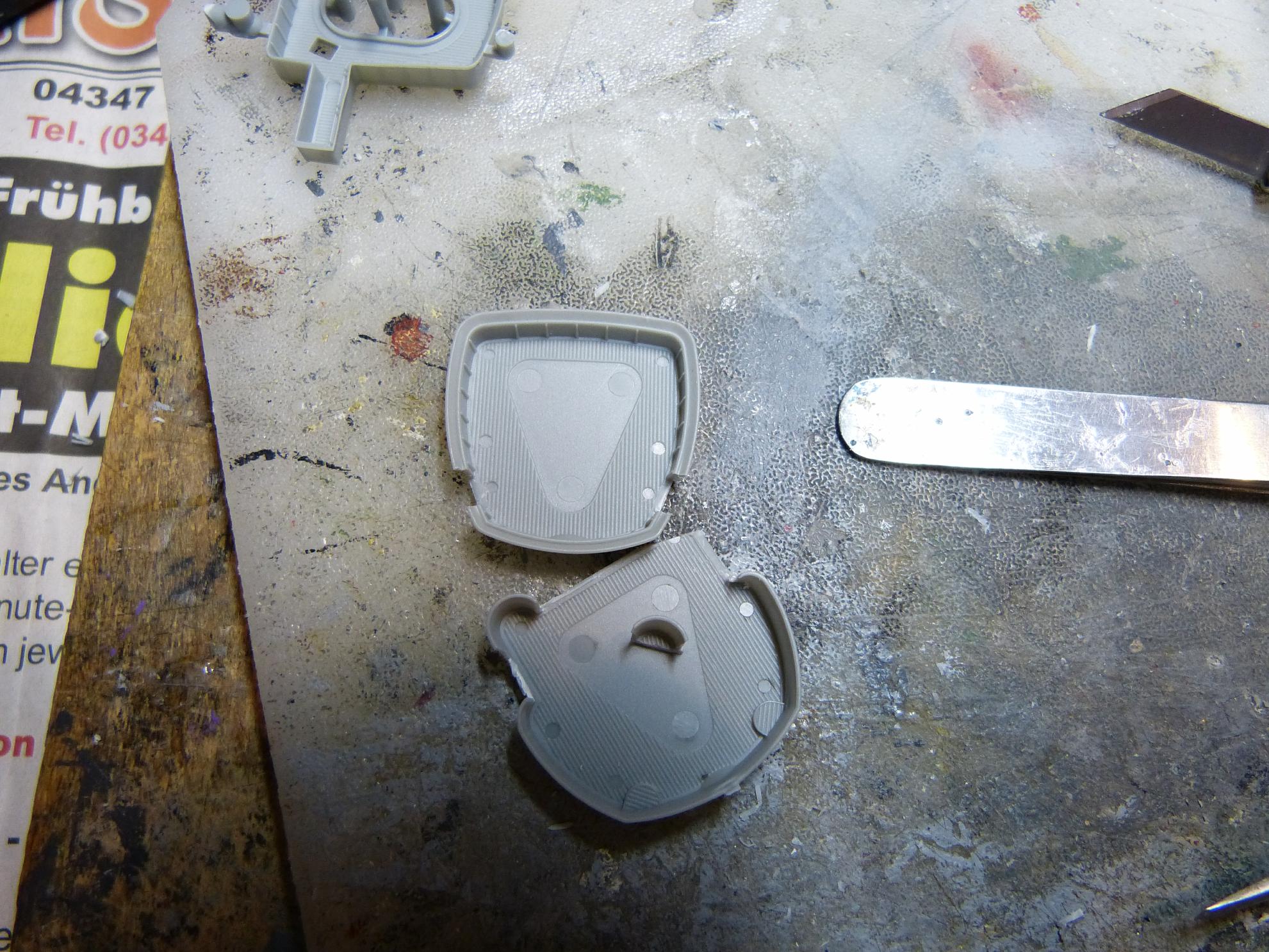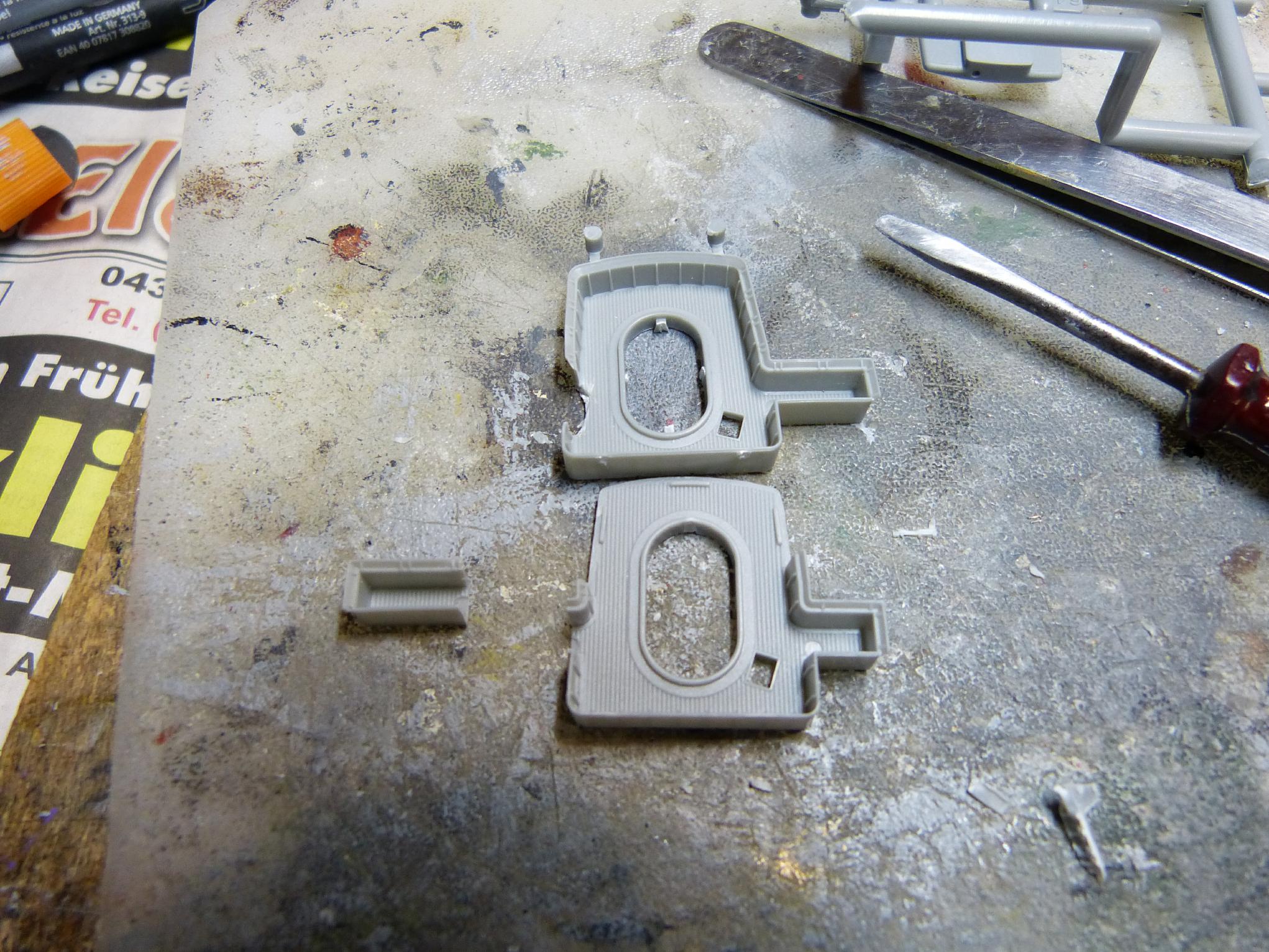 Die Form war offenbar etwas schmaler gehalten. Dann wieder mit dem Dremel grob Löcher reingefräst. Anschließend mit Schlüsselfeilen, Schleifpapier, Spachtelmasse und Messer bearbeitet.