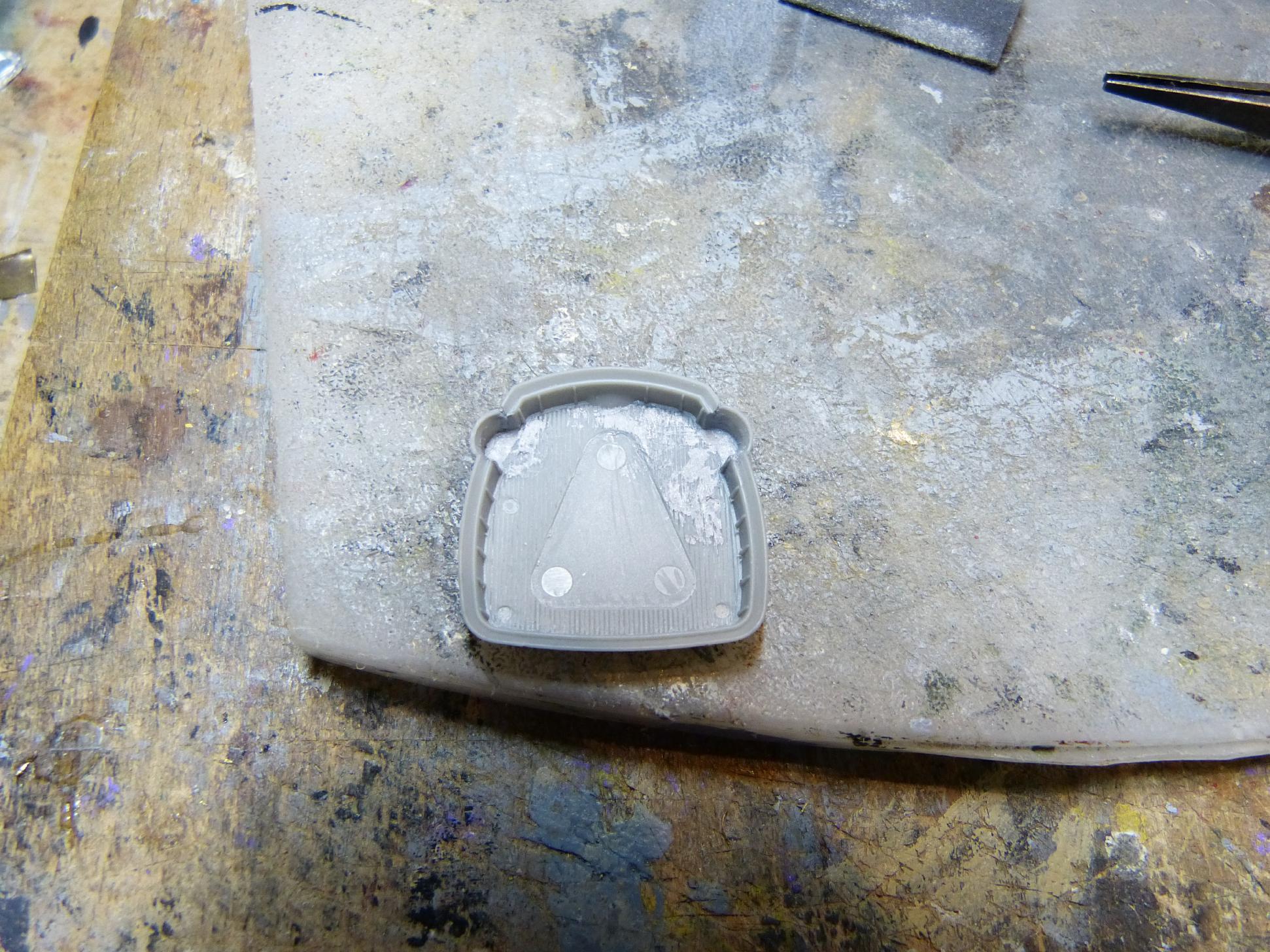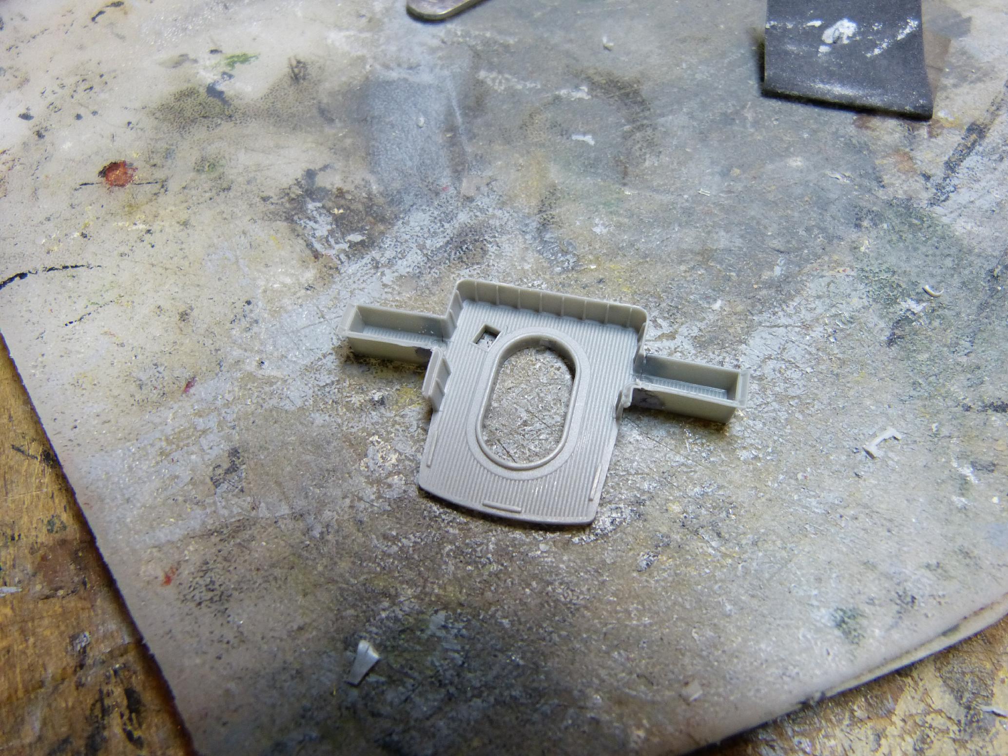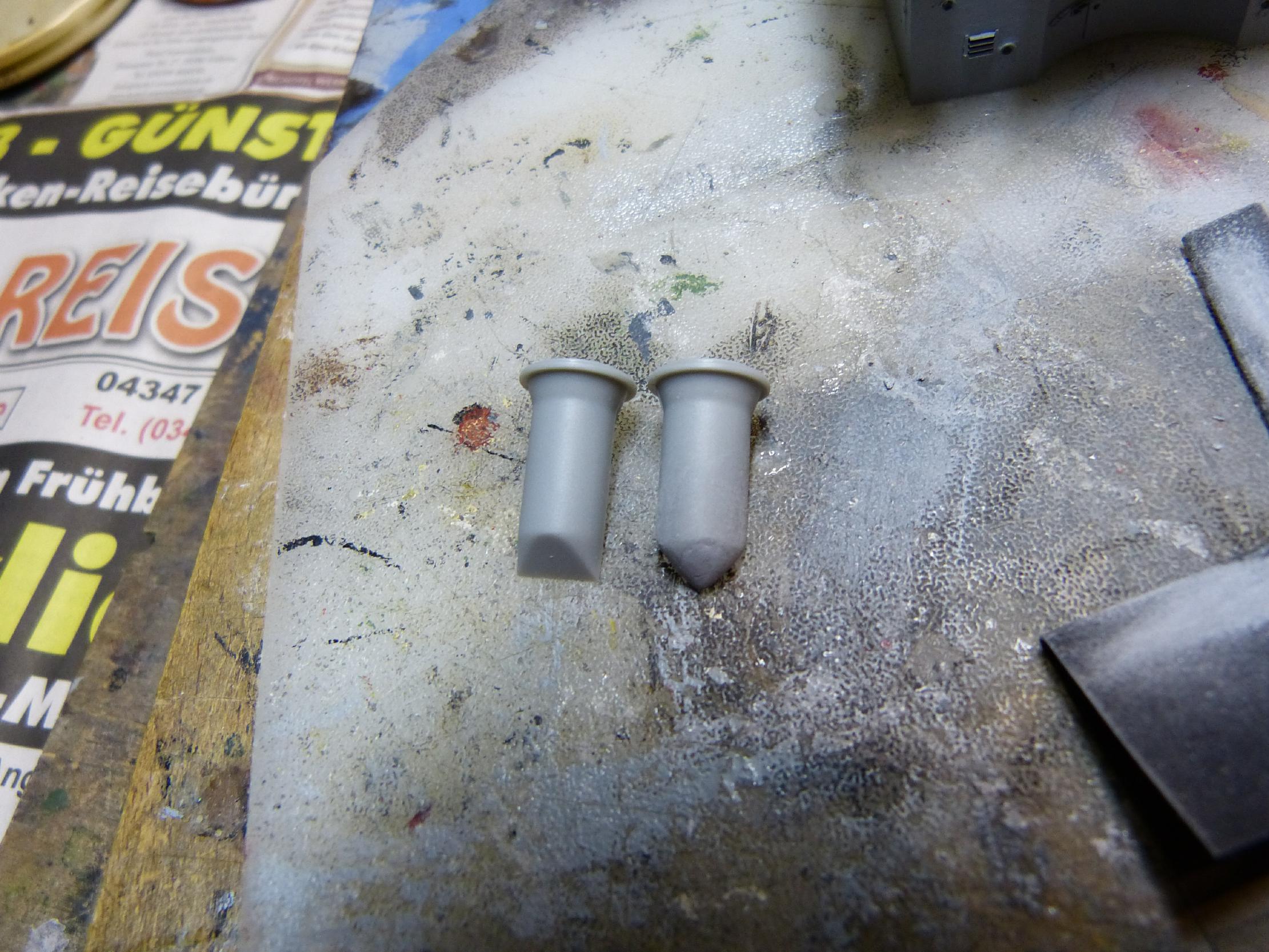Die Form war offenbar etwas schmaler gehalten. Dann wieder mit dem Dremel grob Löcher reingefräst. Anschließend mit Schlüsselfeilen, Schleifpapier, Spachtelmasse und Messer bearbeitet.