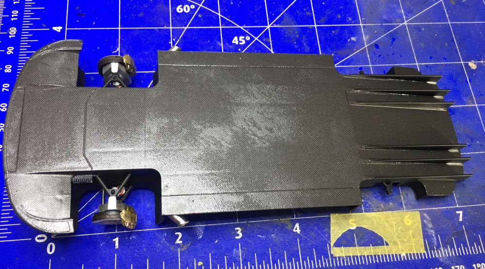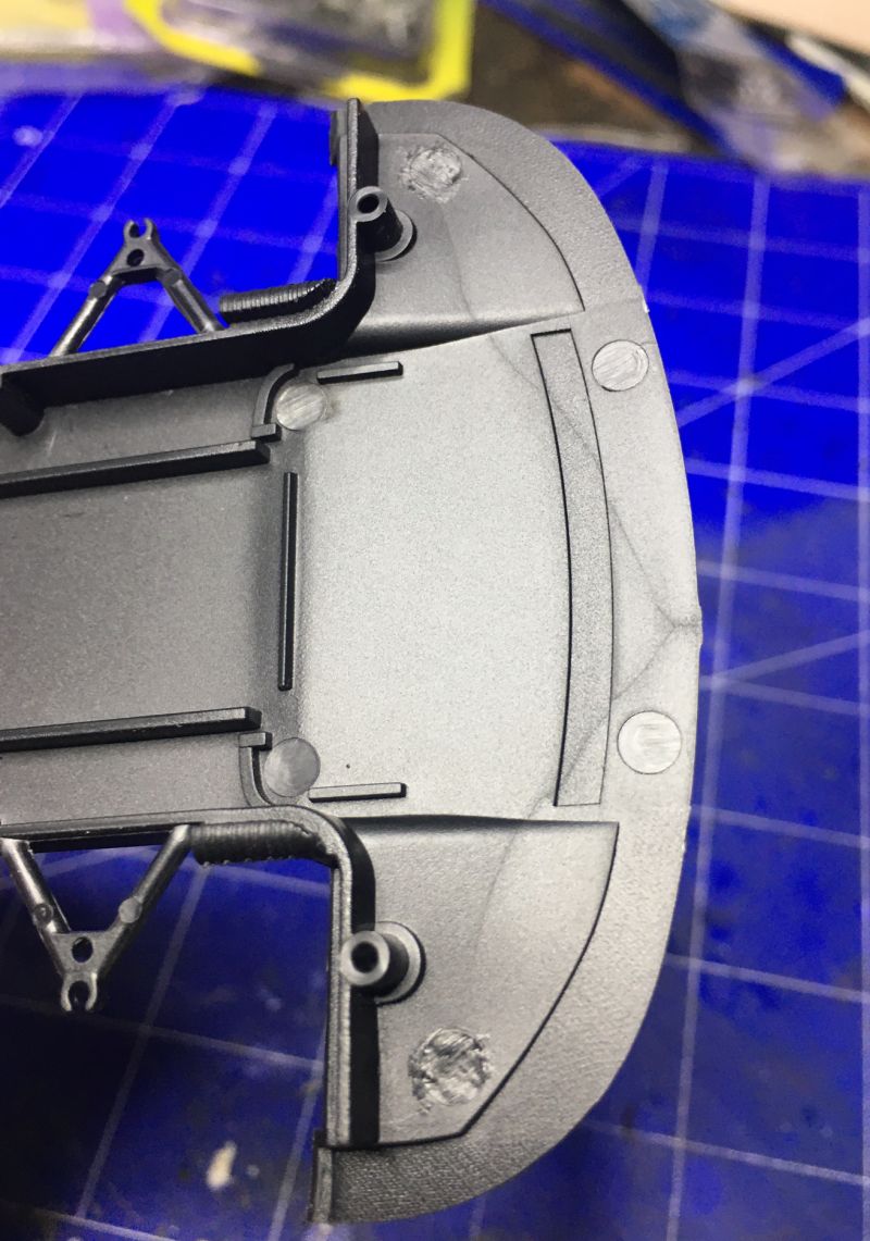 Vorne reichte mäßiges Schleifen, hinten musste auch Spachtel herhalten. Beide Bereiche bekommen noch Carbondecals aus dem Detailset.