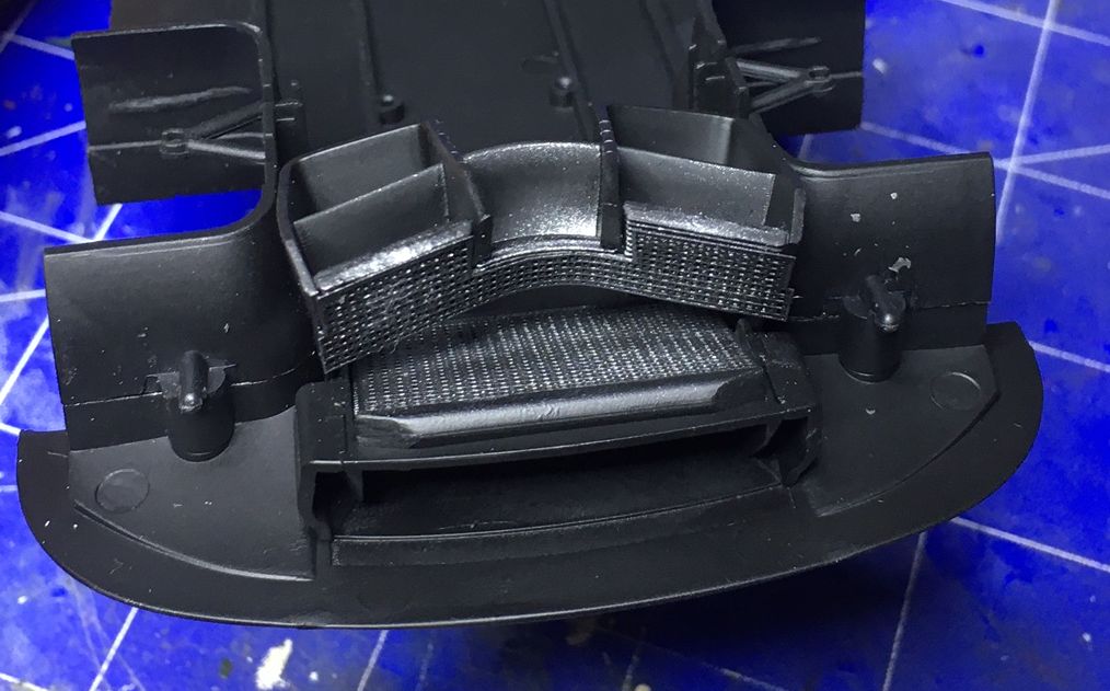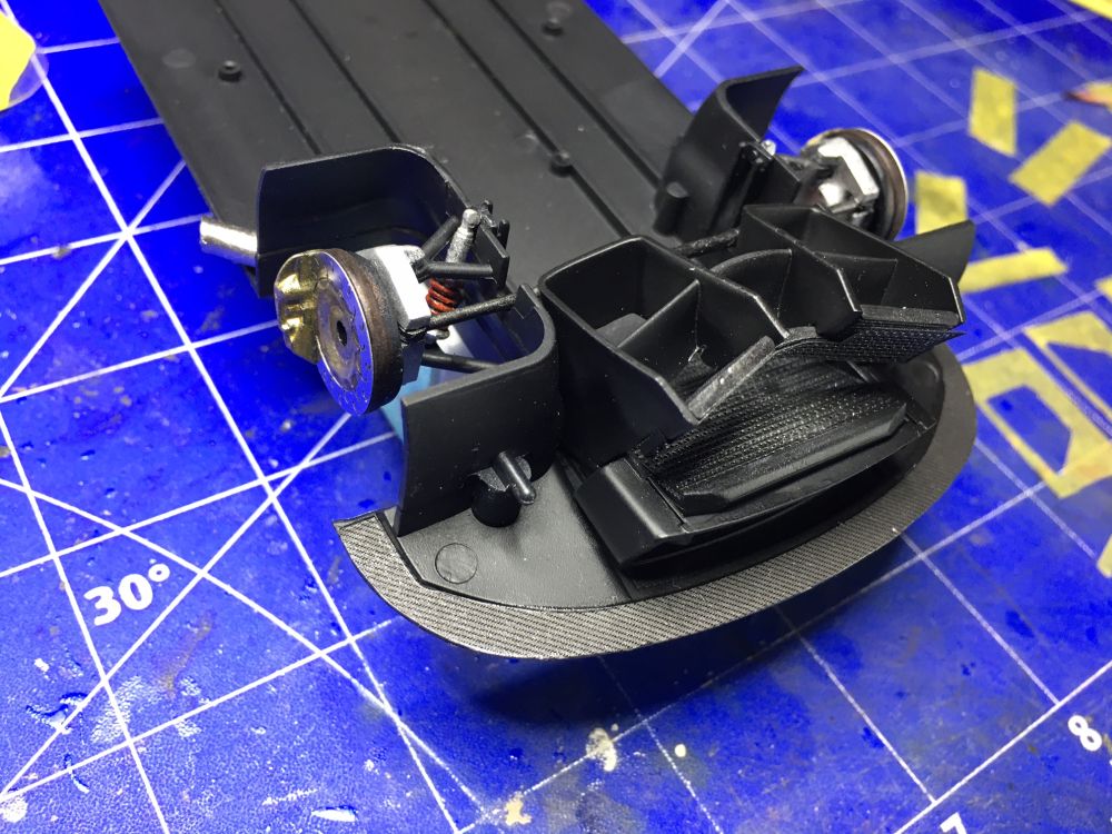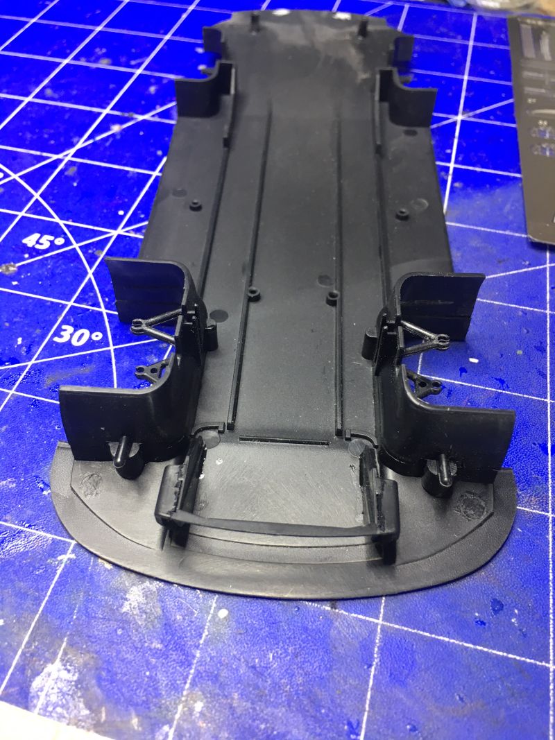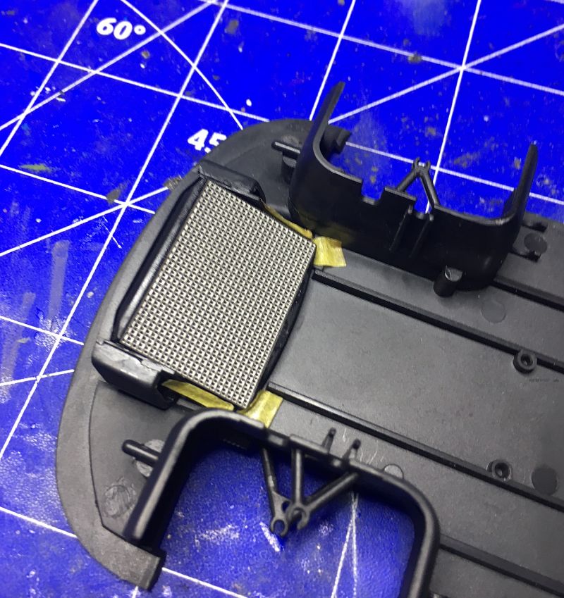 Entgegen dem Bauplan, machte ich mich dann schon an den Lufteinlass, bzw. die Kühler. Außerdem kamen die oberen Teile des vorderen Radkastens und die Radaufhängung an den Unterboden.
