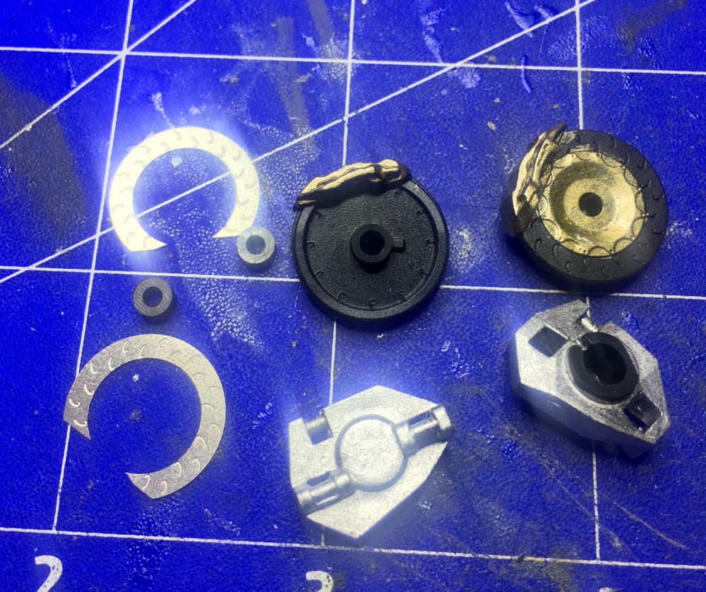 weiter ging es mit den vorderen Bremsen und Federbeinen. Alle Teile sind ordentlich und müssen nur leicht versäubert werden. Die geätzten Bremsscheiben passen super und werden nur aufgeklebt. Ein Abschleifen der Strukturen am Plastik ist nicht notwendig. Dass gilt übrigens für alle Ätzteile aus dem Dedailset von Nunu.