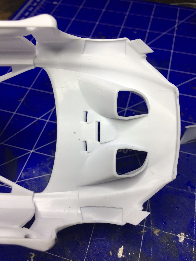 Dort müssen die beiden abgesetzten Flächen an der Kotflügeln ausgeschnitten werden. Dies funktionierte mit einer Graviernadel recht gut.