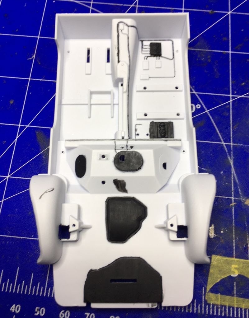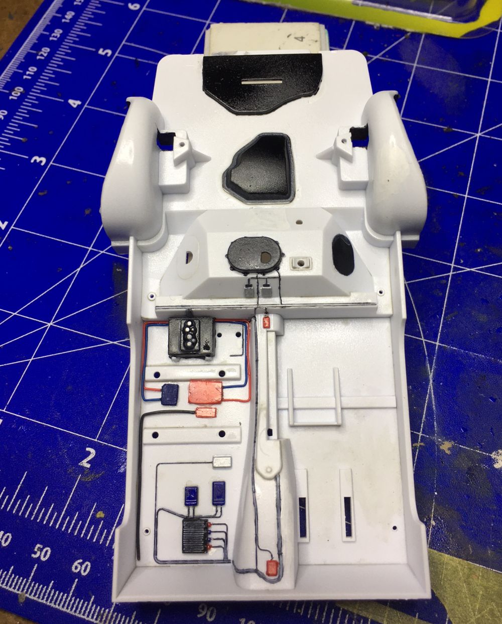 Der Innenraum ist gut detailiert. Allerdings sind die dargestellten Kabelverbindungen extrem filigran. Ich habe es erst mit dem Pinsel versucht, bin dann jedoch bei einem wasserfesten Edding gelandet. Ohne Kleckser gings leider nicht.