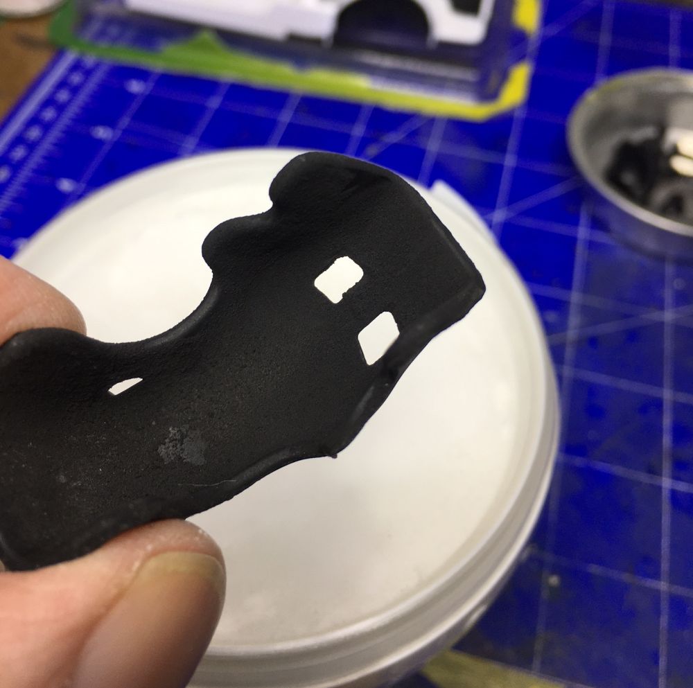 Den Sitz habe ich mit reichlich Trocknungsverzögerer in mattem Schwarz gesprüht und dann in eine Dose Microballons gedrückt. Nach einer Weile habe ich die überschüssigen Kügelchen mit einen weichen Pinsel wieder abgetragen und dann den Sitz nochmal gesprüht.