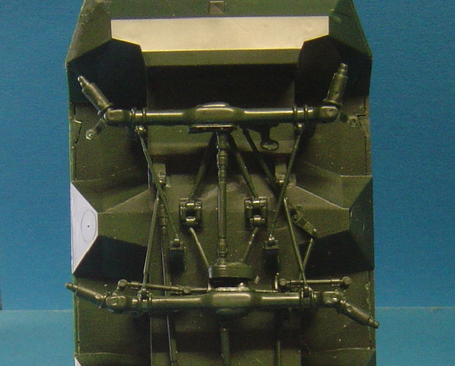 Die Räder sollen etwas eingelenkt stehen. Hierzu beginnt man mit einem Achsschenkel z.B. Teil 84 indem man ihn etwas schräg einklebt. Dann Teil 95 mit Teil 94 ausrichten, Teil 96 mit Teil 93 usw. bis zum Achsschenkel 85.