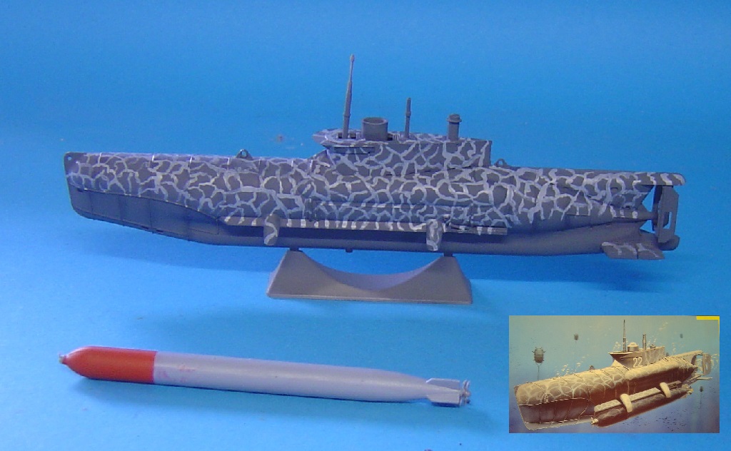 ..und, weil mir das Deckelbild ( obwohl es sich hier wahrscheinlich um Wellen handelt, die sich auf dem Rumpf spiegeln ) so gut gefiel, mit Tarnung.