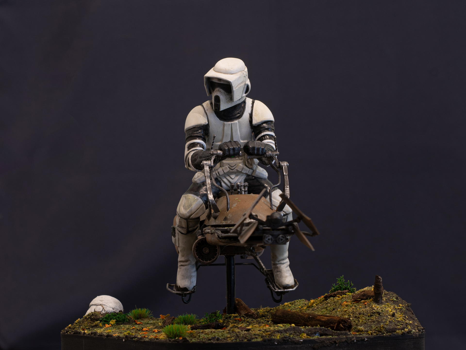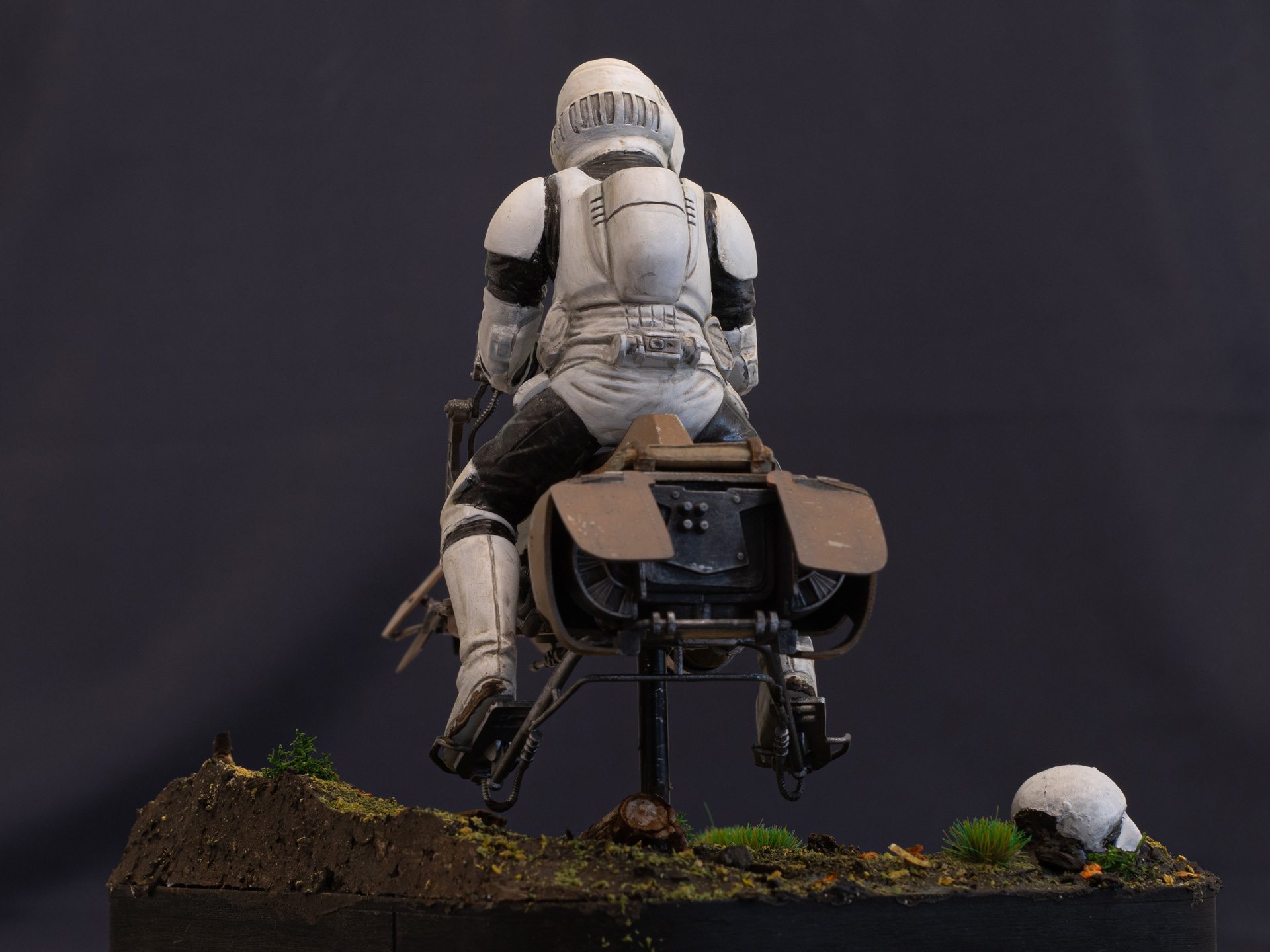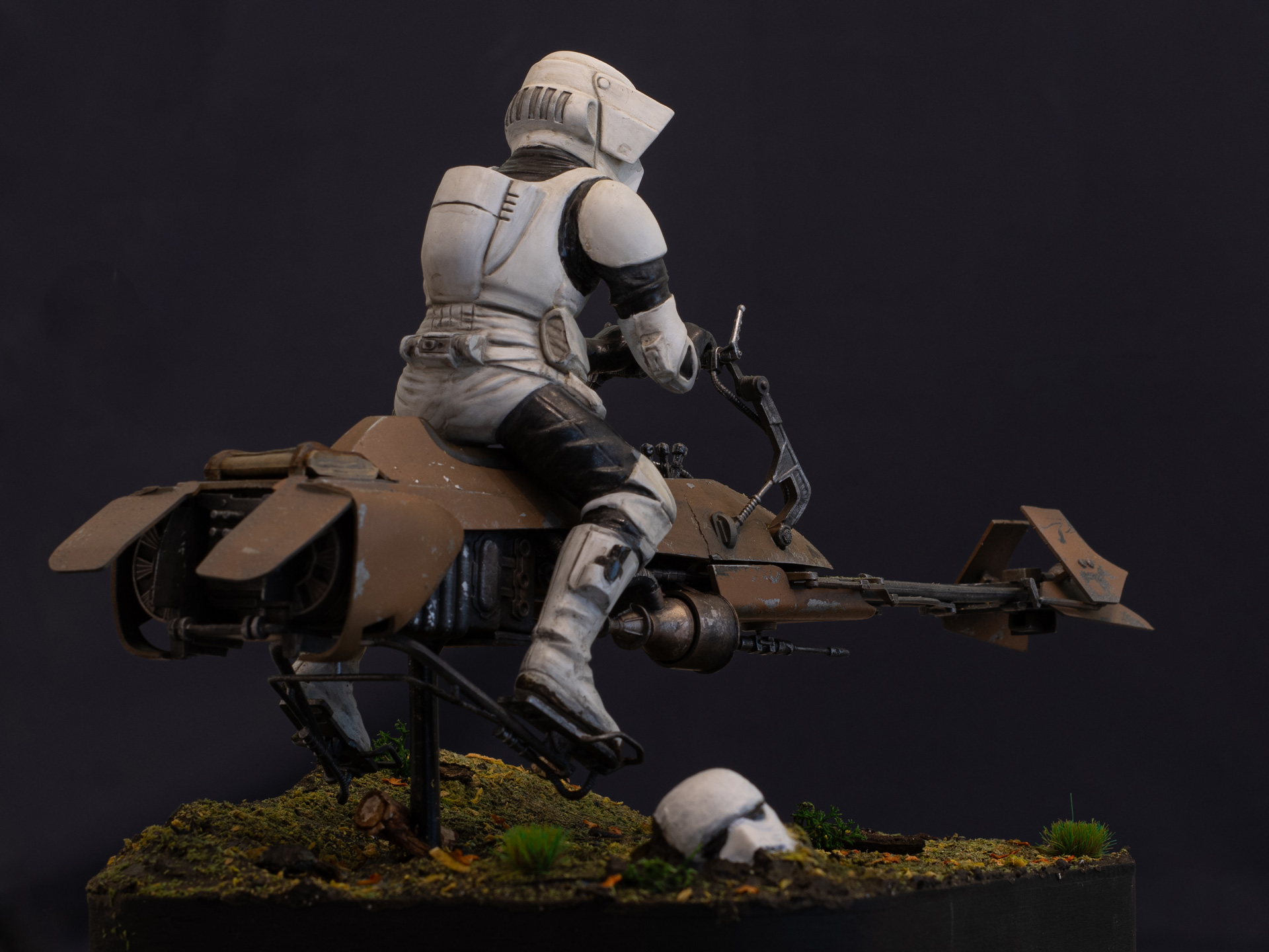 Die Basis wollte ich ursprünglich komplett schlicht schwarz halten, hab dann kurz über nen kompletten Jungle nachgedacht, mich letztendlich aber doch für gemäßigtes Grün entschieden. Der Stormtrooper Helm am Boden ist ein Recast des Revell Mando Kits das ich demnächst nochmal bauen muss wenn ich etwas mehr Zeit habe.