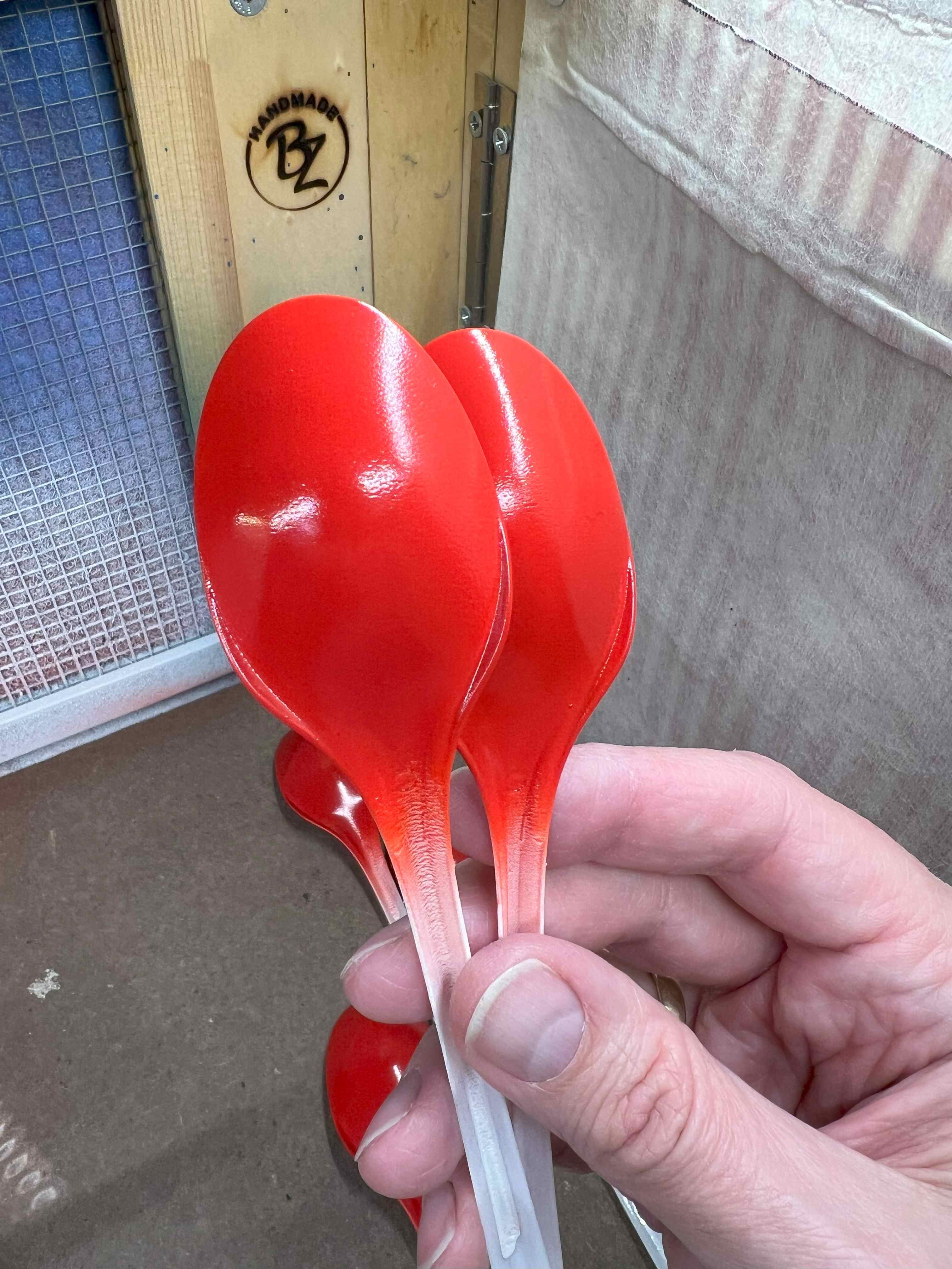 Jetzt vergleiche ich mal die beiden Löffel, die mit 0,8 und 1,0bar lackiert wurden. Man sieht hier deutlich, wie "scharf" die LED-Punkt des LED-Band reflektiert werden. Das zeugt von einem deutlich höheren Glanzgrad.