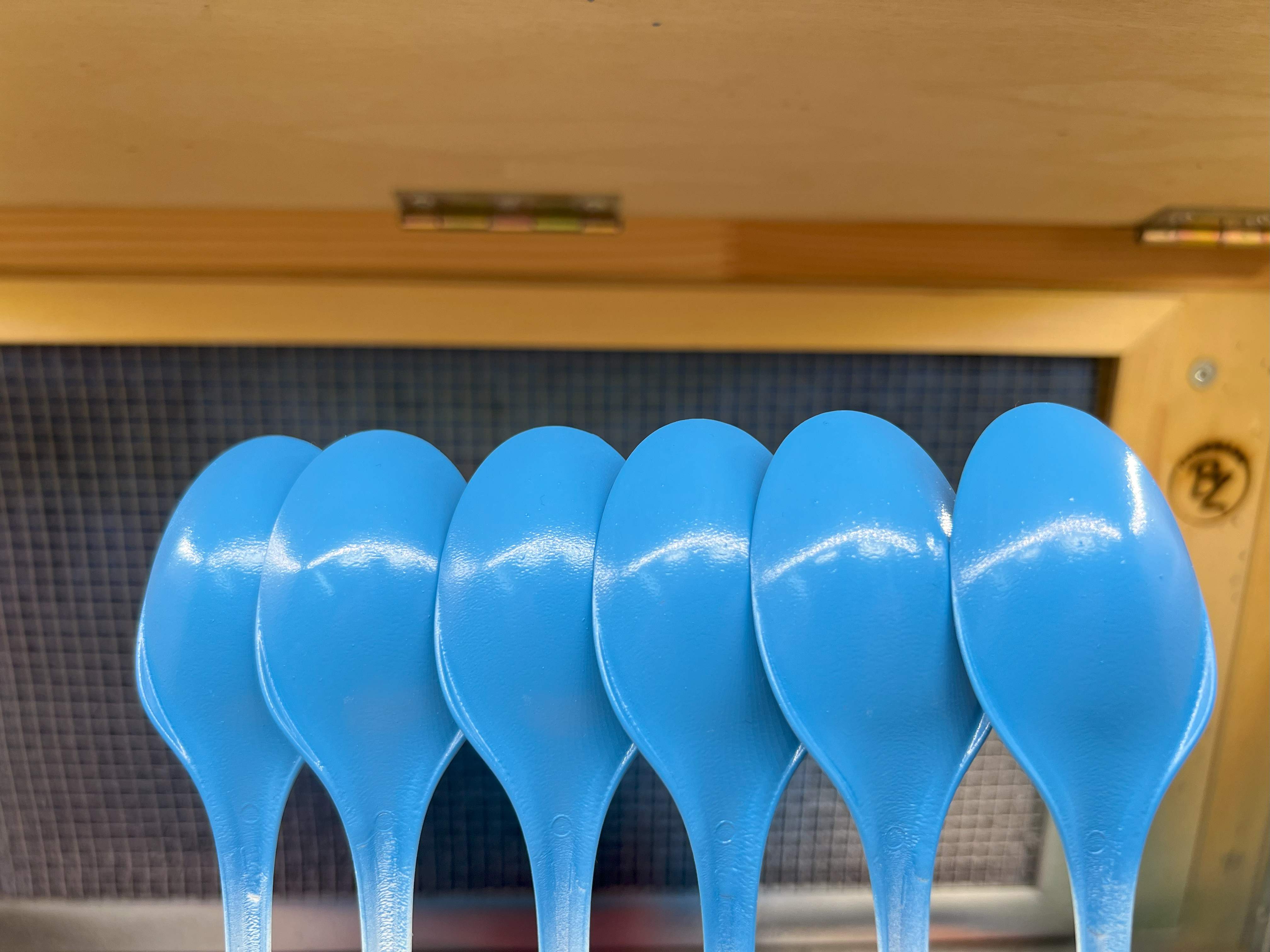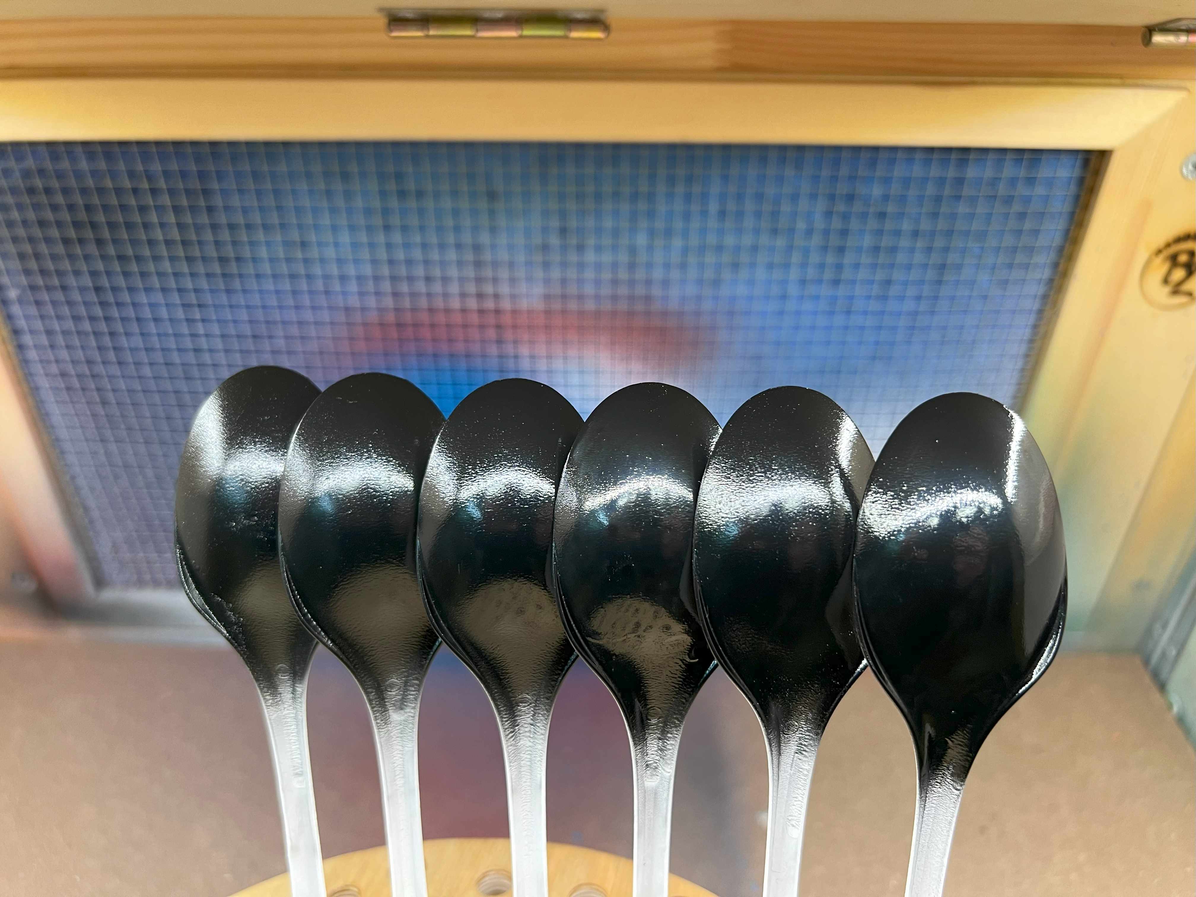 Die erste Schicht habe ich jeweils relativ grob auf getragen und bildete eine sogenannte "Klebschicht". Diese Schicht darf nicht zu deckend sein und ist ehr ein "drübernebeln" zu nennen. Dann habe ich drei weitere deckende Schichten aufgetragen, wobei ich darauf geachtet habe, dass ich jede Schicht nass in nass deckend gesprüht wurde. Zwischen den Schichten habe ich eine Trocknungsphase eingelegt bzw. ich habe den Druck um 0,2bar reduziert und mir den nächsten Löffel vorgenommen.