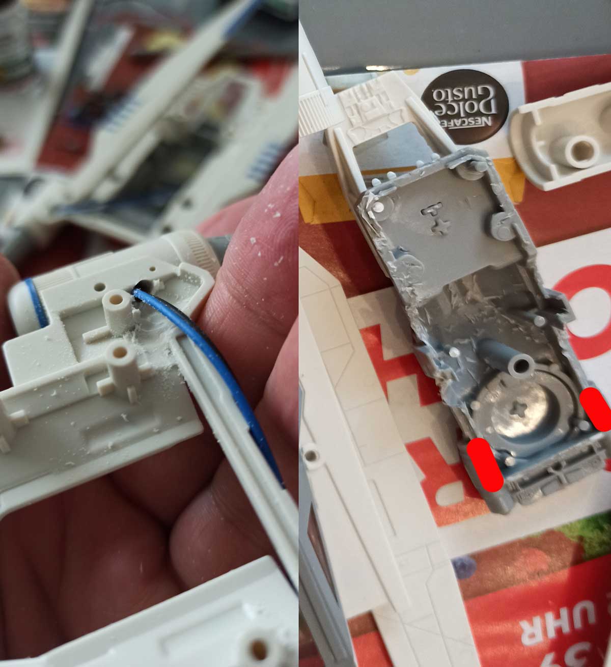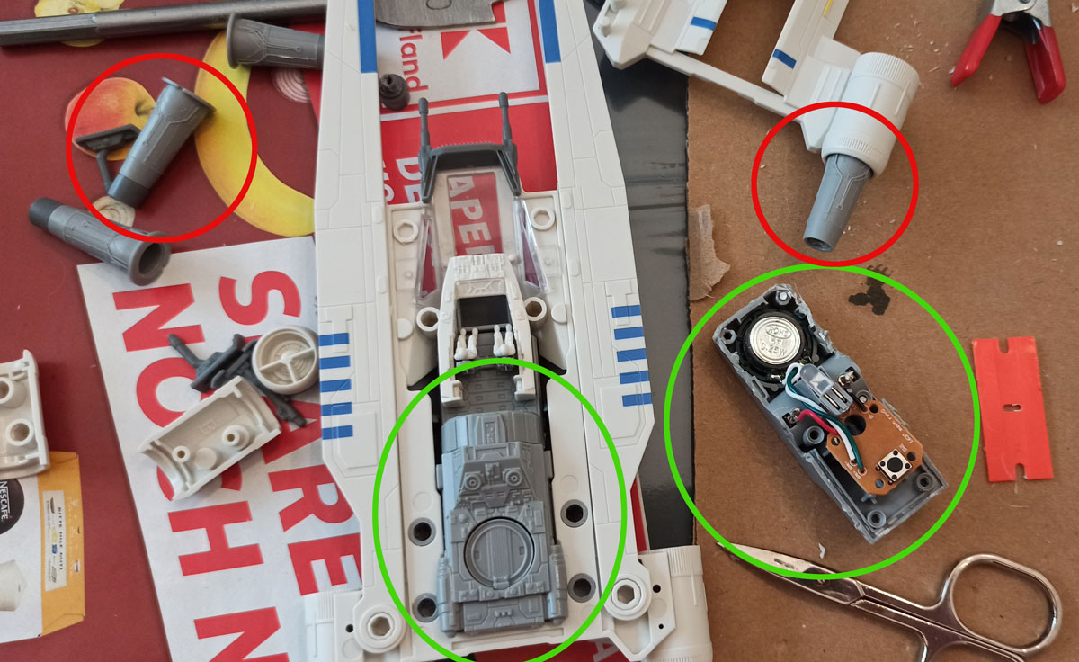 Da wir eh gerade dabei sind alles kaputt zu machen, das Kit kommt mit einem Licht- und Soundmodul (grün) und Triebwerksendstücken mit Kappe (rot). Letztere lässt sich relativ einfach durch kräftiges drehen entfernen, das erleichtert später das Einsetzen der blauen 3mm LEDs. Eine Führung dafür bohre ich direkt mit, das ist nicht auf den Bildern zu sehen, aber hey, es it ein Loch durch ne Röhre, bekommt man hin.