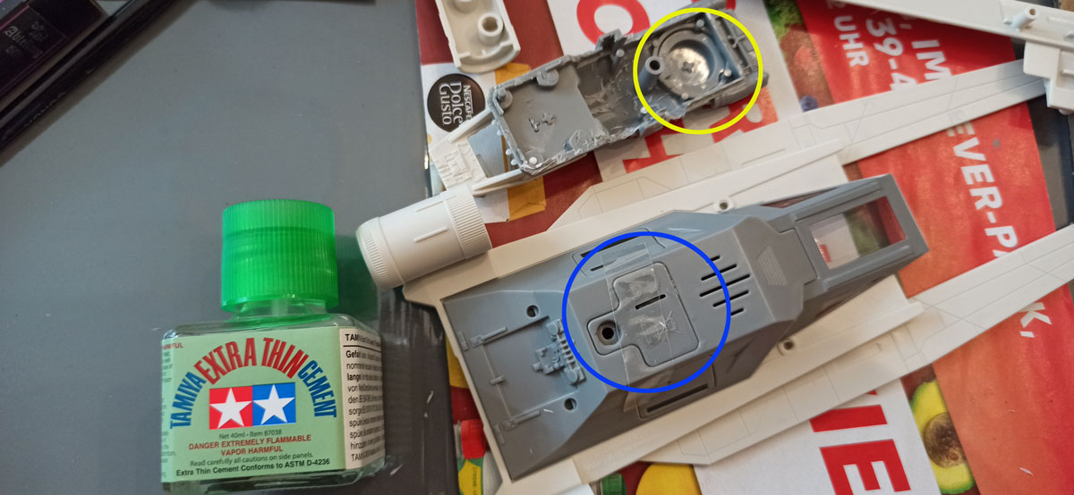 Das Batteriefach (blau) klebe ich direkt mit Tamiya Extra Thin Cement in den Rumpf, sichere es wärend des ablüftens mit etwas Tesa, damit die Kante gerade abschließt und ich später weniger Spachtel brauche. Die runde Luke, die eigentlich der Knopf für die Effekte ist wird ebenfalls eingeklebt, hier muss man auf eine mittige Ausrichtung achten da er funktionsbedingt natürlich etwas Spiel hat.