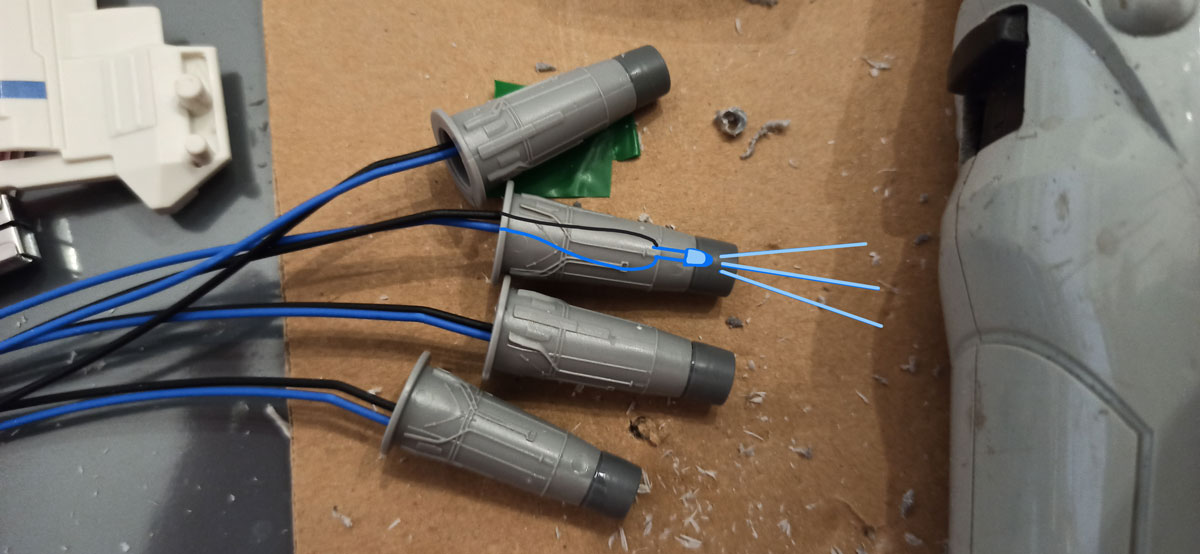 Dann verstaue ich die 4 blauen 3mm LEDs in den Endstücken der Triebwerke und klebe die Endkappe wieder an: