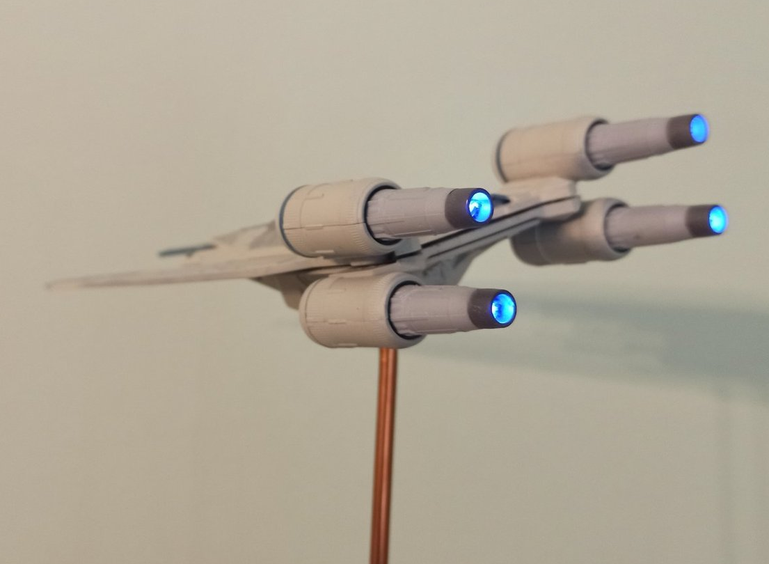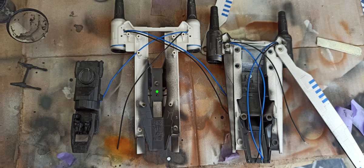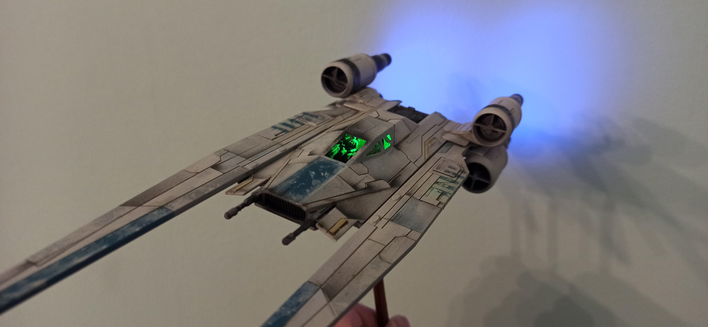Wenn die LEDs sicher in den Triebwerken verstaut sind kann man mit der Ober- und Unterhälfte des U-Wings verbinden. Es ist möglich ein im 45 Grad Winkel angesetztes Loch zu bohren, dann sieht man das Kabel von aussen überhaupt nicht. Klappte bei mir in 3 von 4 Fällen wunderbar