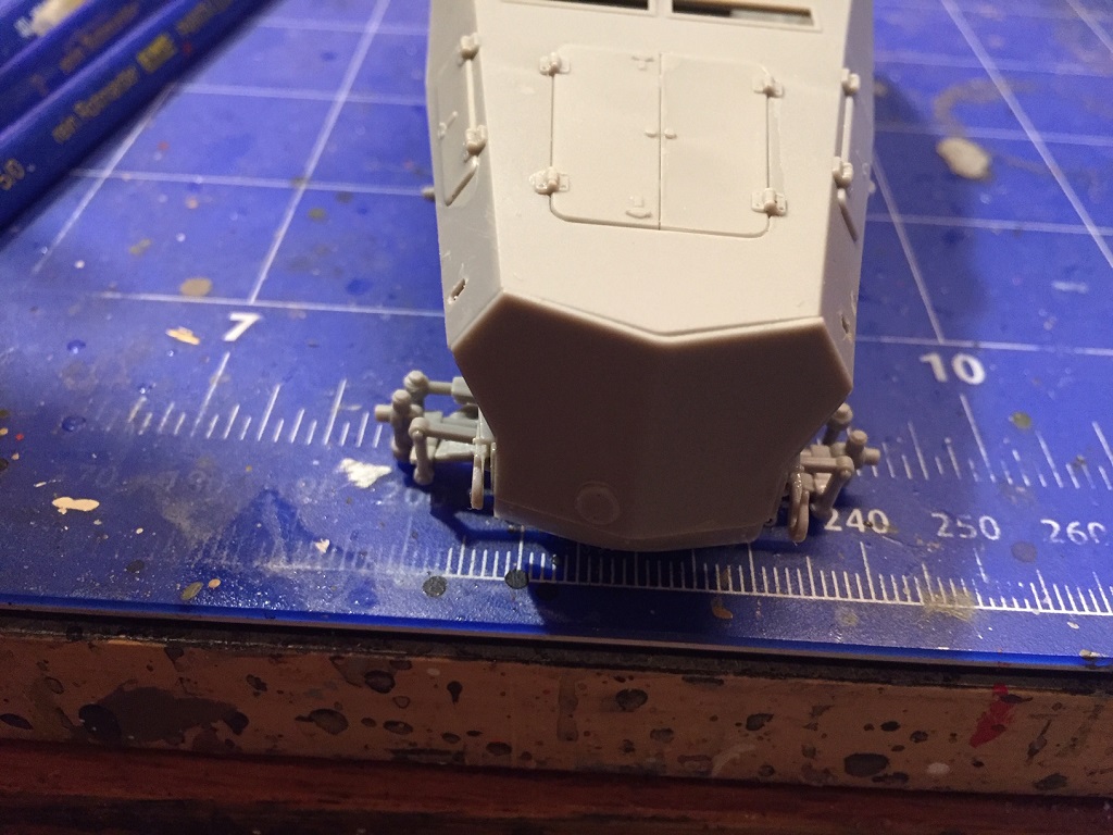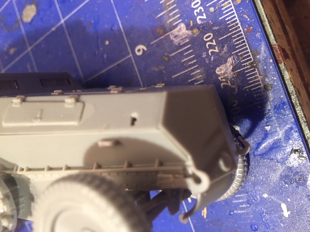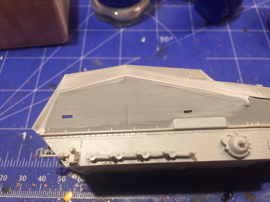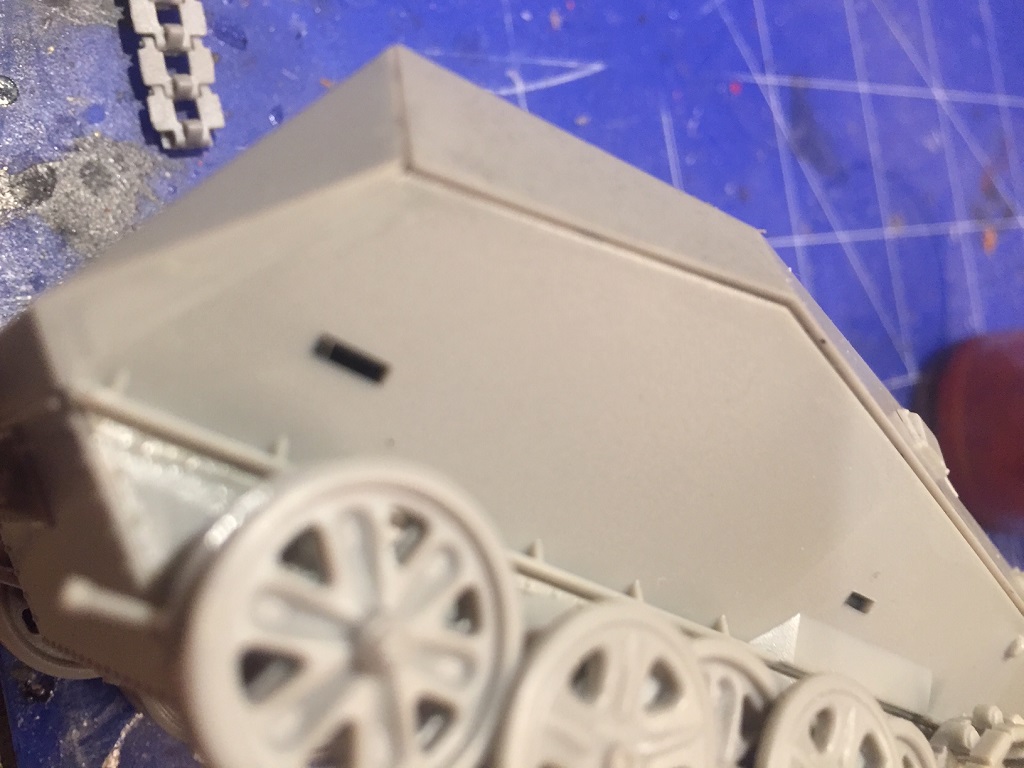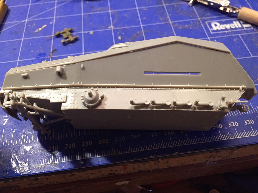 An der Seite dieser " Überstand " des oberen Bleches. Wenn man sich nun die Originalbilder anschaut, fällt auf das dieser " Überstand " auf der linken Seite nicht zu sehen ist. Auf der rechten Seite erkennt man jedoch einen leichten Schatten. Vielleicht hat sich Dragon hiervon inspirieren lassen, auch einen " Überhang " darzustellen. Ich vermute das es beim Zusammenbau der Wanne keine Spannformen gab, sondern das die Bleche von Hand zusammengefügt und dann verschweißt wurden. Sodas es zu leichten Ungenauigkeiten kommen konnte. Auf machen Fotos sieht man auch keine Schweißnähte mehr, in diesem Fall scheinen die Naht mit Schleifhexen geglättet worden sein. Ich werde bei meinem Greif diese Nähte auch verspachteln. In der Länge schein mein Modell gut zu passen.