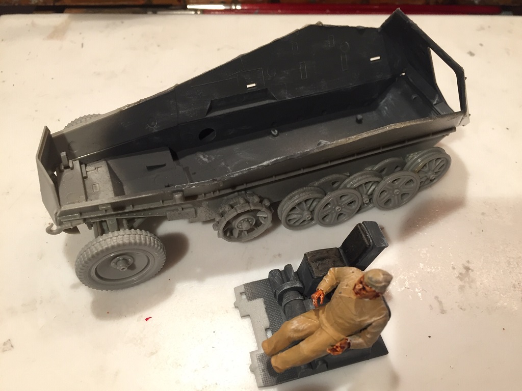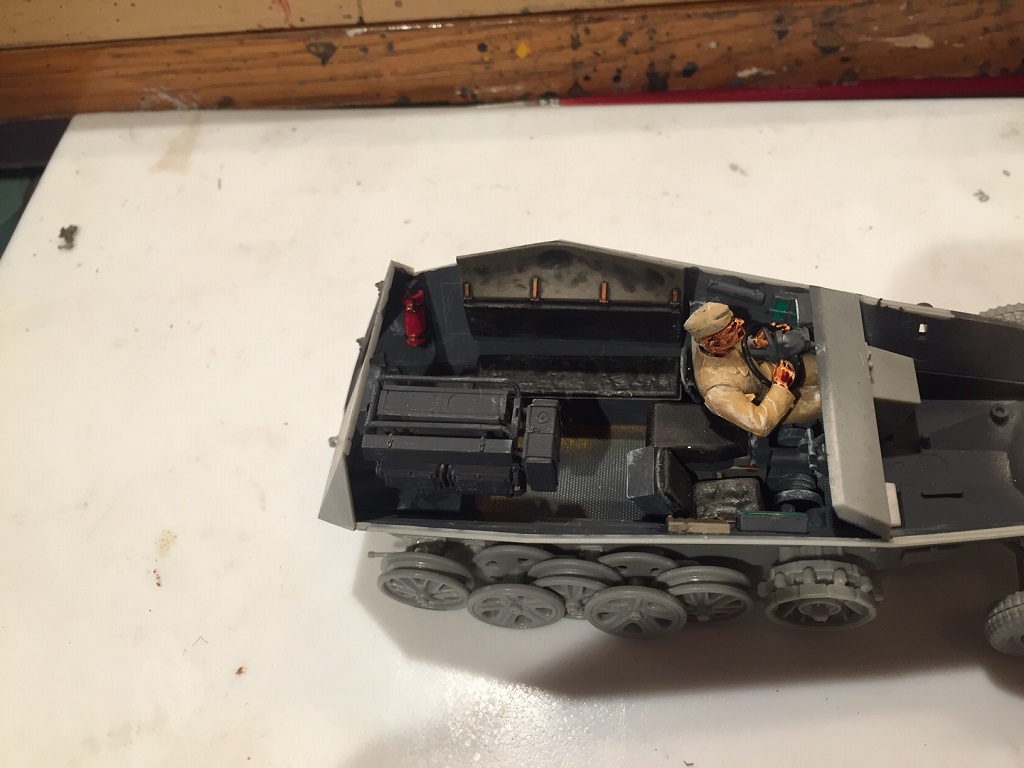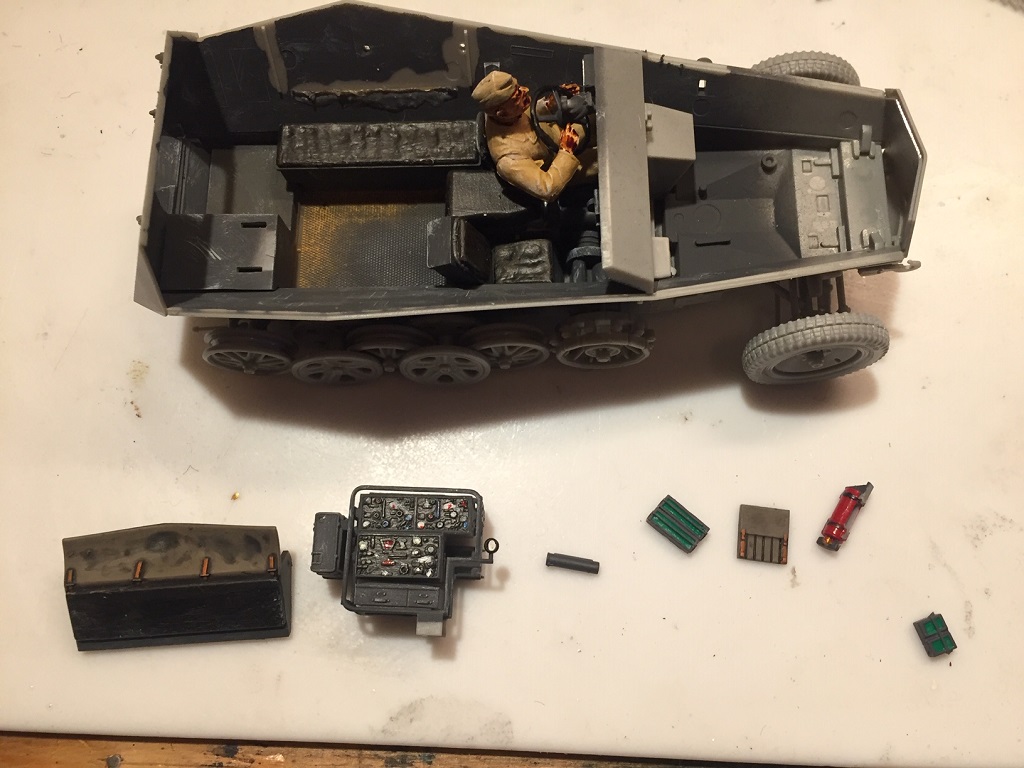 Neben der Kette bin ich auch mit dem Innenraum angefangen. Nach meinen Informationen waren alle Fahrzeuge innen grau und erst bei der Außenlackierung wurde der Einsatzort berücksichtigt ( oder auch nicht, dann mußte umlackiert werden bzw. am Zielort nachgetarnt werden.) Dragon / Revell legt einen Fahrer bei, leider passt er nicht in den Greif, weil er eigentlich für den Borgward IV Ausf. A vorgesehen war.