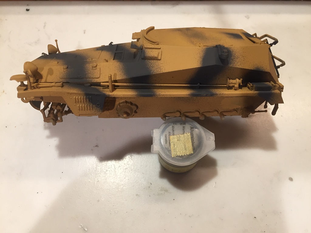 Die Kettenbleche werden, entgegen dem Bauplan ( wegen pass Problemen ) ohne Anbauteile ans Modell geklebt und erst dann mit den Kleinteilen bestückt.