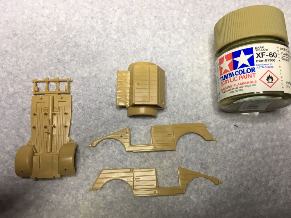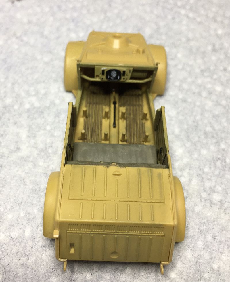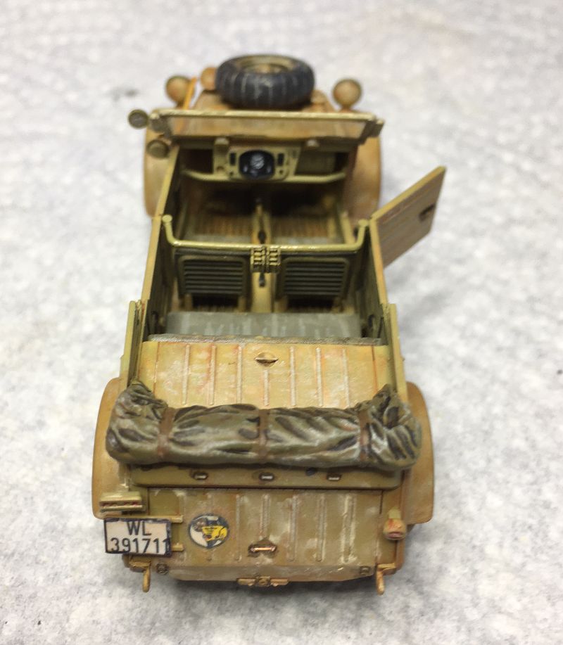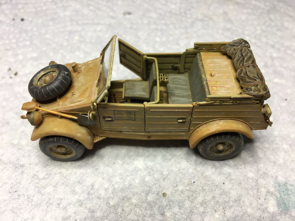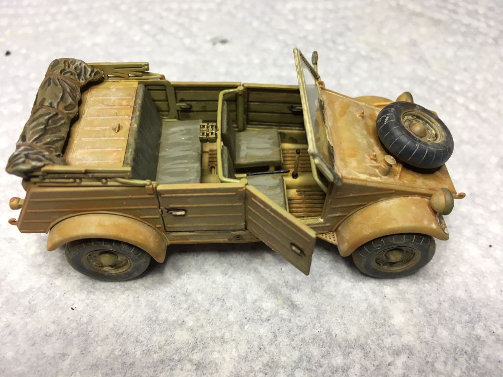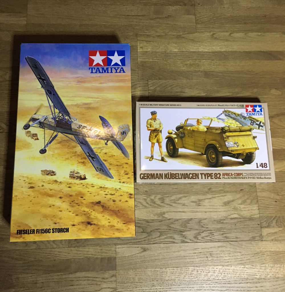 Da ich den Storch auf eine provisorische Wüstenpiste stellen möcht, wird der Kübelwagen von Tamiya gleich mit verarbeitet.