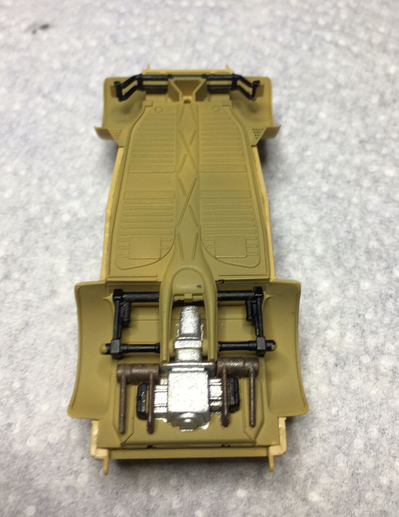Der Kleine wird grundiert mit Tamiya XF 60 und Innenraum und Antrieb schon mal mit dem Pinsel detailliert.