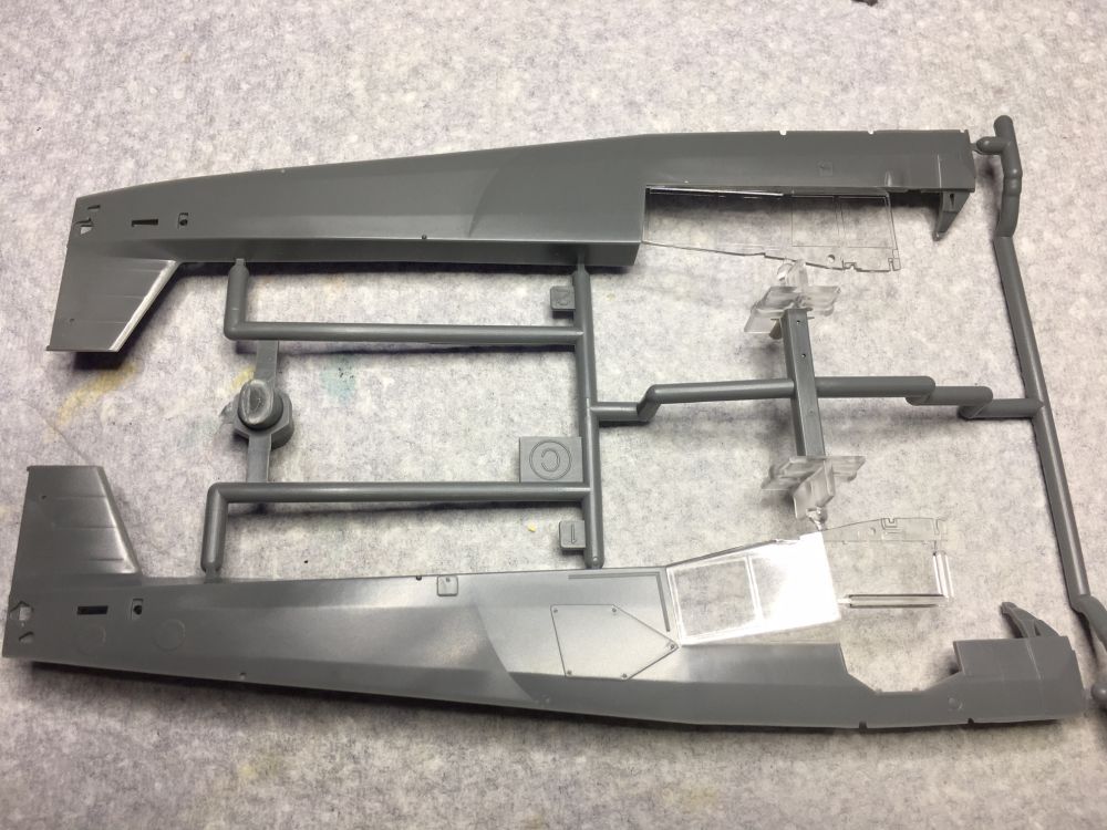 Nun schon mal ein Bild der beiden Rumpfhälften. Hier sind die großen Klarsichtteile direkt angegossen.