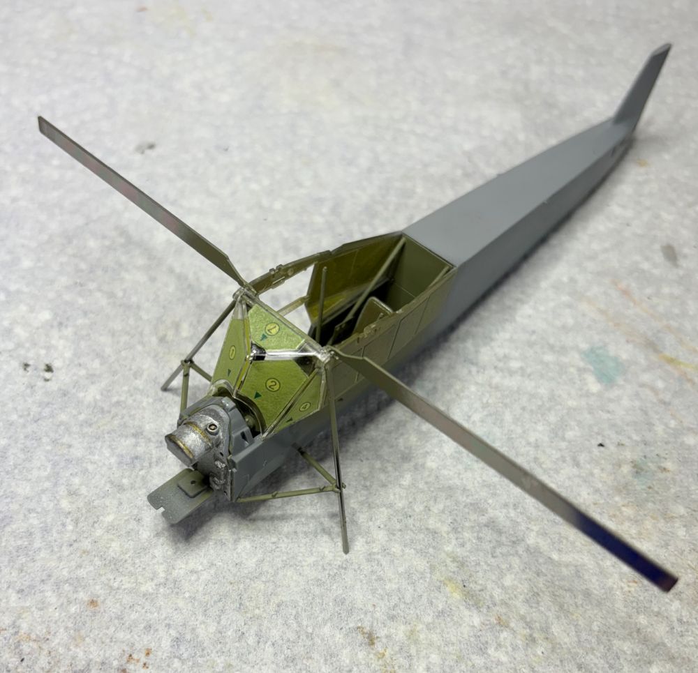Auch das vordere Schott mit dem Öltank sowie die Frontscheibe sind an Ort und Stelle. Alles passte super und der Spachtel konnte in der Tube bleiben. Beim Blick ins Cockpit fehlt noch der Pilotensitz.