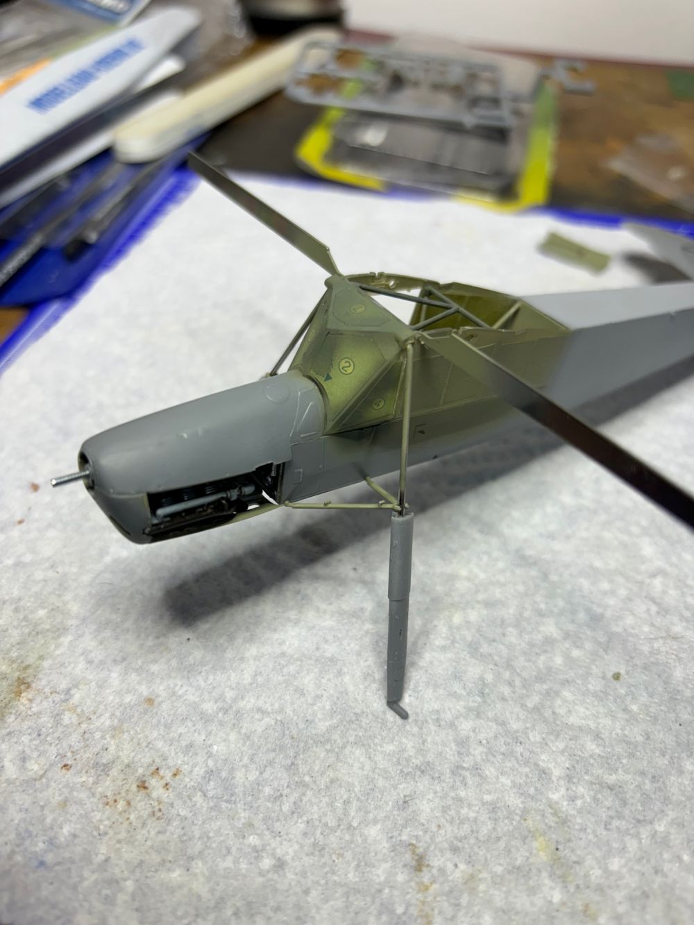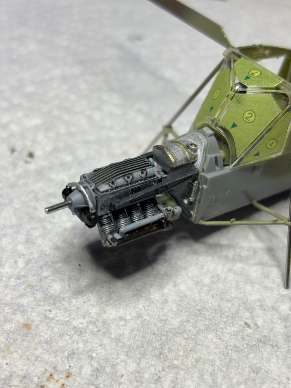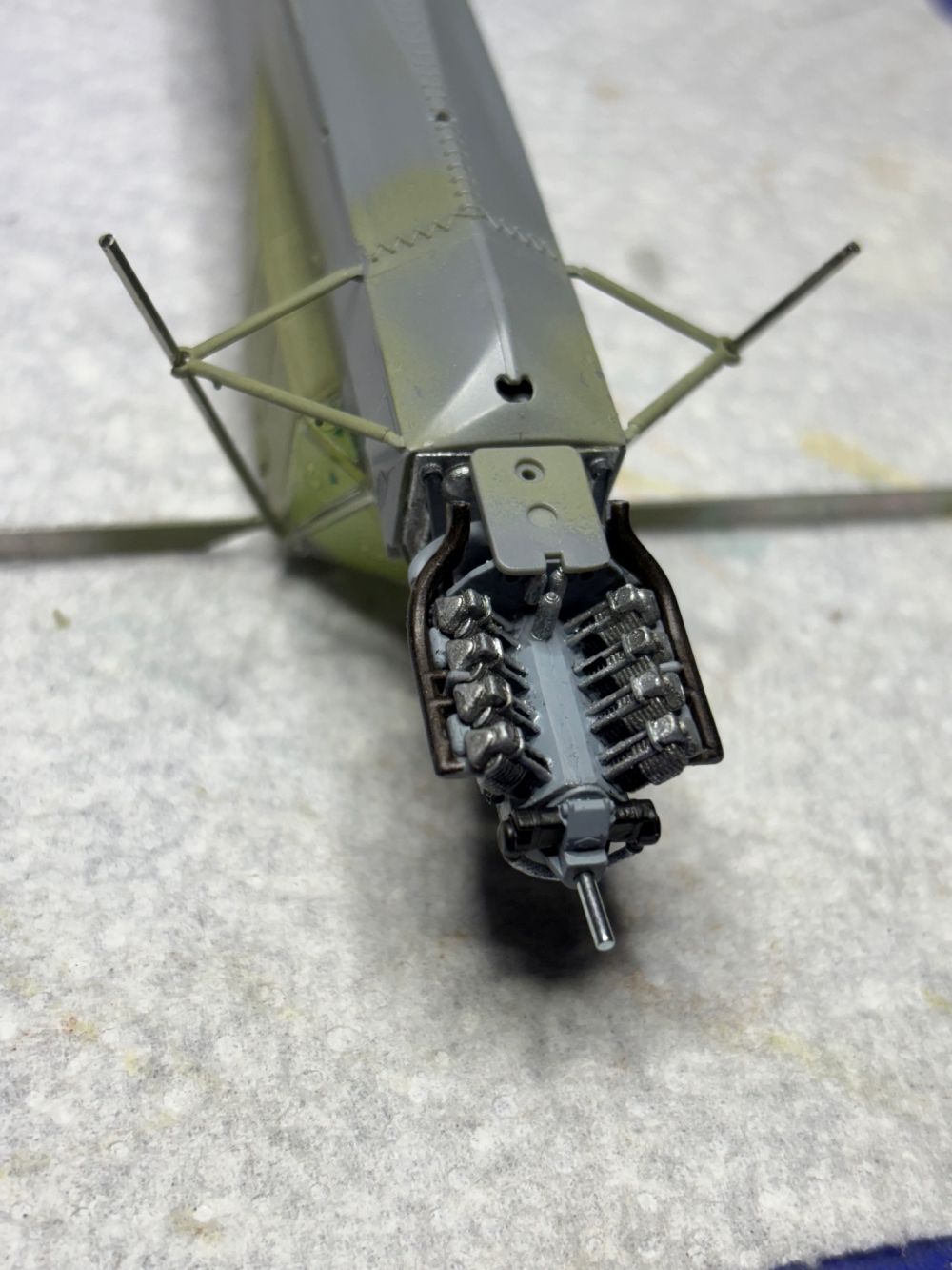 Auch die Motorabdeckungen von oben und unten wurden bereits verklebt und die recht filigrane Verstrebung des Fahrgestells am Metall befestigt.