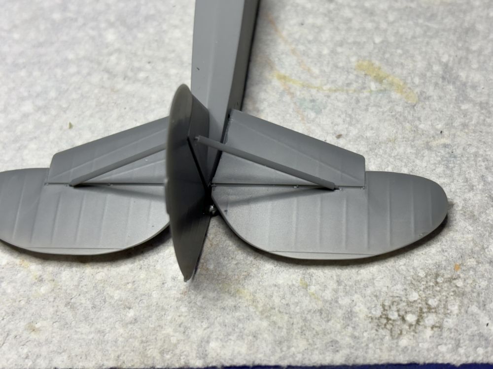 Danach wurden noch Seiten- und Höhenleitwerk montiert. Auch dieses ist sehr schön ausgeführt. Allerdings gab es hier die erste kleine Ungenauigkeit. Die Montagezapfen am Höhenleitwerk waren zu lang und mussten gekürzt werden. Trotzdem gab es beidseitig einen kleinen Spalt zu verschließen. Mit Acrylspachtel und Wasser zu Glattziehen war dies jedoch schnell erledigt.
