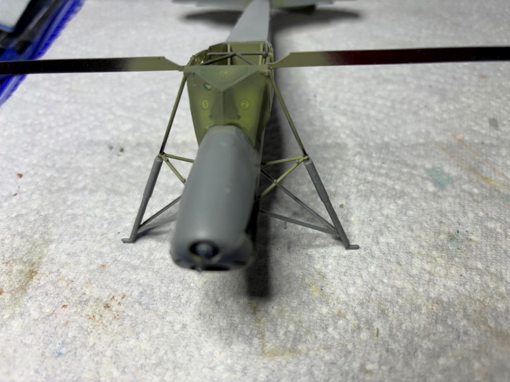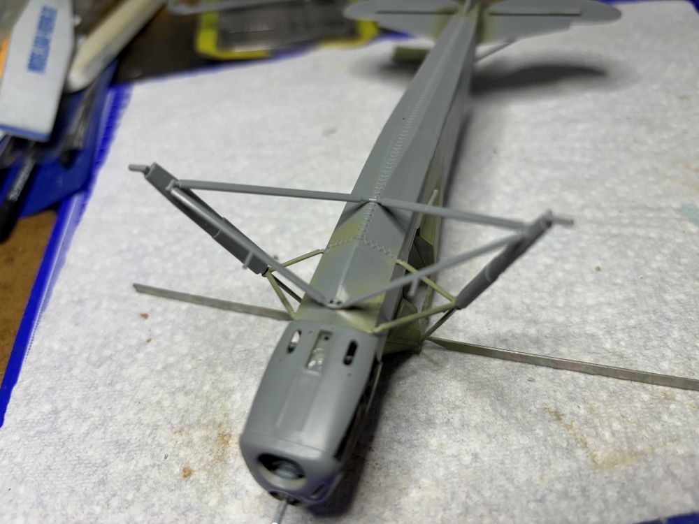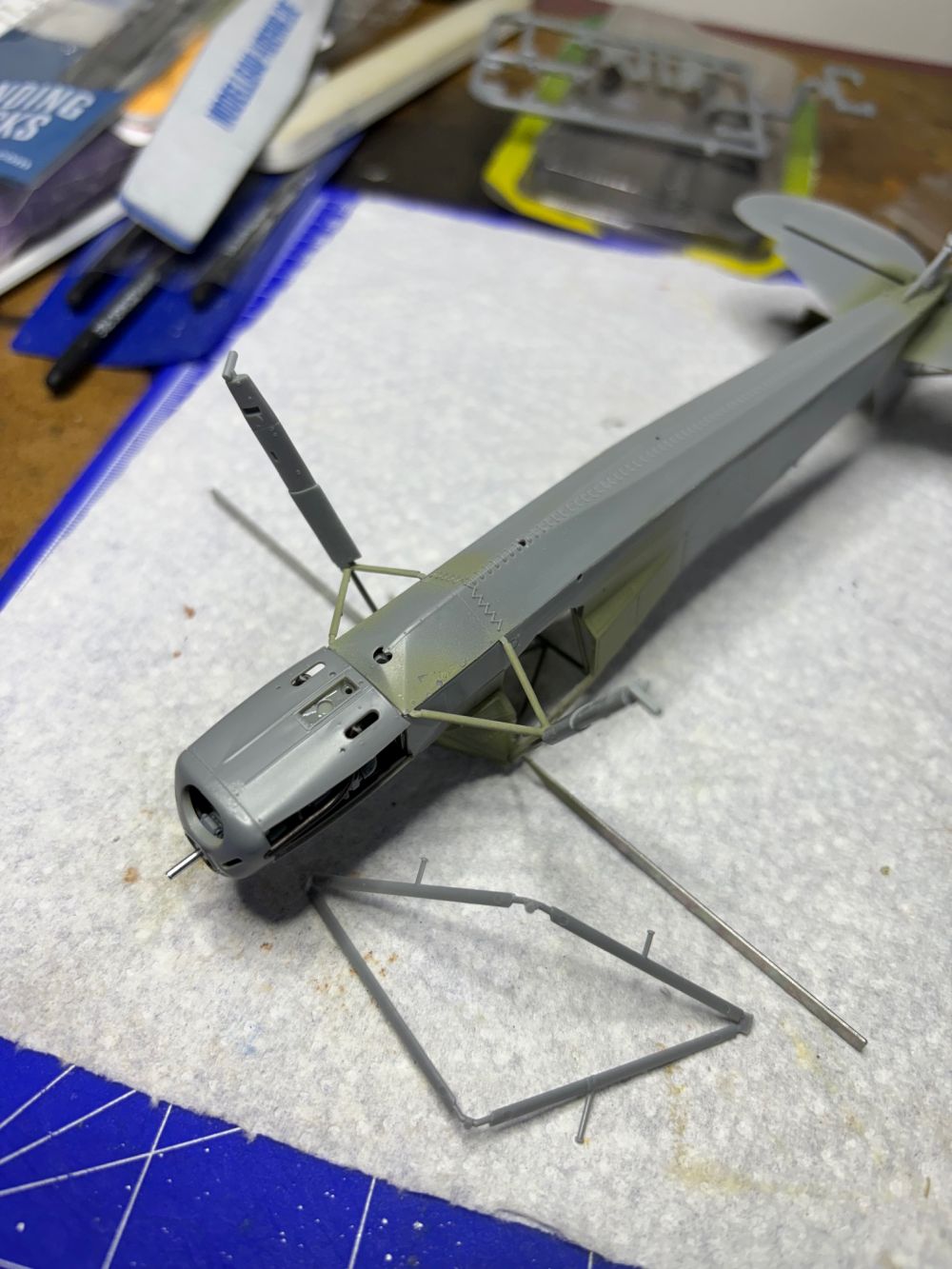 Weiterhin wurden die Streben zur Flügelmontage und die Storchenbeine verklebt. Beides besteht zur besseren Stabilität aus Metall.