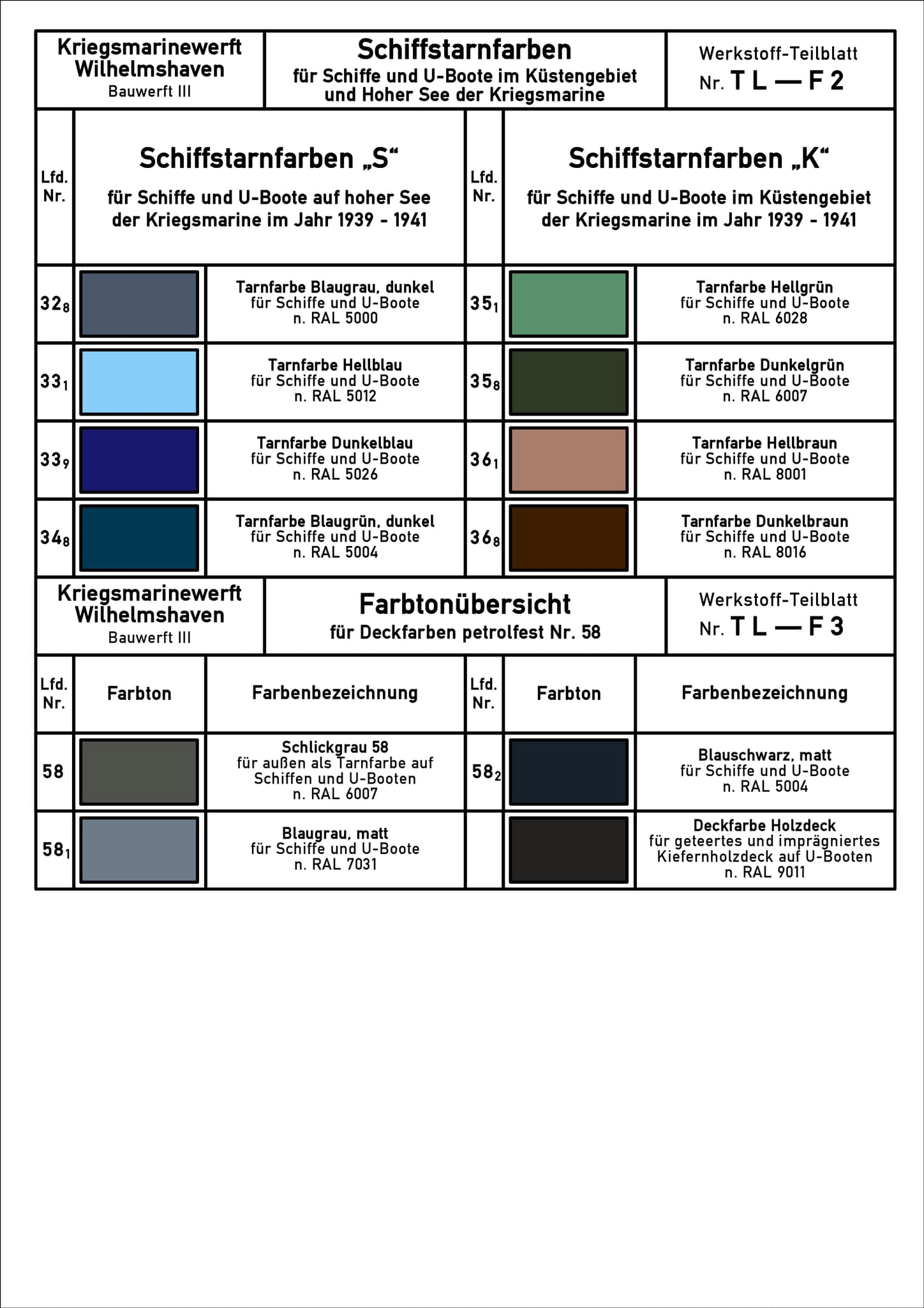Eben gerade habe ich einen Beitrag in einer Modellbaugruppe auf Facebook gesehen, in dem jemand Revell-Farbtafeln für die Kriegsmarinewerft Wilhelmshaven postete. Natürlich sind die nicht historisch, sondern eben für die Modelle angefertigt. Kannte ich aber so noch nicht.