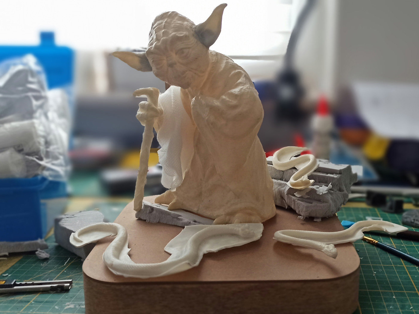 Der Schlachtplan sieht wie folgt aus: Yoda soll eine neue Pose, Kleidung und natürlich eine Diorama Base bekommen. Ist schließlich kein Gartenzwerg. Vorgestellt habe ich mir einen ausgestreckten Arm, etwa als wenn er gerade den X-Wing auf Dagobah aus dem Wasser hebt. Das ganze auf schlammigen, mit Blättern überzogenem Grund, ein paar Steinen, und natürlich dürfen die Schlangen nicht fehlen. Sowohl die Schlangen als auch der Stab sind nur von einer Seite gegossen. die andere ist hohl. Daher fülle ich den Stab direkt mit Thermoplastik auf, Die Schlangen lasse ich erst einmal wie sie sind. Mache aber vorsichthalber mal Silikonformen davon.