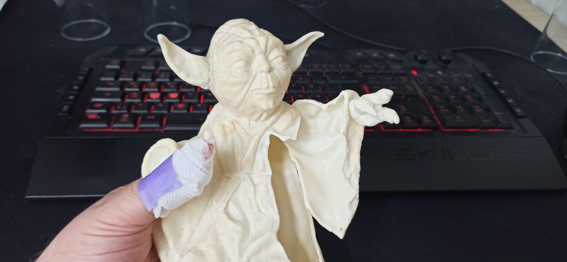 Es geht ans eingemachte: Der angewinkelte Arm wird großflächich abgeschnitten, was nicht ganz ohne Zwischenfälle Verläuft. Zum Glück war ein Stück Verband, der eigentlich für Yodas Kleidung sein sollte, griffbereit. Tape drum und weiter gehts.