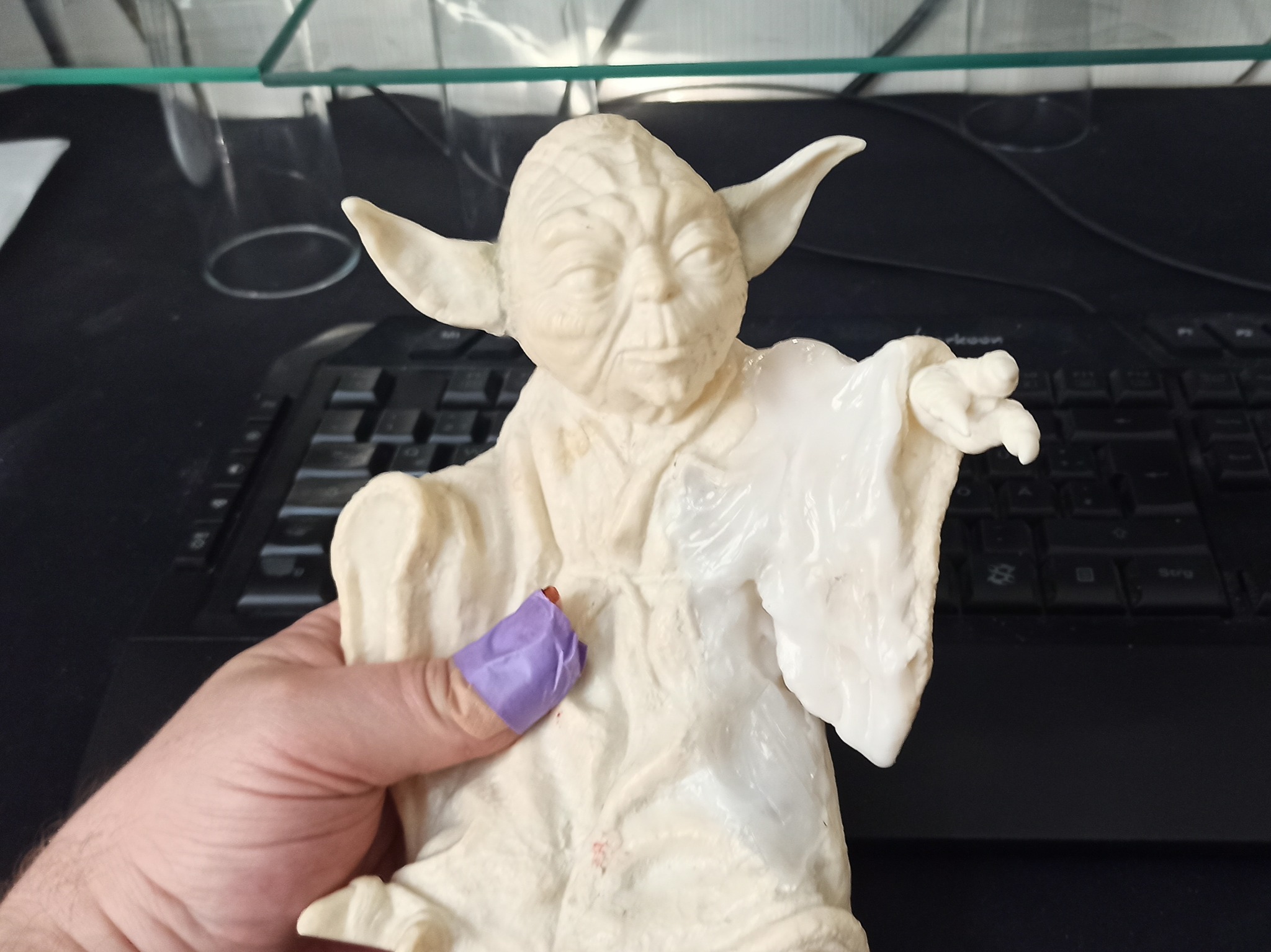 Ich habe das Kit gebraucht auf Kleinanzeigen gesehen und konnte nicht wiederstehen. Die Ohren hatte schonmal wer versucht anzukleben und die Verpackung, Anleitung und die eigentlich dazugehörigen Haare für Yoda fehlten leider. Im Grunde kann ich nicht einmal sagen ob es sich um ein Original oder um einen Abguß des Originals handelt. Vom ersten Eindruck her fand ich die Details sehr soft, was für einen Abguß sprechen würde.