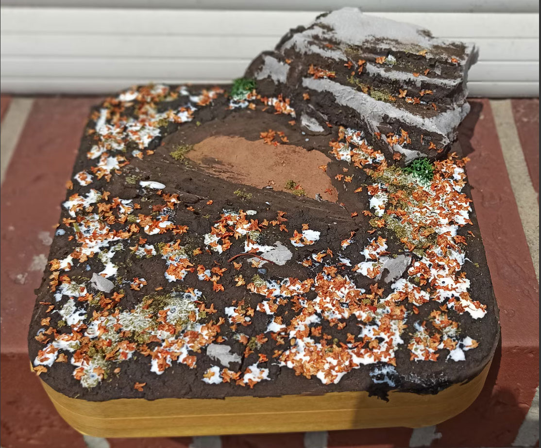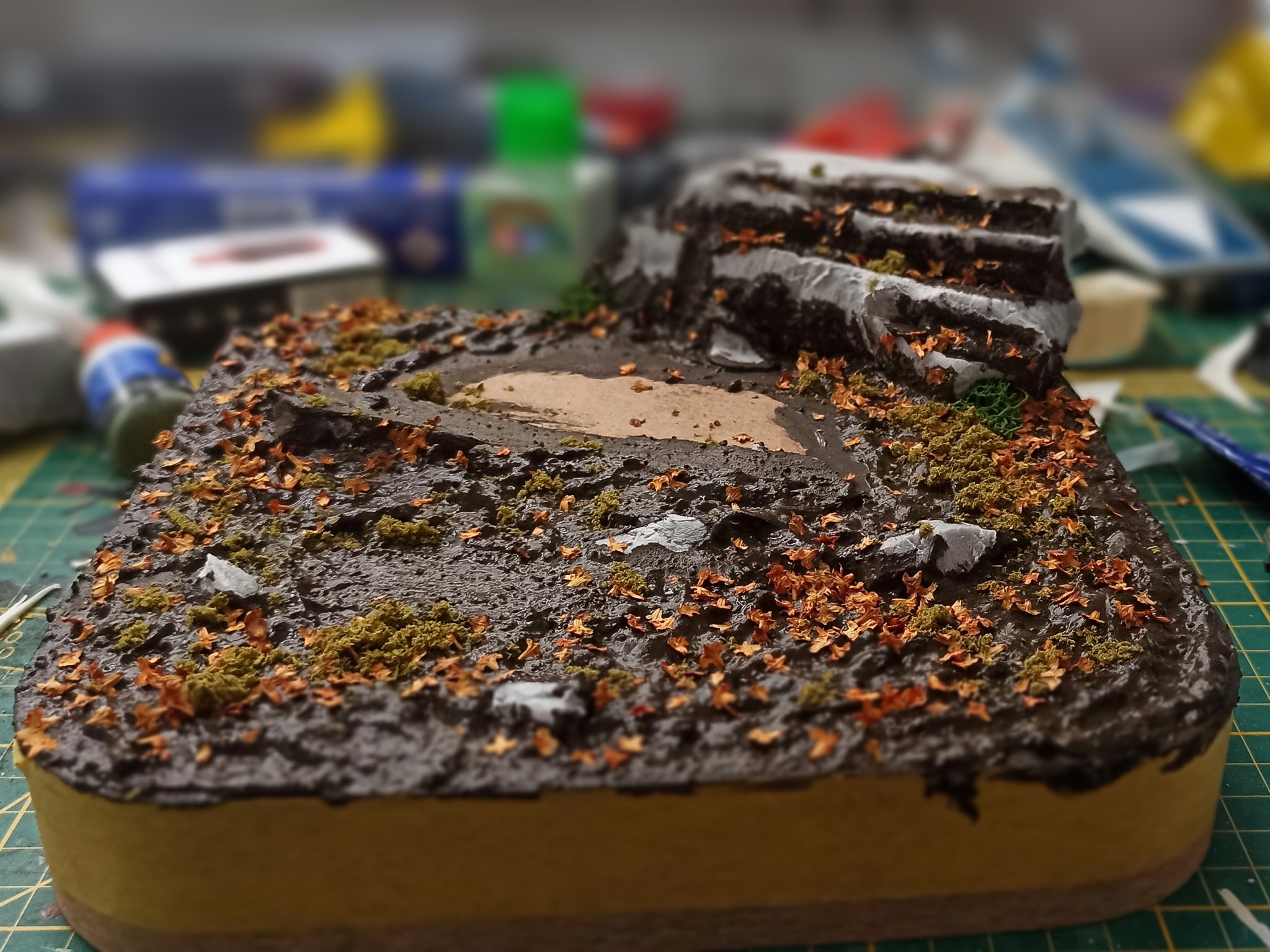 Auf der Base verteile ich eine Mischung aus Acrylfarbe, Bastelkleber und Gips. Den Bereich für Yoda lasse ich dabei relativ frei, damit ich später etwas flexibler in der Positionierung bin. Das Ganze bestreue ich noch mit Blättern, Grünzeug und "Moos" aus gefärbten Sägespänen. Die Hartschaum Steine habe ich vorher noch mit Feile und Drahtbürste etwas bearbeitet um sie realistischer wirken zu lassen.
