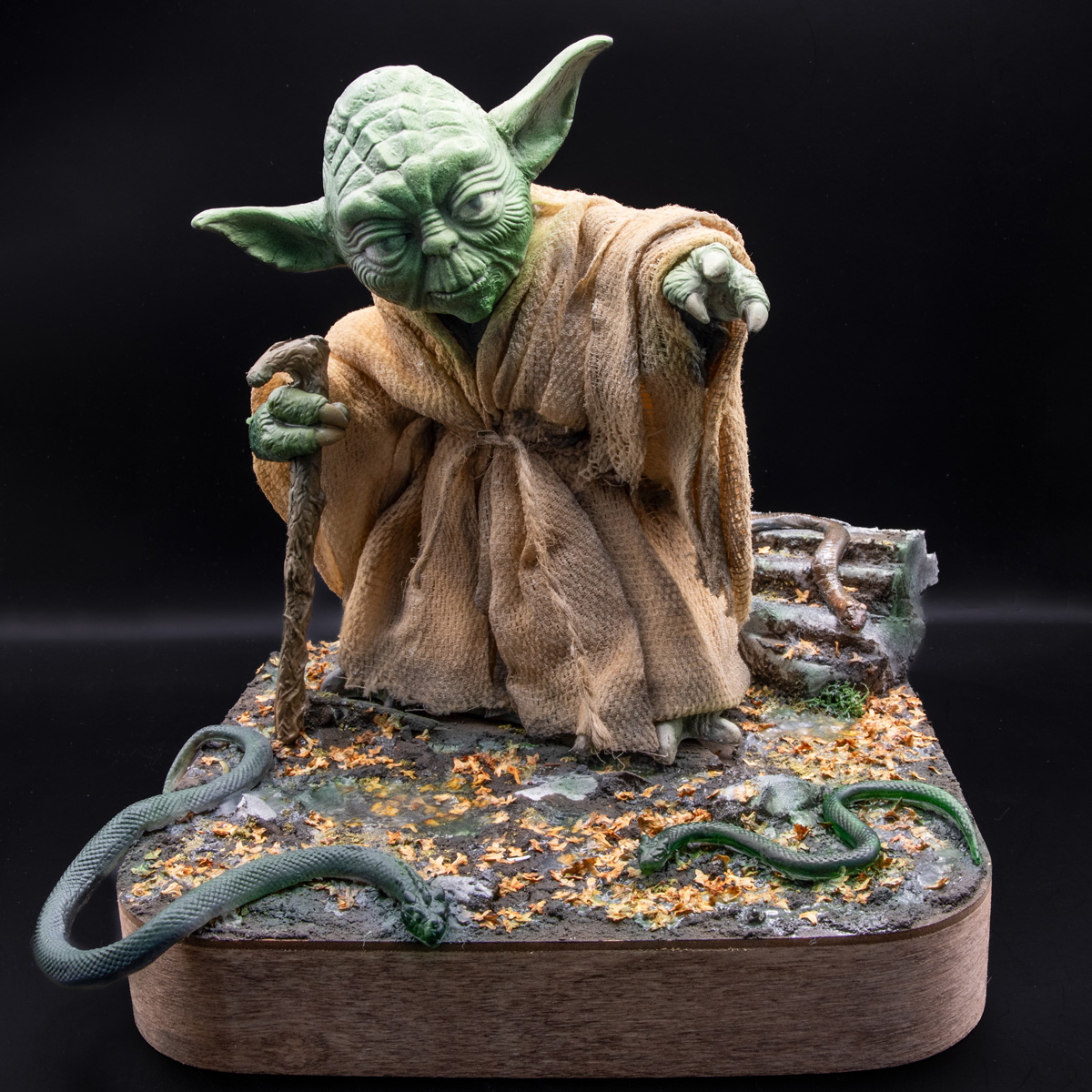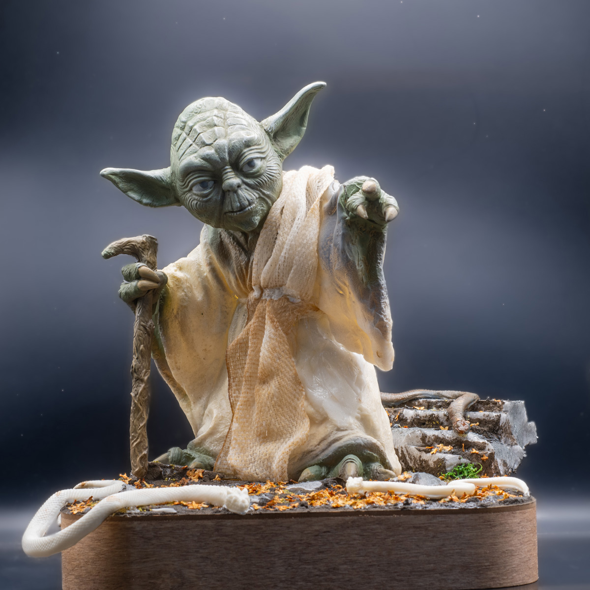 Yoda hat mittlerweile erste Farbe bekommen. Die Beiden Schlangen im Vordergrund sind noch die originalen, die im Hintergrund auf dem Stein ist die mit Milliput nachgeformte. Die große vorne würde ich gerne über den Rand der Base lappen lassen, ich denke davon werde ich zumindest auch noch einen Abguß machen müssen, da das Vinyl recht steif ist, und das sie unten offen und hohl sind hilft auch nicht gerade. Fürs Gewand nehme ich wieder mein Verbandszeug, mittlerweile Kaffee-gefärbt und mit einem Wasser-Kleber-Mix in Form gebracht. Zum Bergfest gönnen wir uns mal ein anständiges Foto:
