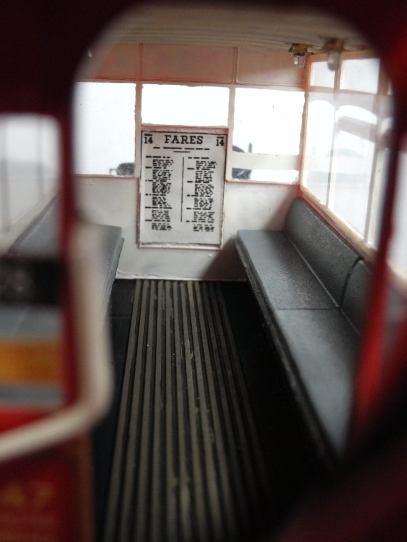 Nicht nur einen Fahrpreistafel, sondern auch Deckenleuchten aus durchsichtigen Material waren vorgesehen. Und dass alle Werbetafeln sowie die Fahrpreistafel aus Papier waren, steigert eigentlich den Vorbildtreue-Effekt, weil das war ja in Natura auch aus Papier. Wo ich damals nachlässig war, will ich nicht verheimlichen: Auf den Rückseiten der Bänke prangen nicht nur viele Auswerfermarken, sondern auch die Teilenummern!