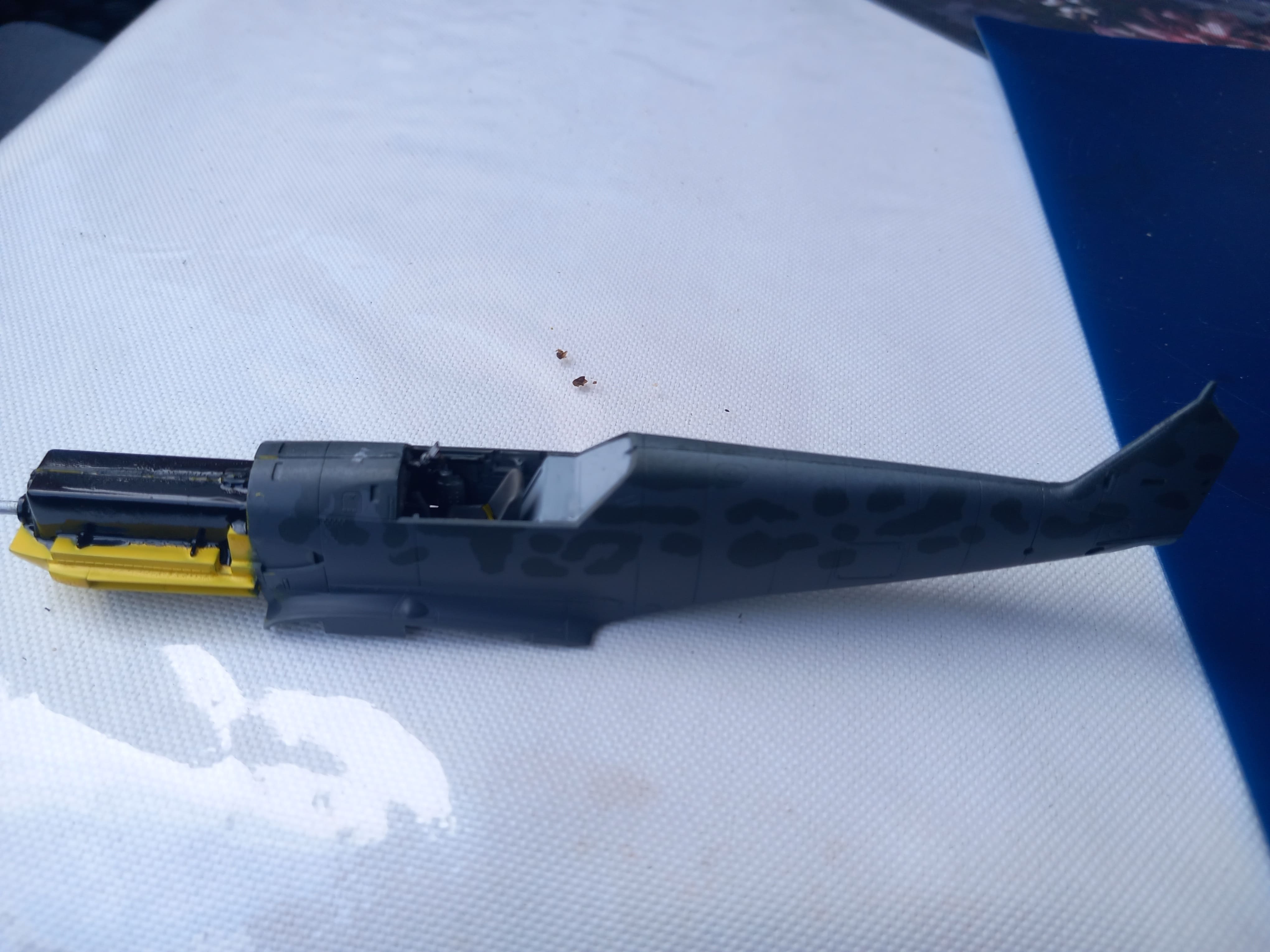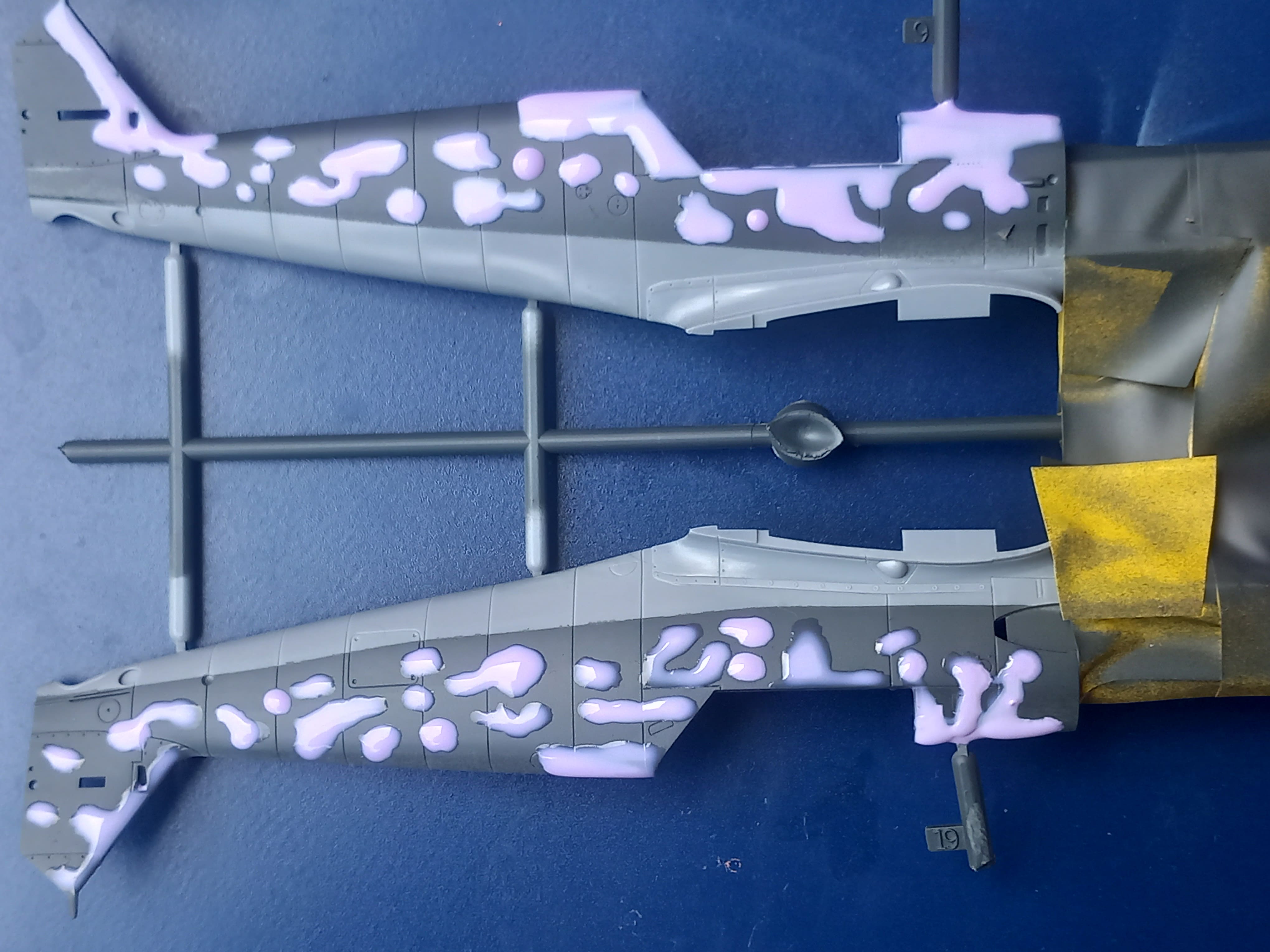 Die unteren Rumpfhälften wurden abgedeckt und die oberen wurden in Grüngrau lackiert. Das ganze trocknen lassen und dann die Tarnflecken, die Grüngrau bleiben sollen, mit Maskol abgedeckt. Ich nutze diese Maskiermasse heute zum ersten Mal und bin gespannt auf das Ergebnis. Wenn die Masse trocken ist kommt die Graue Farbe darüber. Dann soll das Zeug abgepuhlt werden.