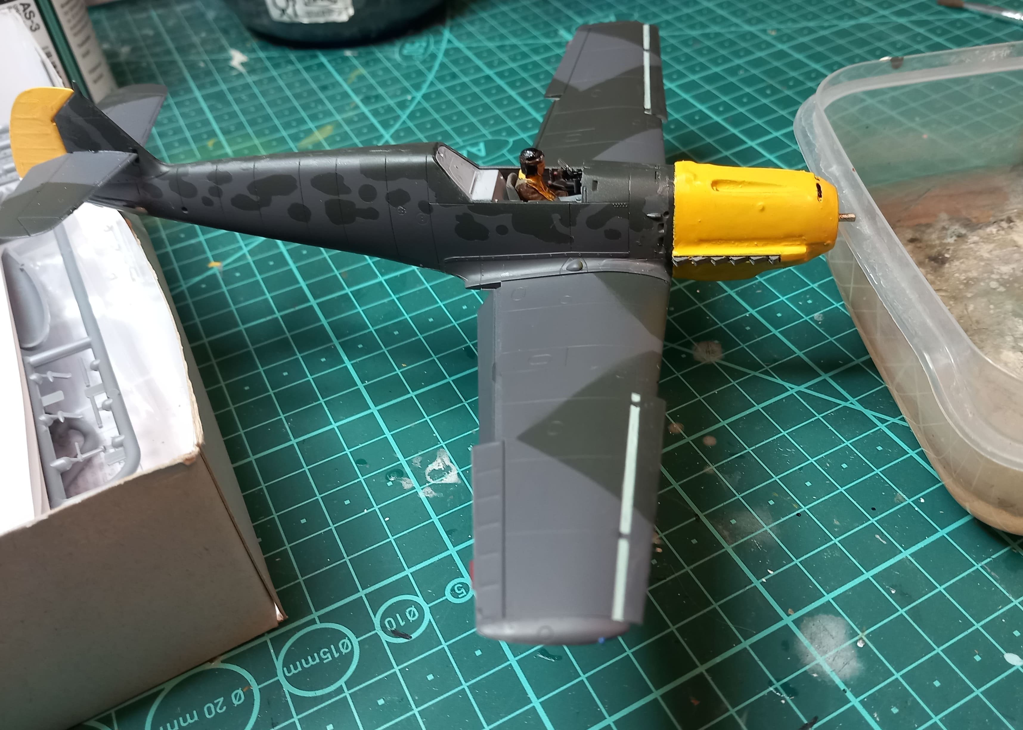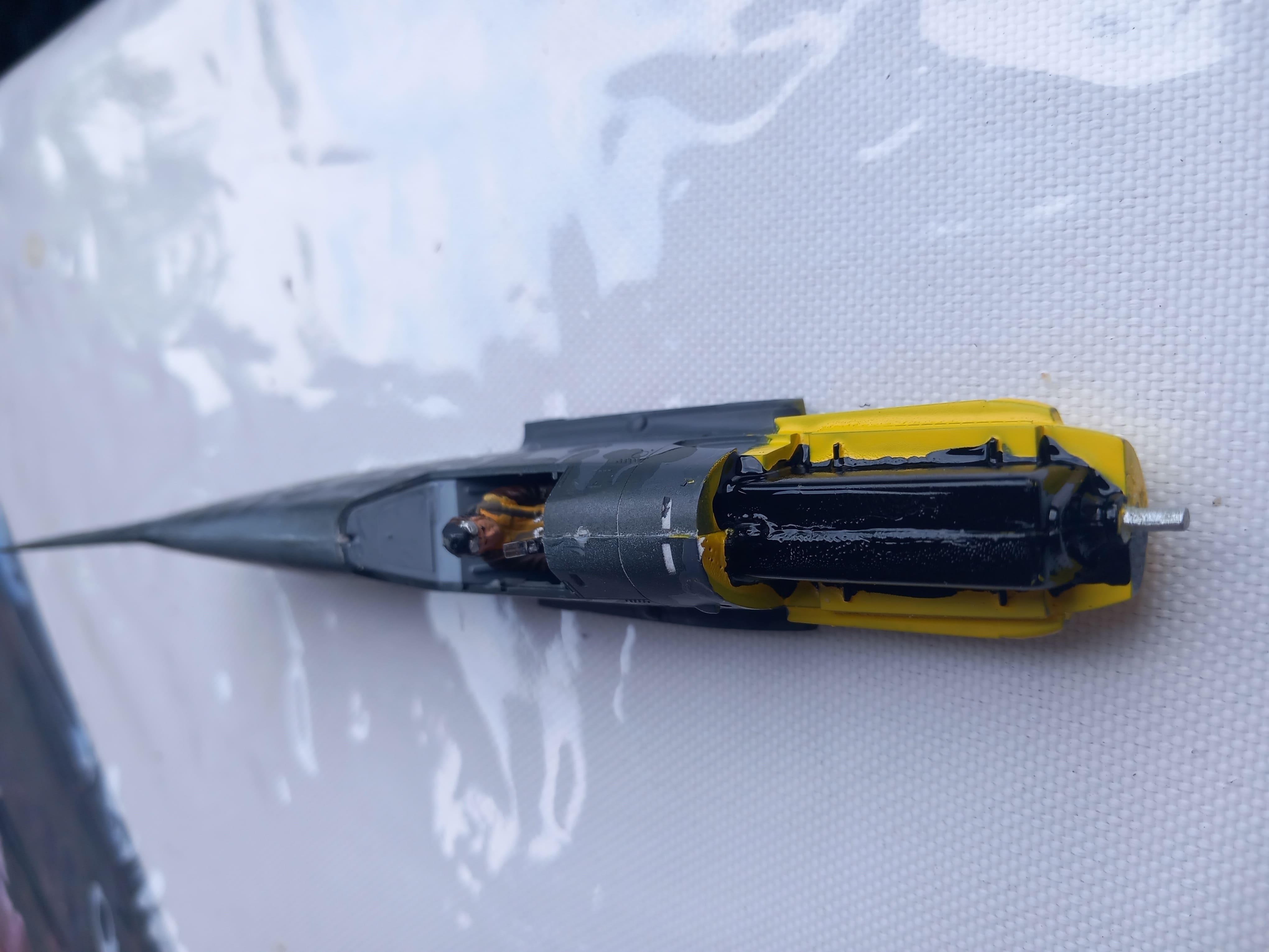 Danach Motorblock in schwarz und untere Rumpfhälfte in gelb bemalt.