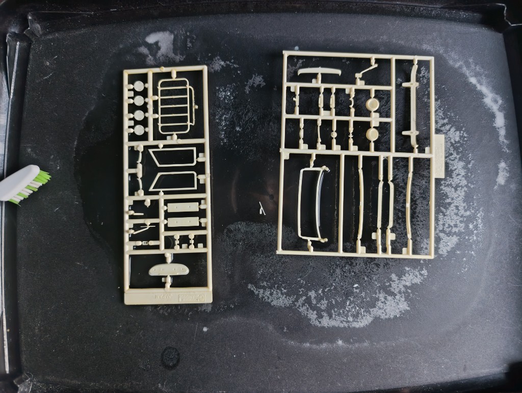 Der Bausatz von Gunze macht an sich erstmal nicht viel her und ist eher einfach gehalten. Erschienen bereits 1985 und in dieser Auflage 1992 auf den Markt erschienen. Die Teile sind sauber und übersichtlich. Das Fahrzeug besteht zu einem Großteil nur aufs dem Fahrzeug Oberteil, ergänzt durch den Fahrgastbereich. Hierfür reichen auch nur die Wanne und Unterseite, zwei weiße Gußrahmen, zwei verchromte Guß Rahmen und einen Gußrahmen mit Weichplastik. Aber das reicht mir persönlich nicht: