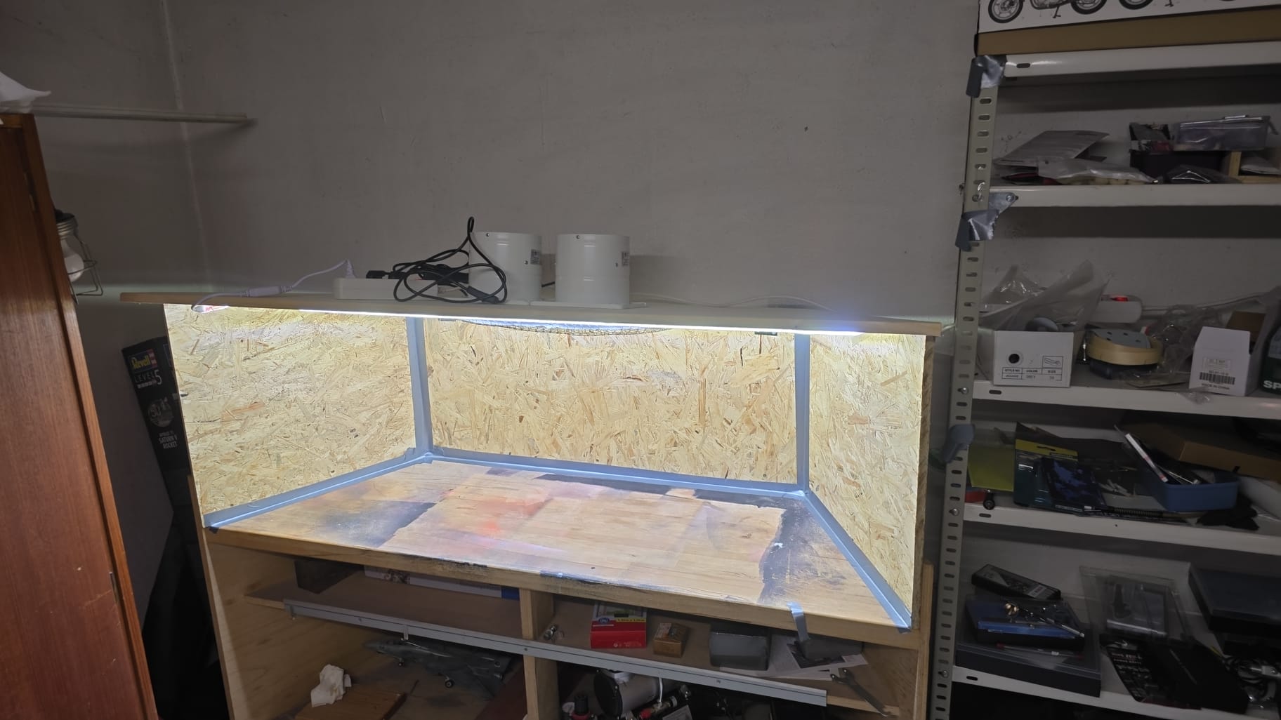 Dazu habe ich zwei Badezimmerlüfter mit je 550L/h eingebaut, dazu ein Flies und Aktivkohlefilter und als Lichtquelle ein LED Band verklebt.