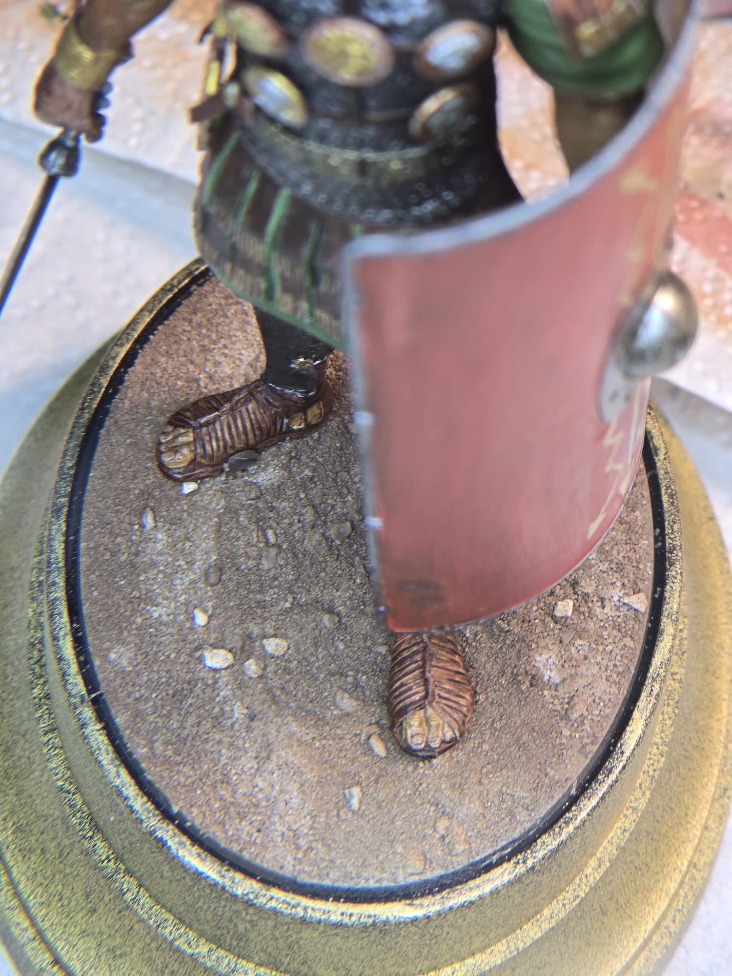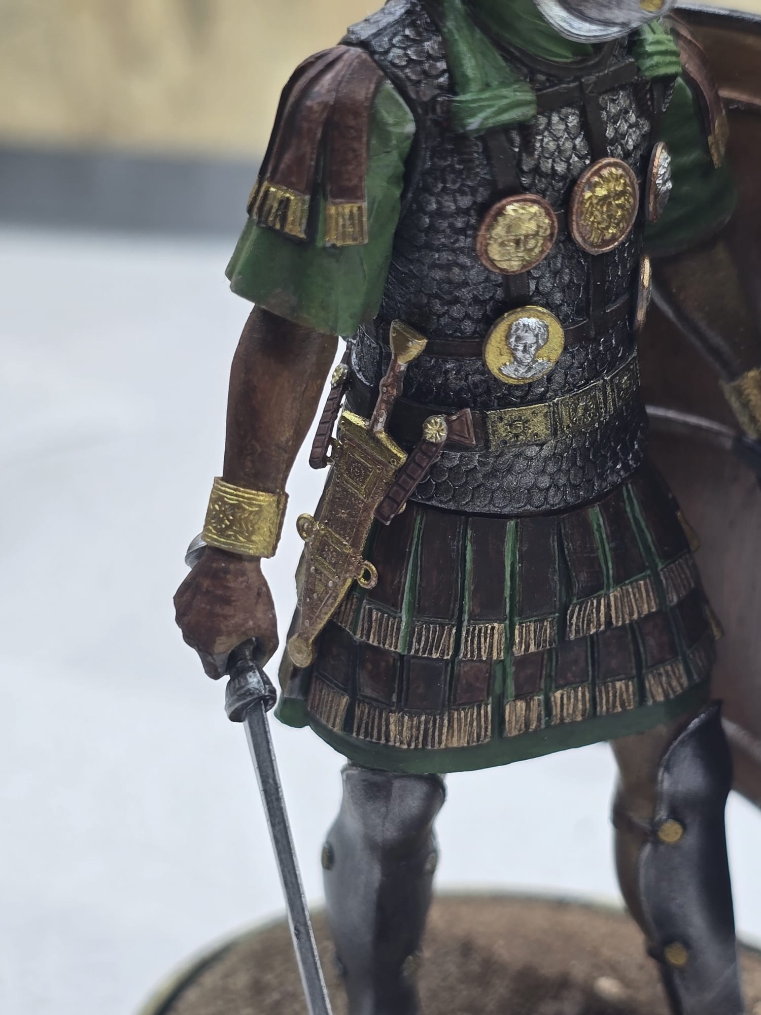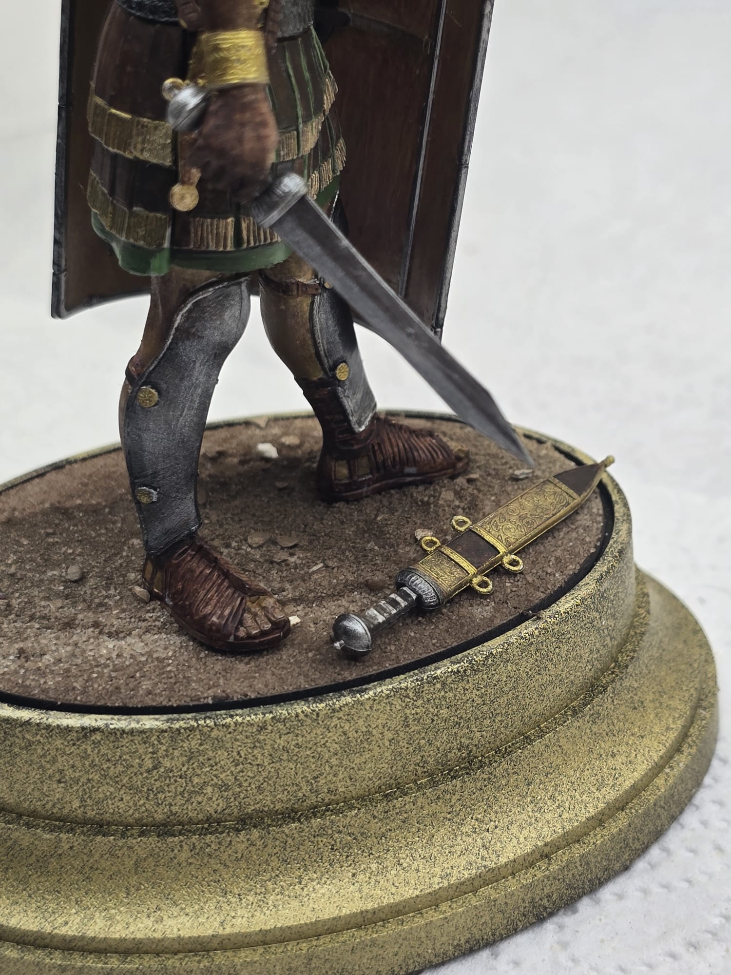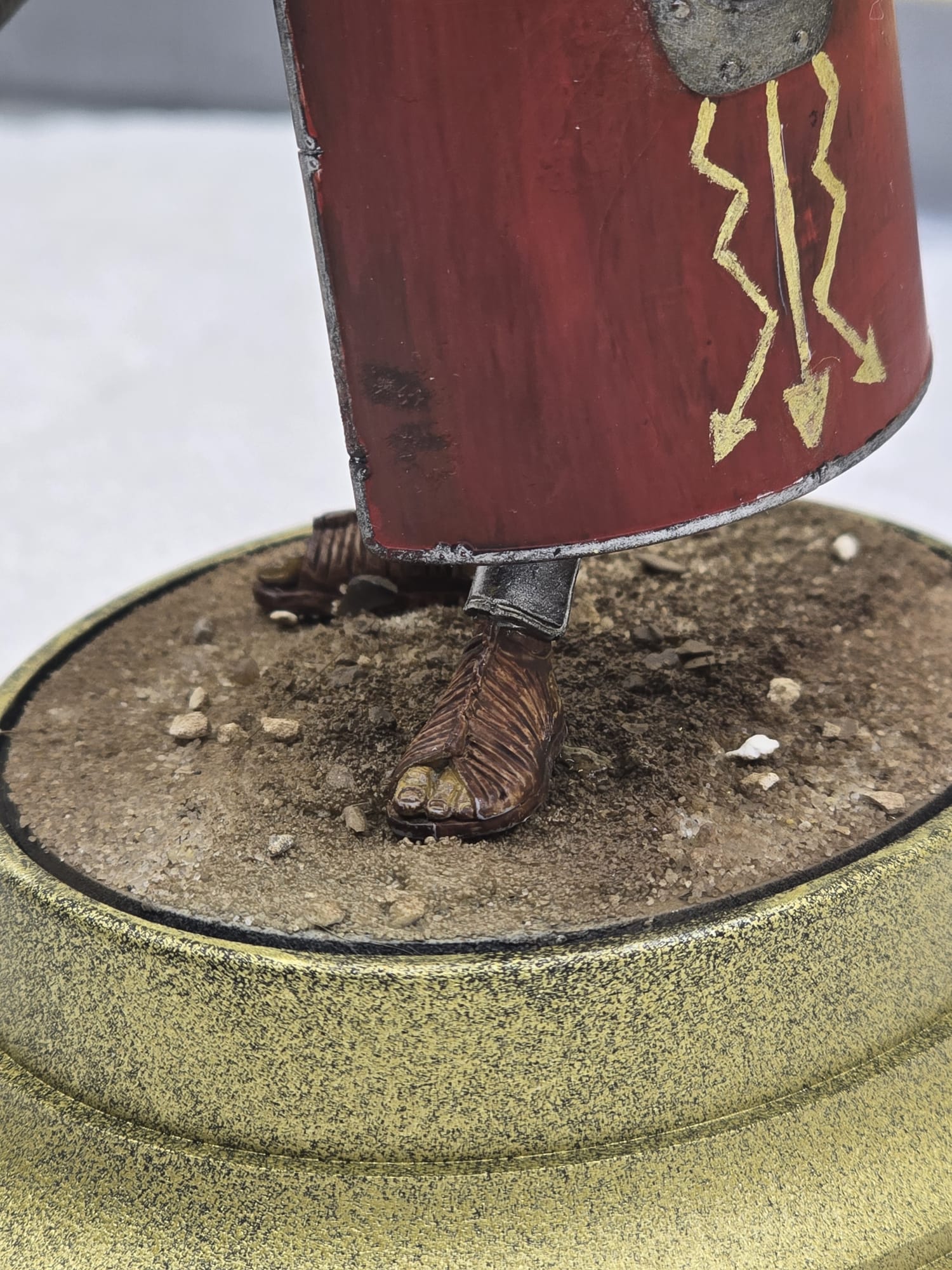 Der Helm und Beinschutz wie auch Schwert sind absichtlich nicht so hochglanzpoliert. Ich bin der Meinung, dass im Feld dazu keine Zeit war. Da wurde gekämpft, gegessen und geschlafen. Darum auch die abgenutze, fleckige Tunika, etc. Der Schild ist handbemalt und die ganze Figur nur mit Pinsel bemalt. Nur der güldene Sockel ist mit der Airbrush gemacht.