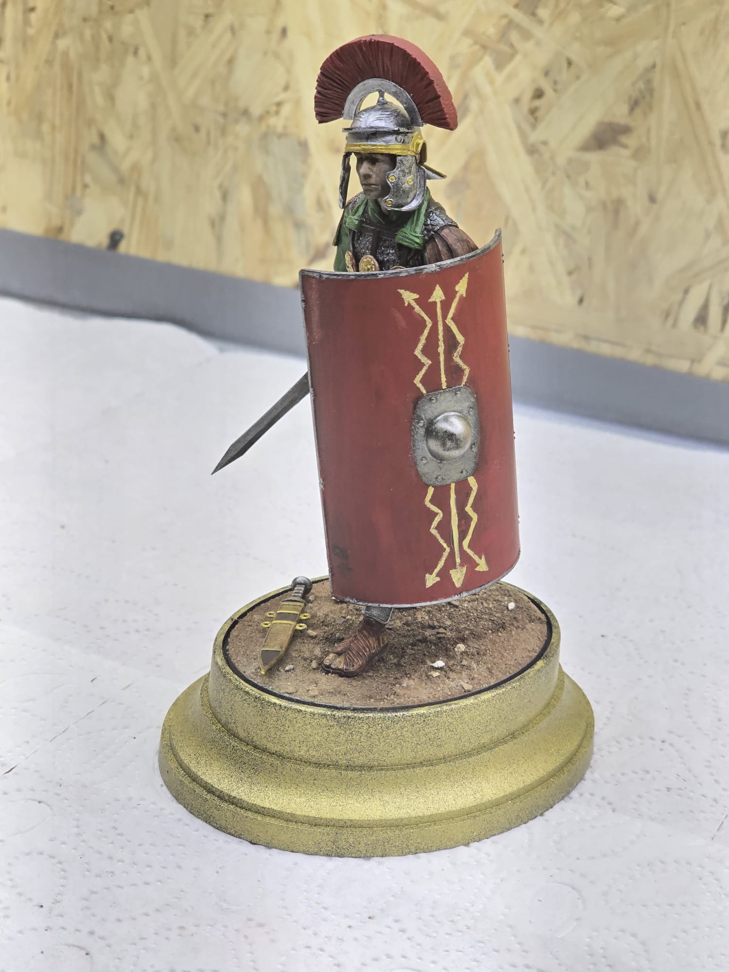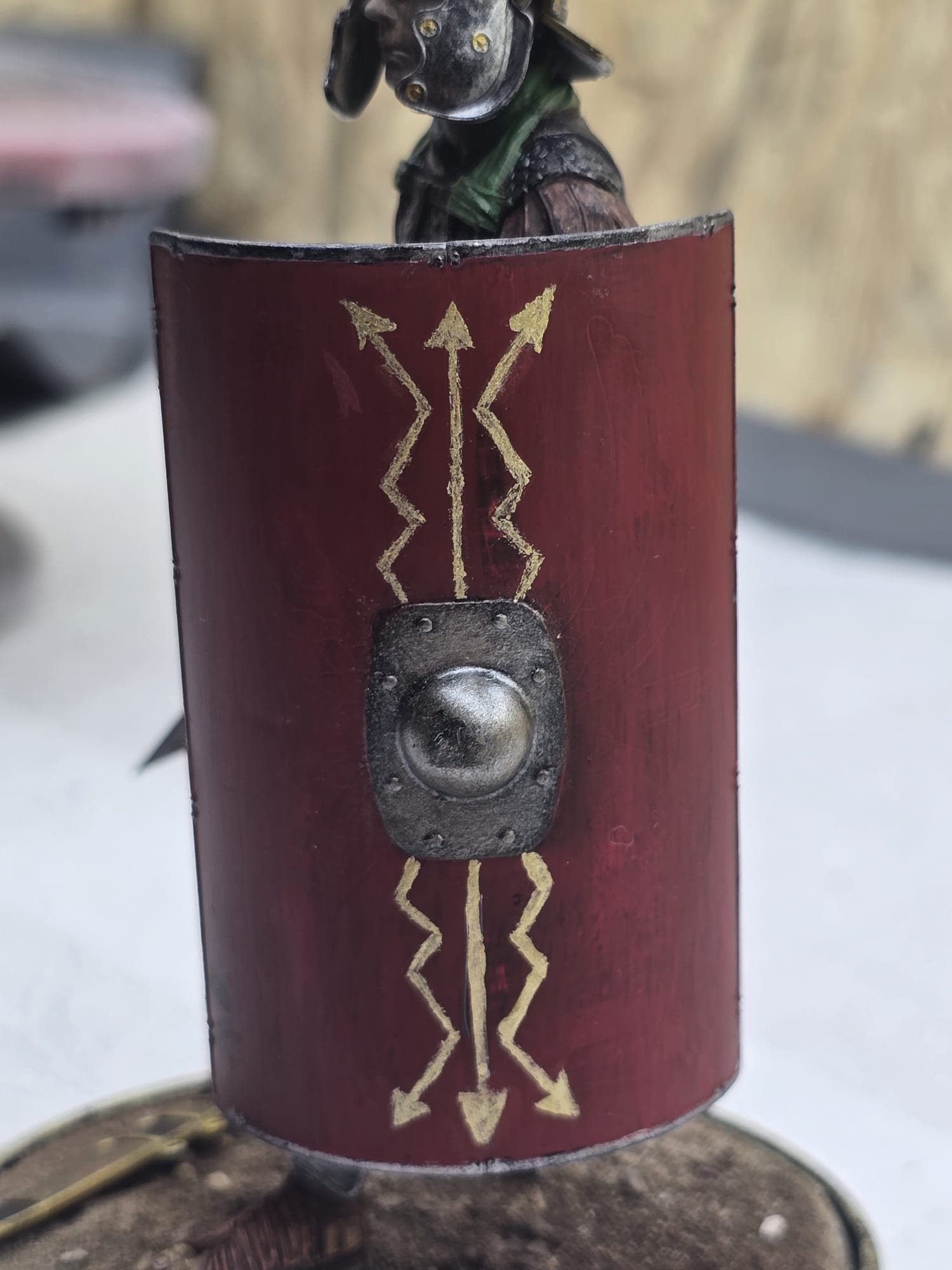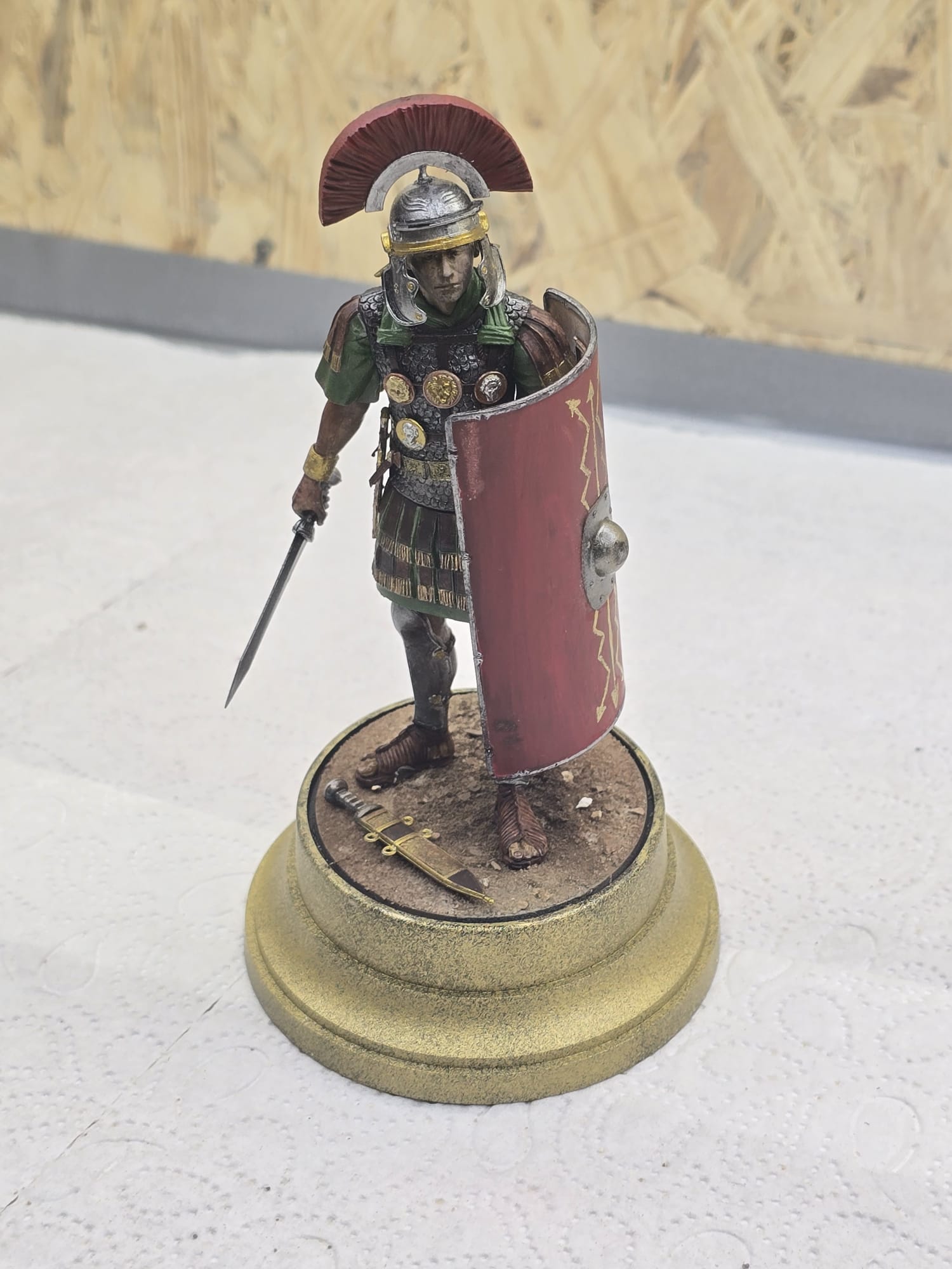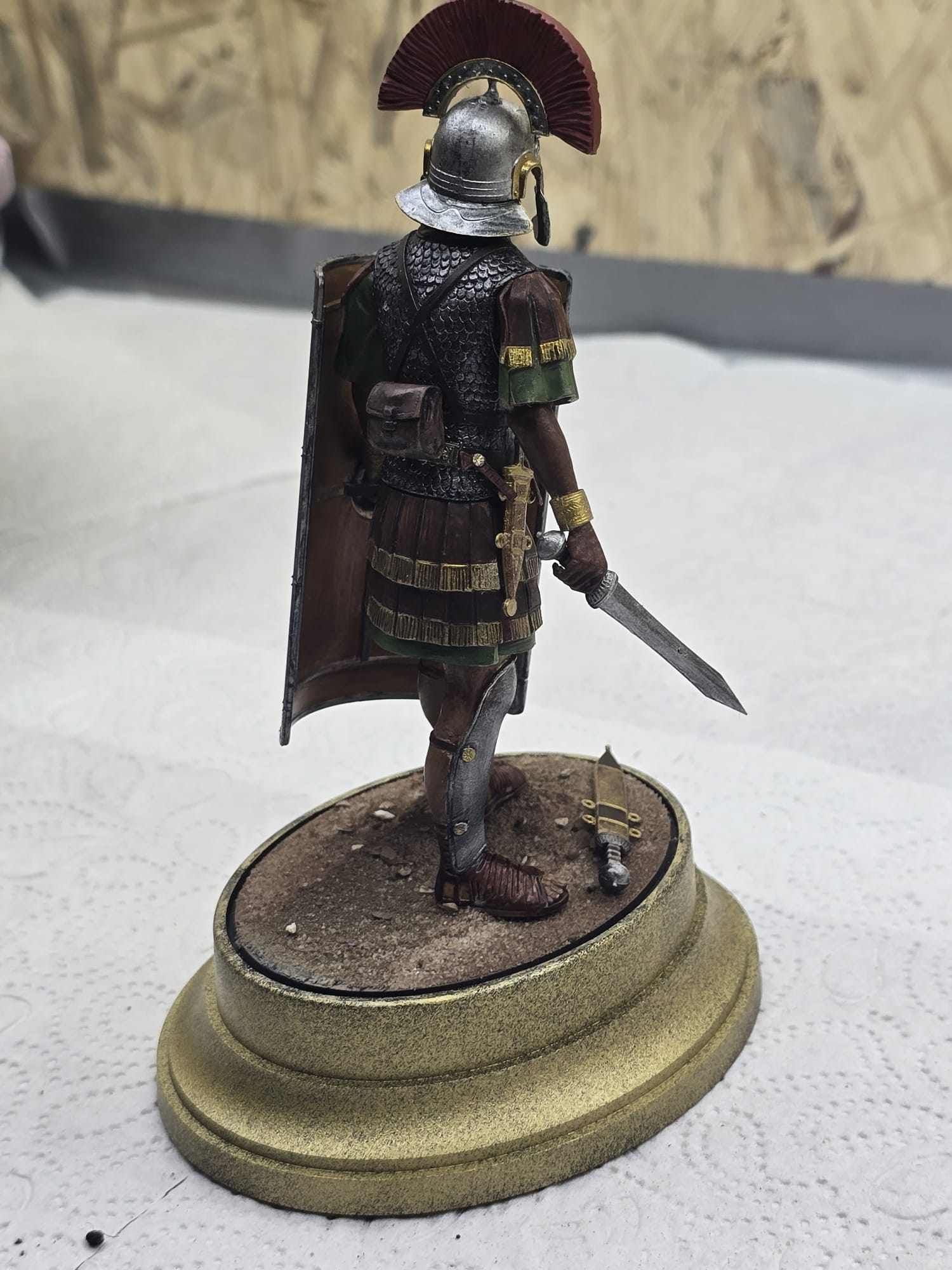 Der Helm und Beinschutz wie auch Schwert sind absichtlich nicht so hochglanzpoliert. Ich bin der Meinung, dass im Feld dazu keine Zeit war. Da wurde gekämpft, gegessen und geschlafen. Darum auch die abgenutze, fleckige Tunika, etc. Der Schild ist handbemalt und die ganze Figur nur mit Pinsel bemalt. Nur der güldene Sockel ist mit der Airbrush gemacht.