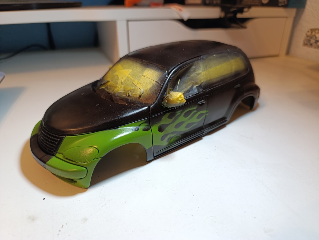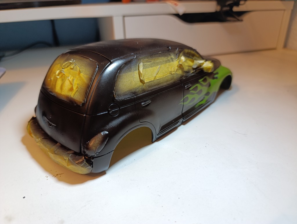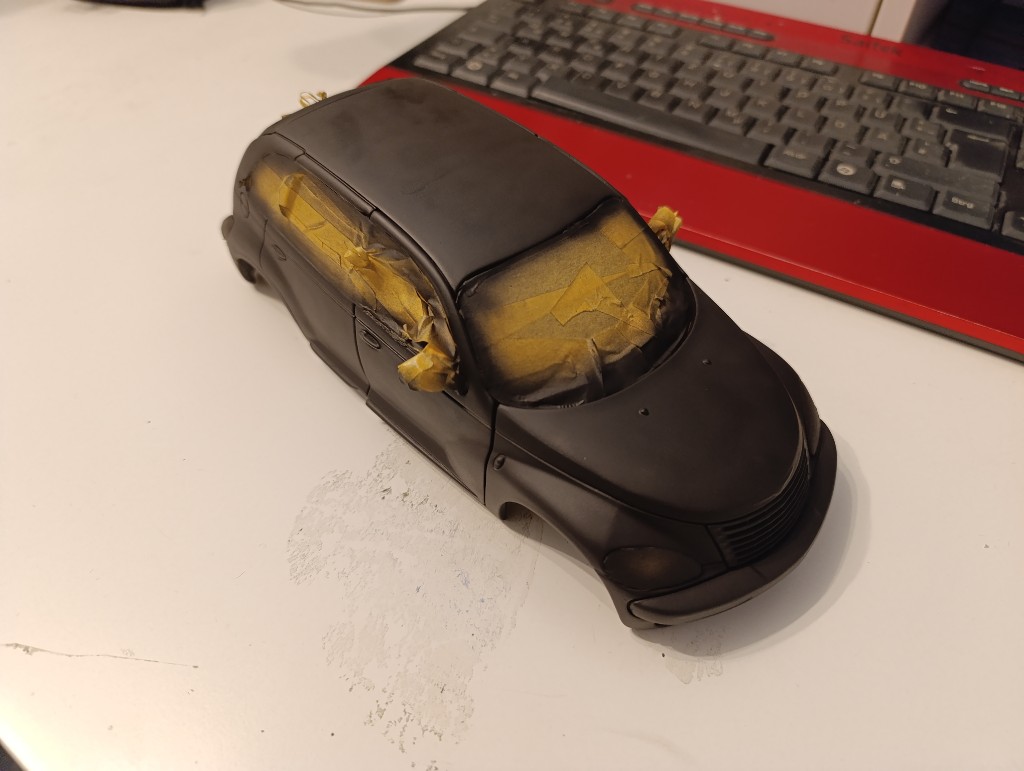 Nachdem ich die Karosserie einfach abgeklebt habe, habe ich.das Fahrzeug komplett schwarz grundiert.