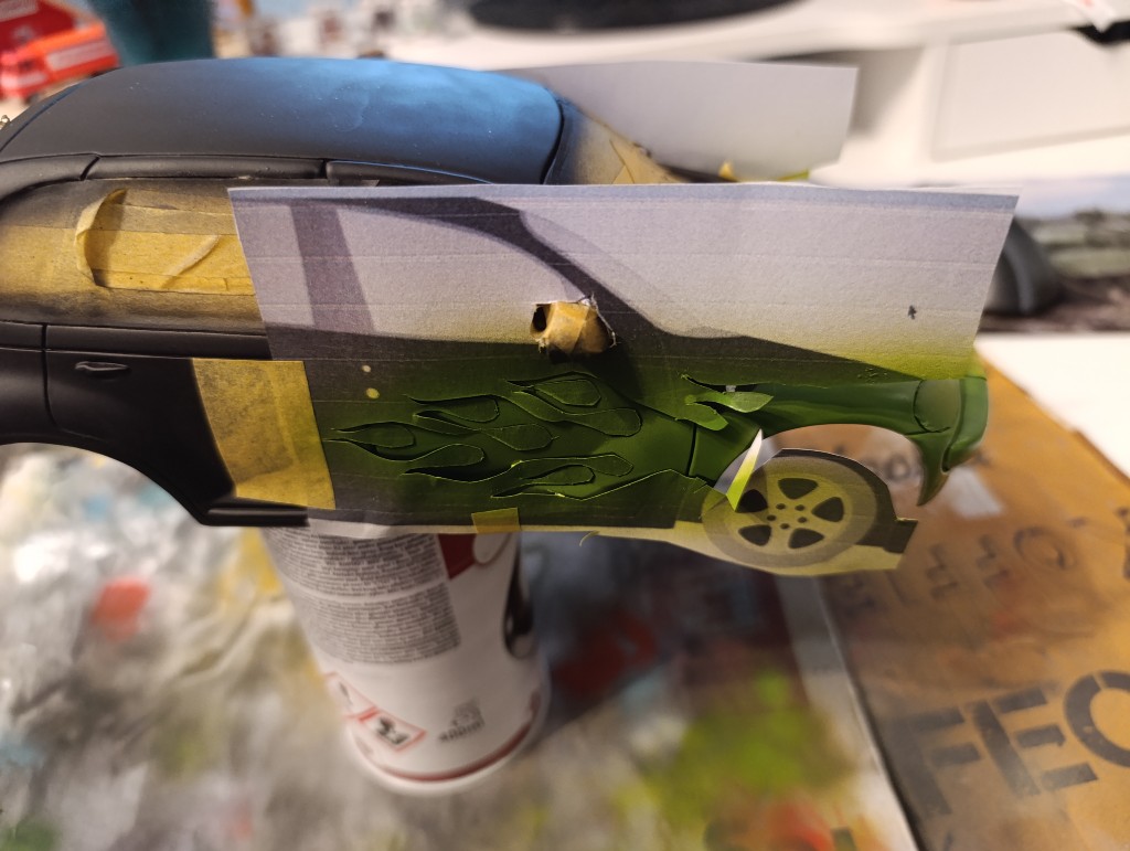 Mittlerweile steht der Wagen bei uns auch in der Garage und ich kann schauen was noch wie lackiert werden sollte, ebenso, welche Farbe die Flammen bekommen müssen.